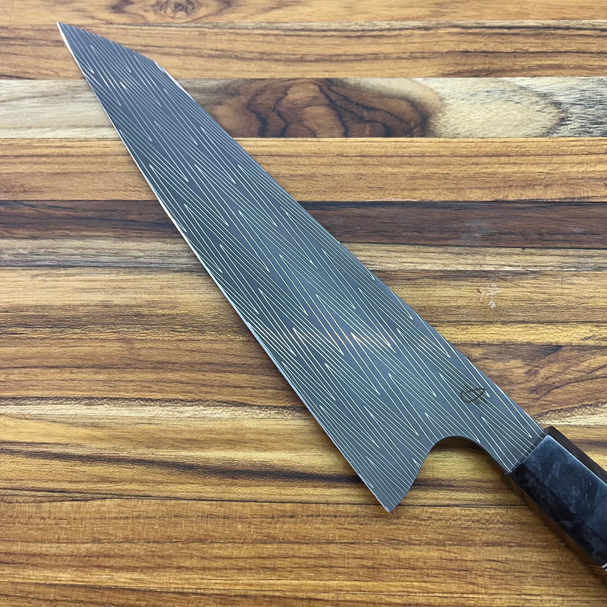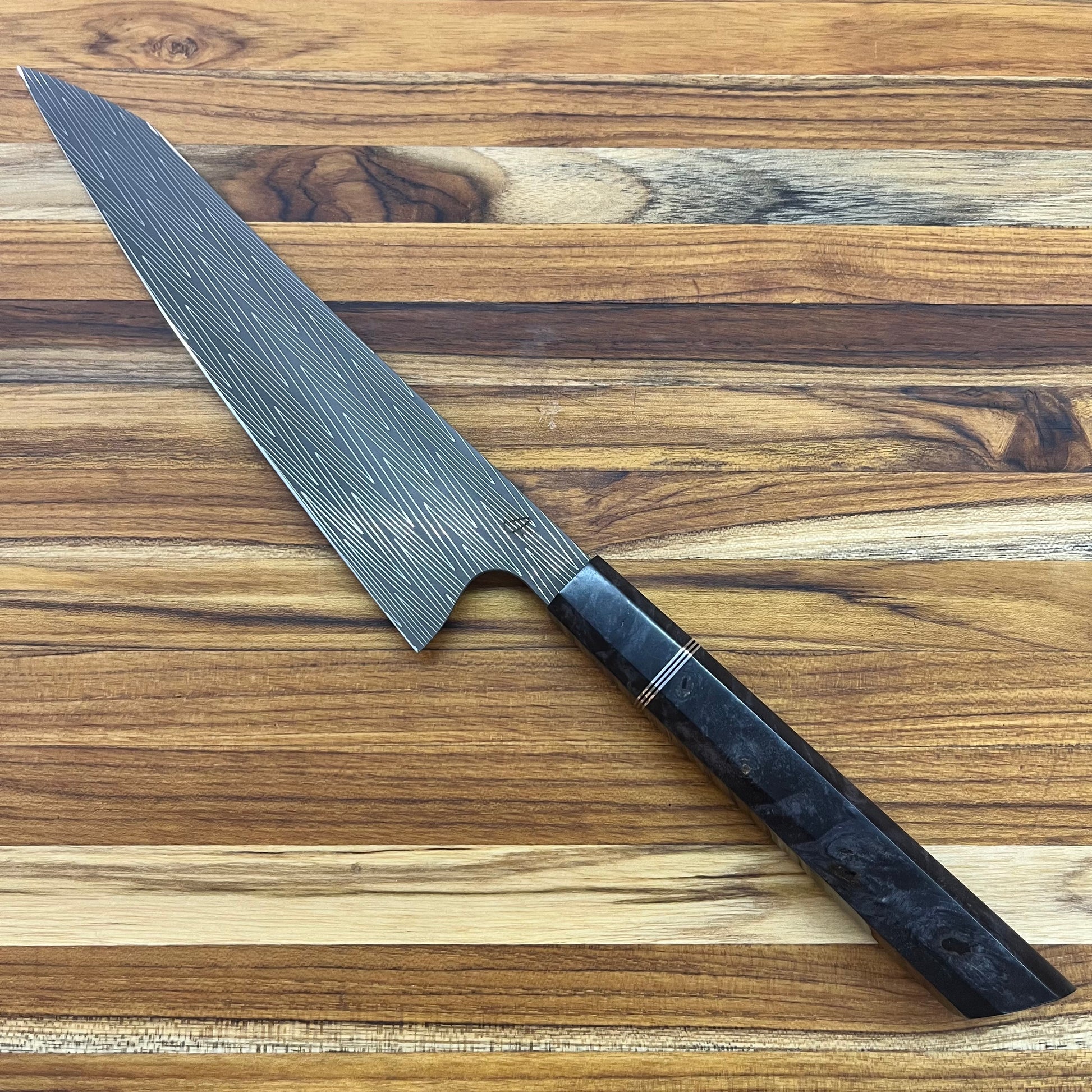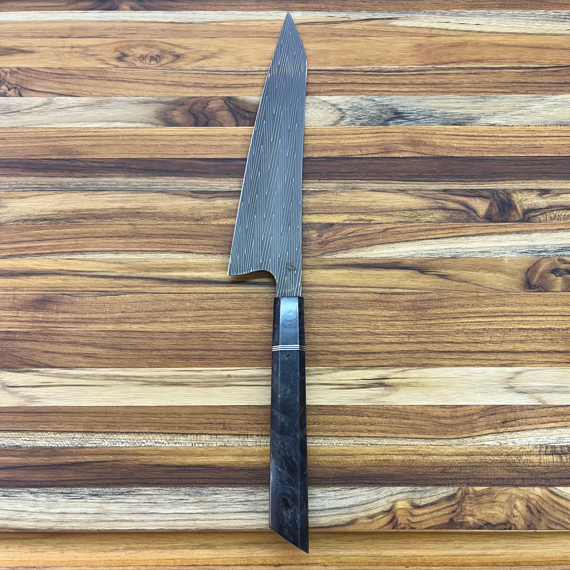 This Alfredo Faccipieri 215mm(8.5") Gyuto is a true showcase of Italian custom knife-making. Crafted from Vegas Forge Lightning Patterned Damascus and a black-stained stabilized Buckeye Burl, this Gyuto is a functional and capable work of art.