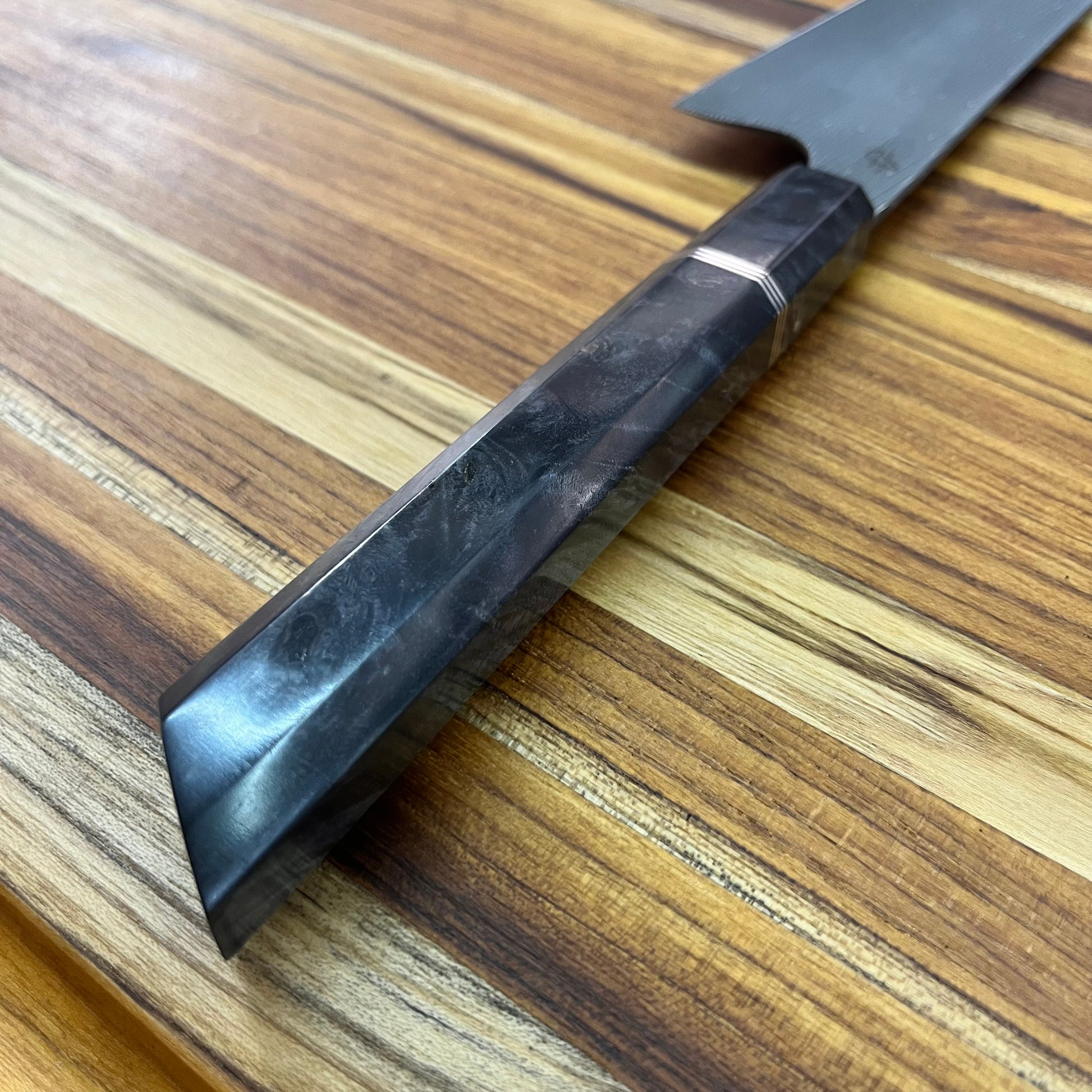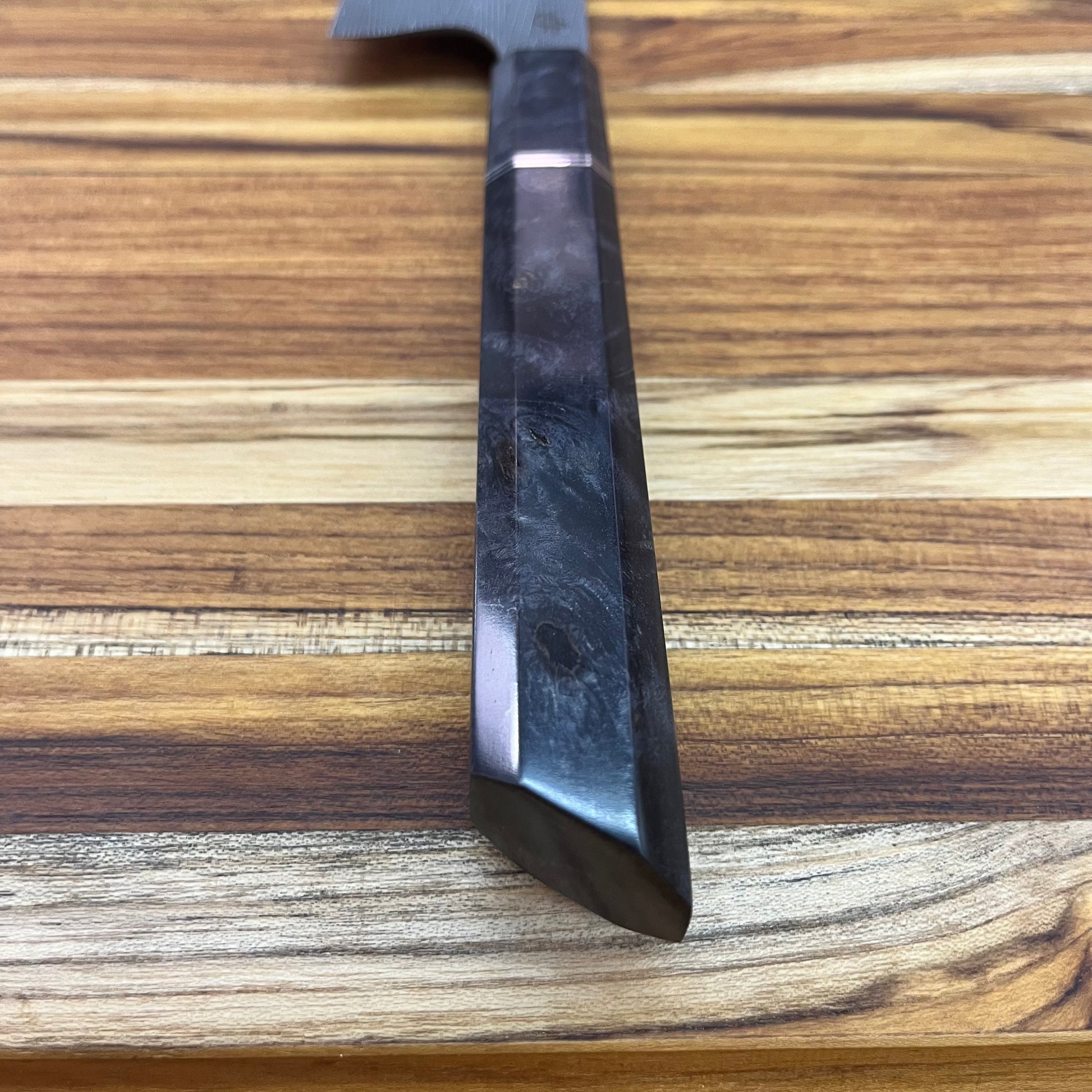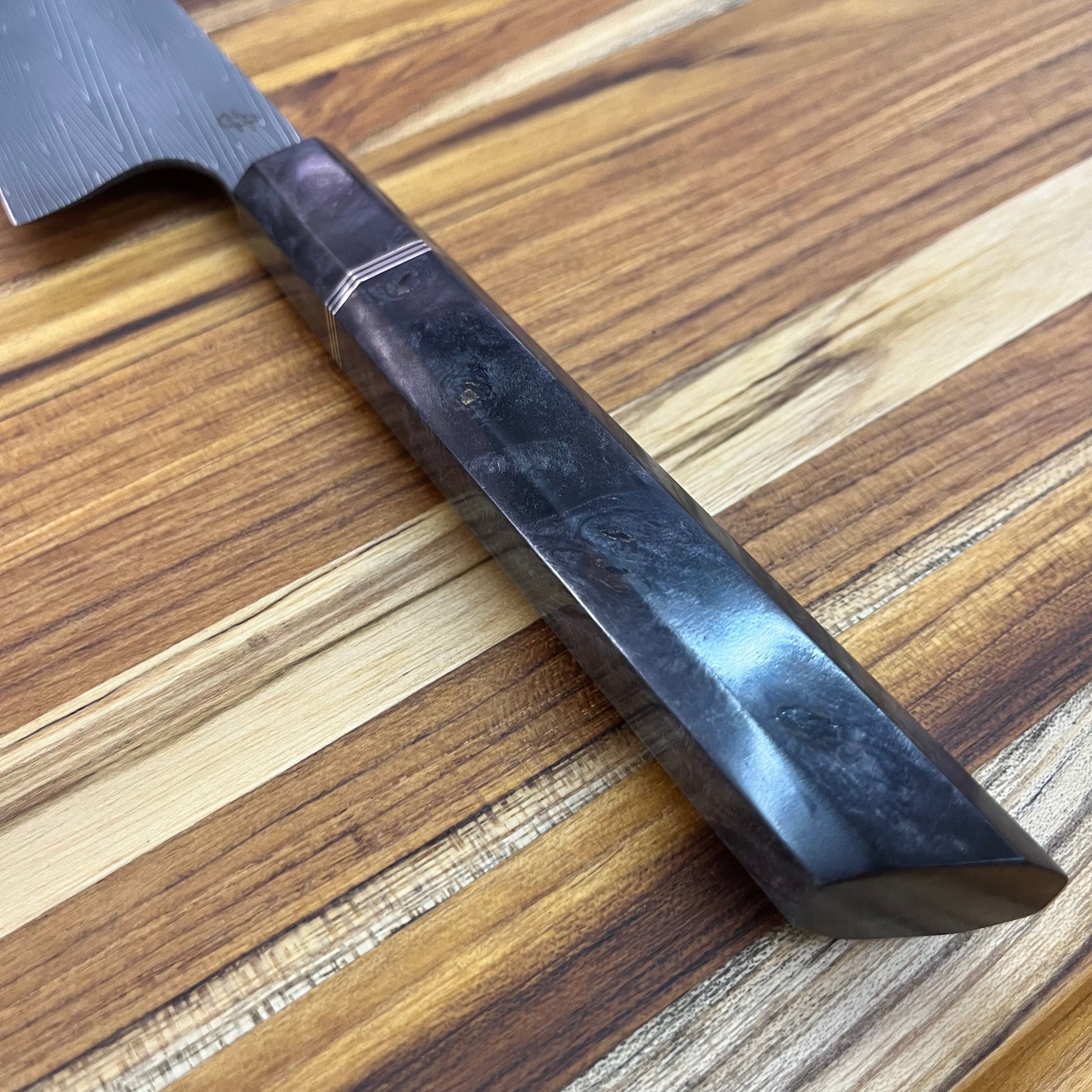 This Alfredo Faccipieri 215mm(8.5") Gyuto is a true showcase of Italian custom knife-making. Crafted from Vegas Forge Lightning Patterned Damascus and a black-stained stabilized Buckeye Burl, this Gyuto is a functional and capable work of art.