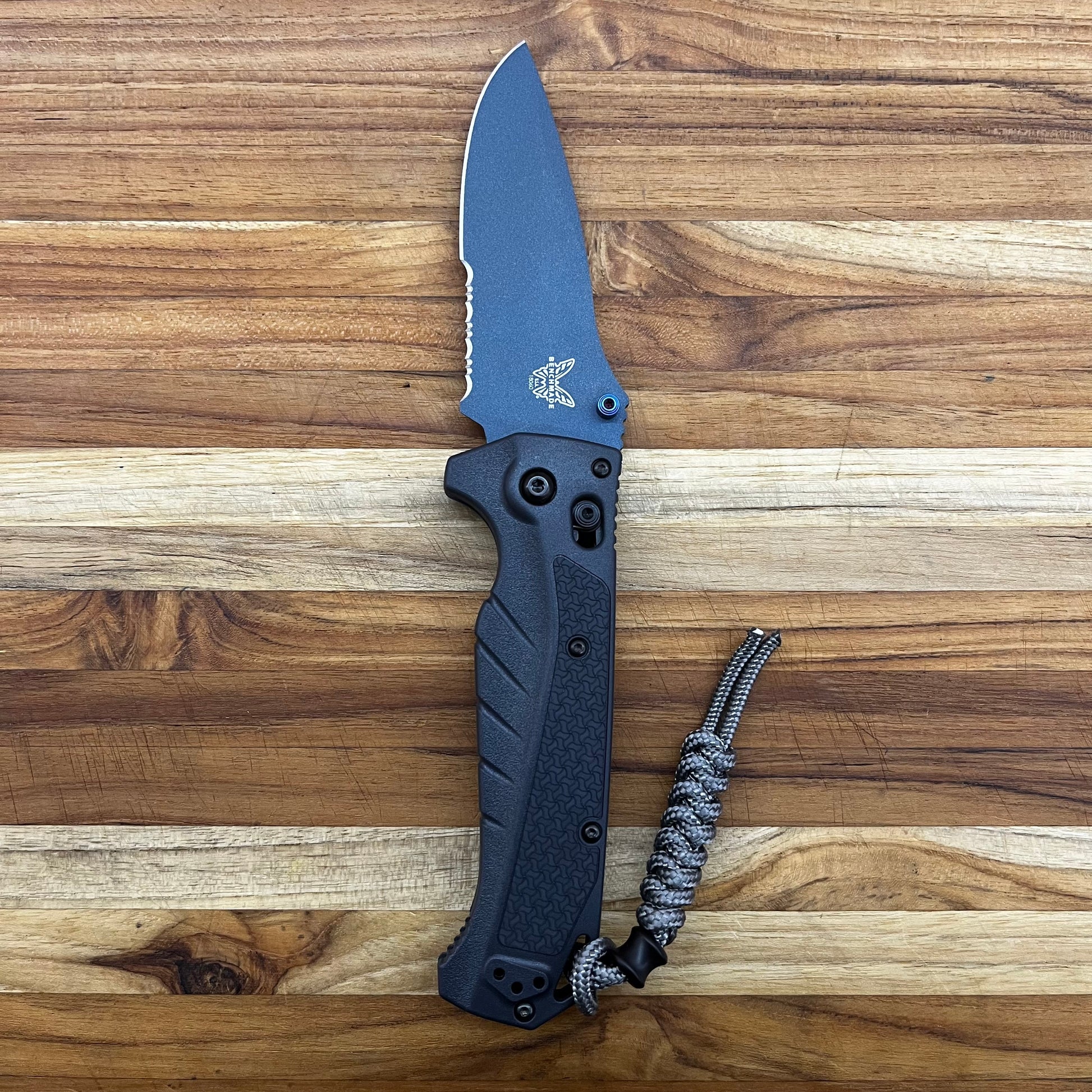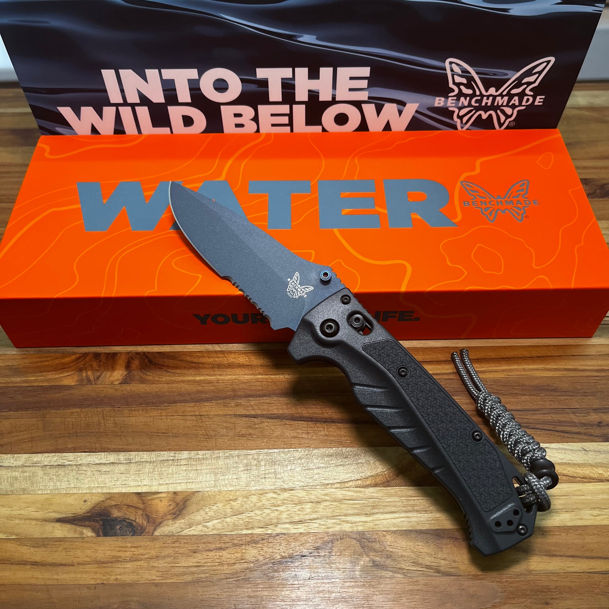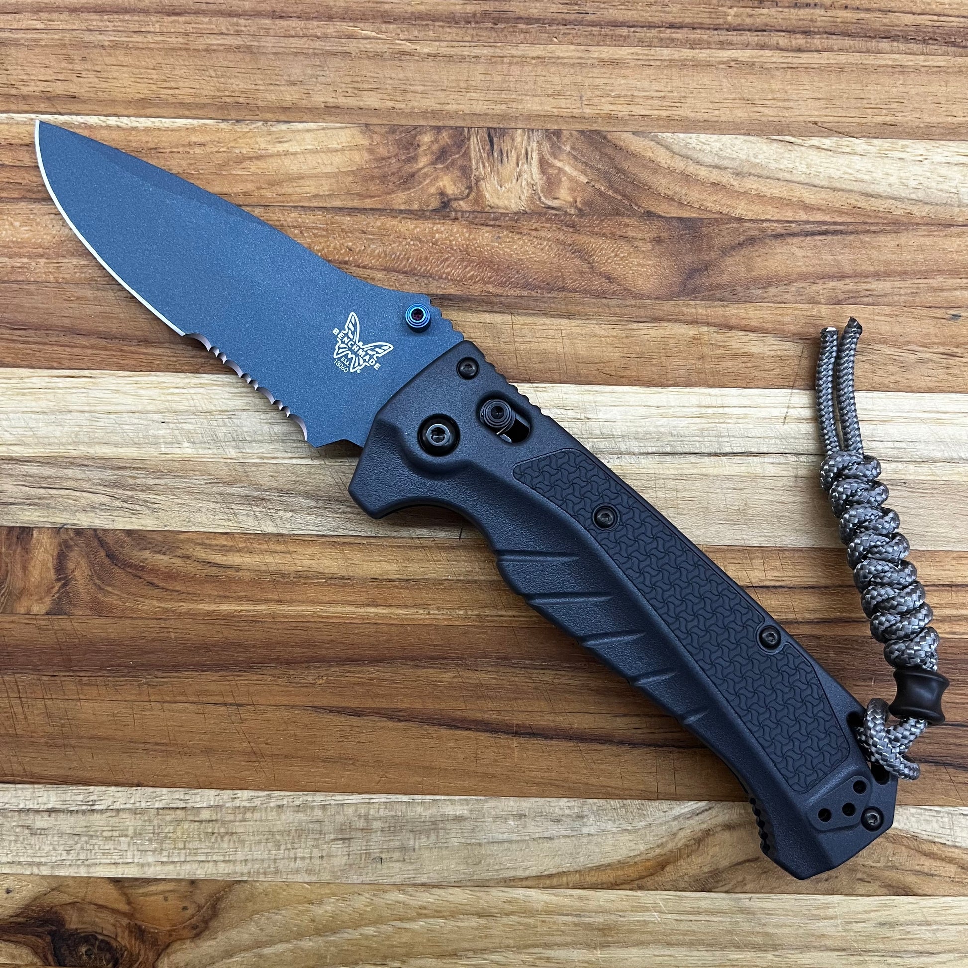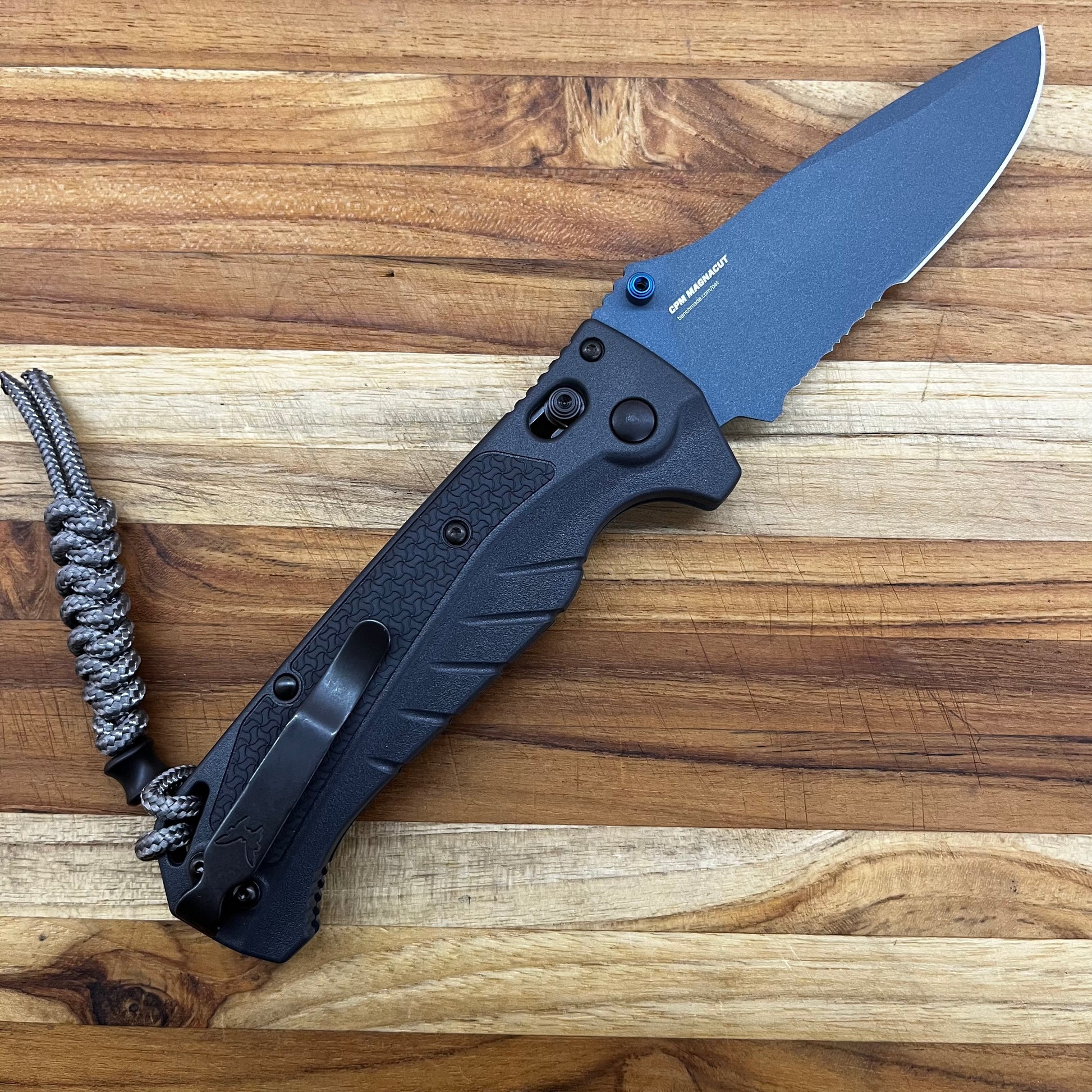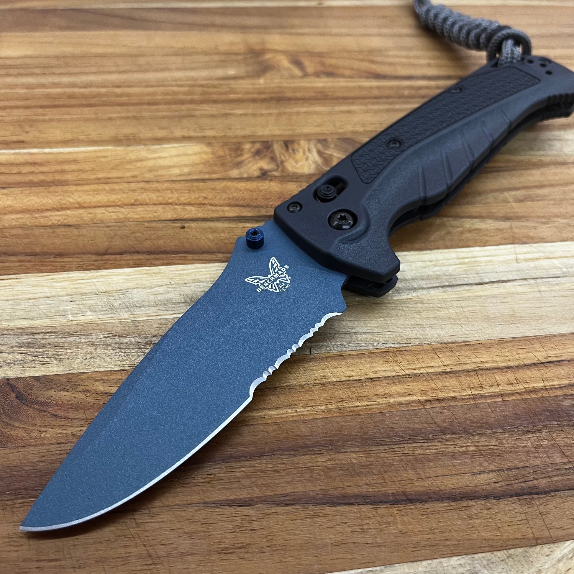 The Benchmade Adira 4” Serrated Folding Knife with Tempest Gray Grivory Handle provides an upgraded version of the original, featuring enhanced serrations that efficiently cut through lines and ropes, especially in wet conditions. This design includes a sleek, understated tempest gray handle made of Grivory, complemented by blue PVD hardware and a gray paracord lanyard. Its full-size, serrated 3.6” drop-point blade is crafted from CPM-MagnaCut stainless steel and boasts a stylish Cerakote Blue finish. A must-have for serious anglers, now available with serrated capabilities.