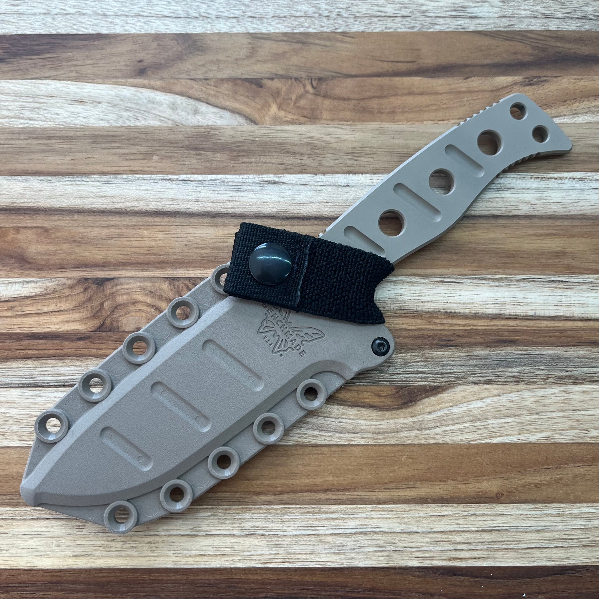 Experience unparalleled durability and precision with the Benchmade Adamas fixed blade combat knife, expertly designed by Shane Sibert to deliver maximum performance. Featuring a D2 steel drop point blade with a plain cutting edge and jimping on the spine, this knife is built for optimal function. The skeletonized handle boasts strategically placed grooves for enhanced grip, and the tan molded sheath completes the package with a secondary locking strap and tension screw for secure storage and smooth deployment.