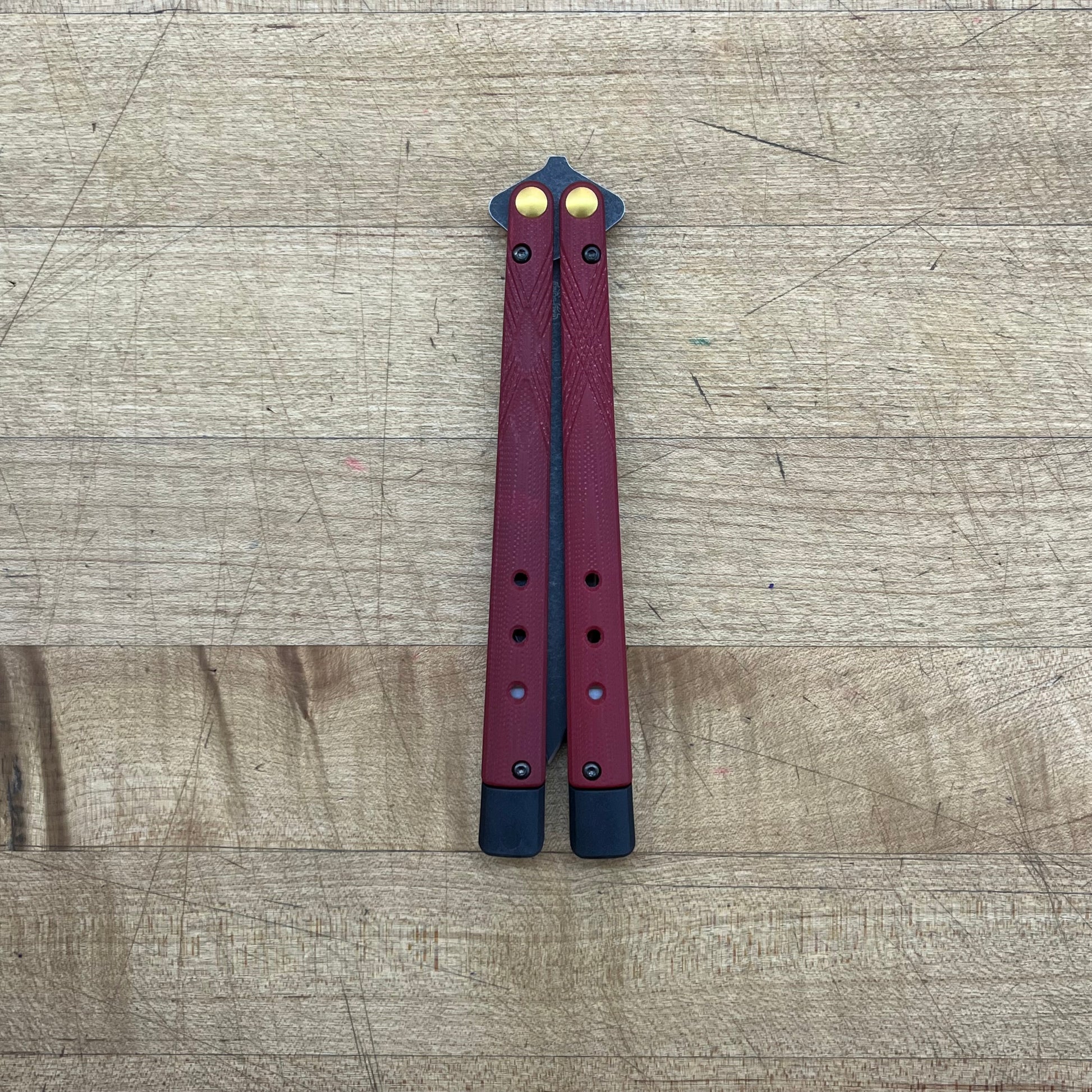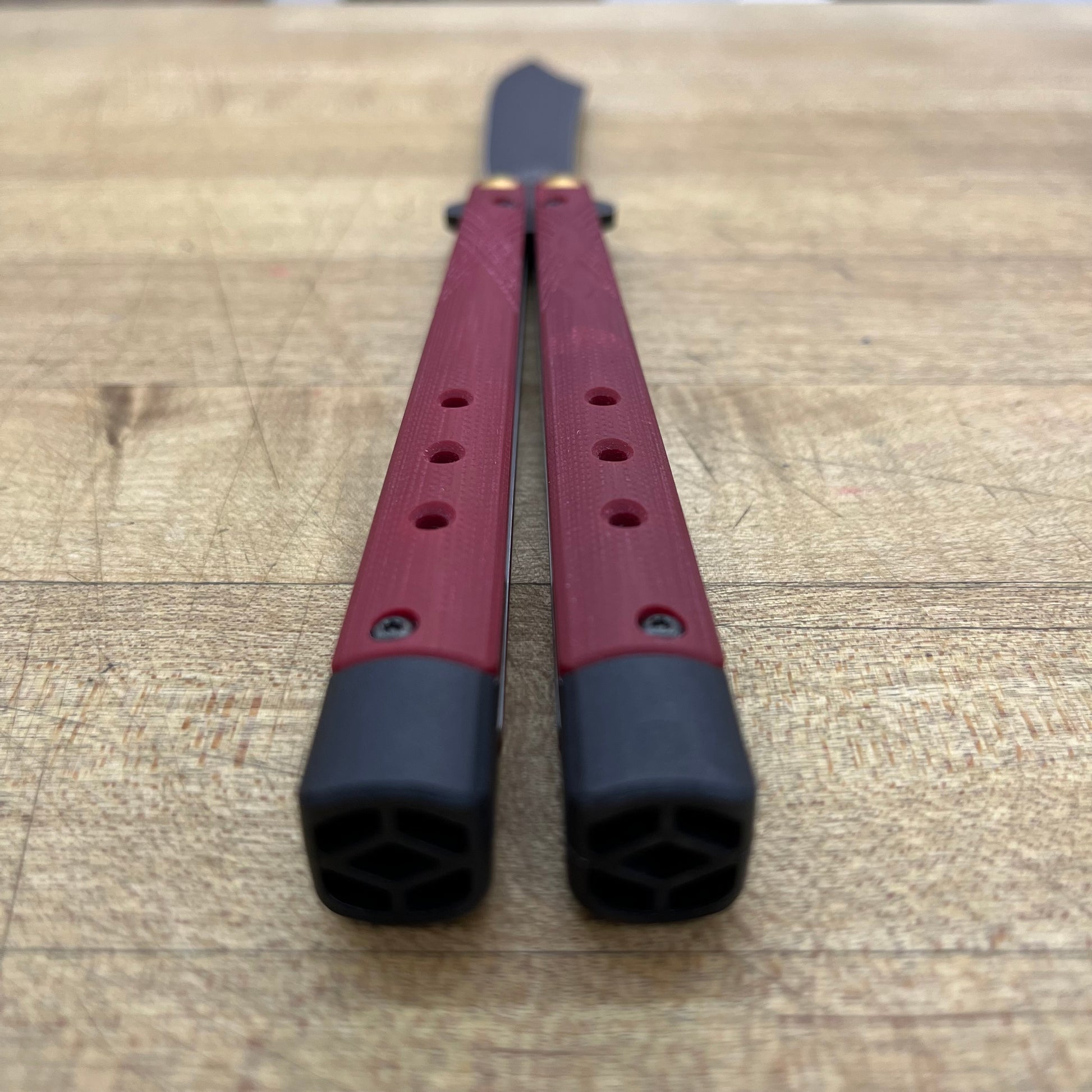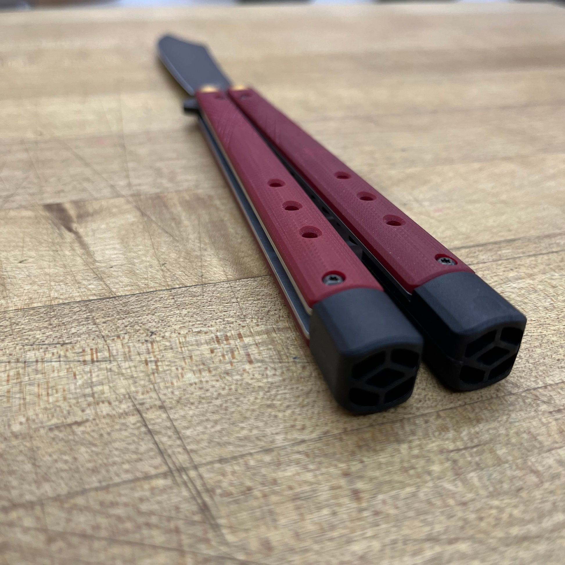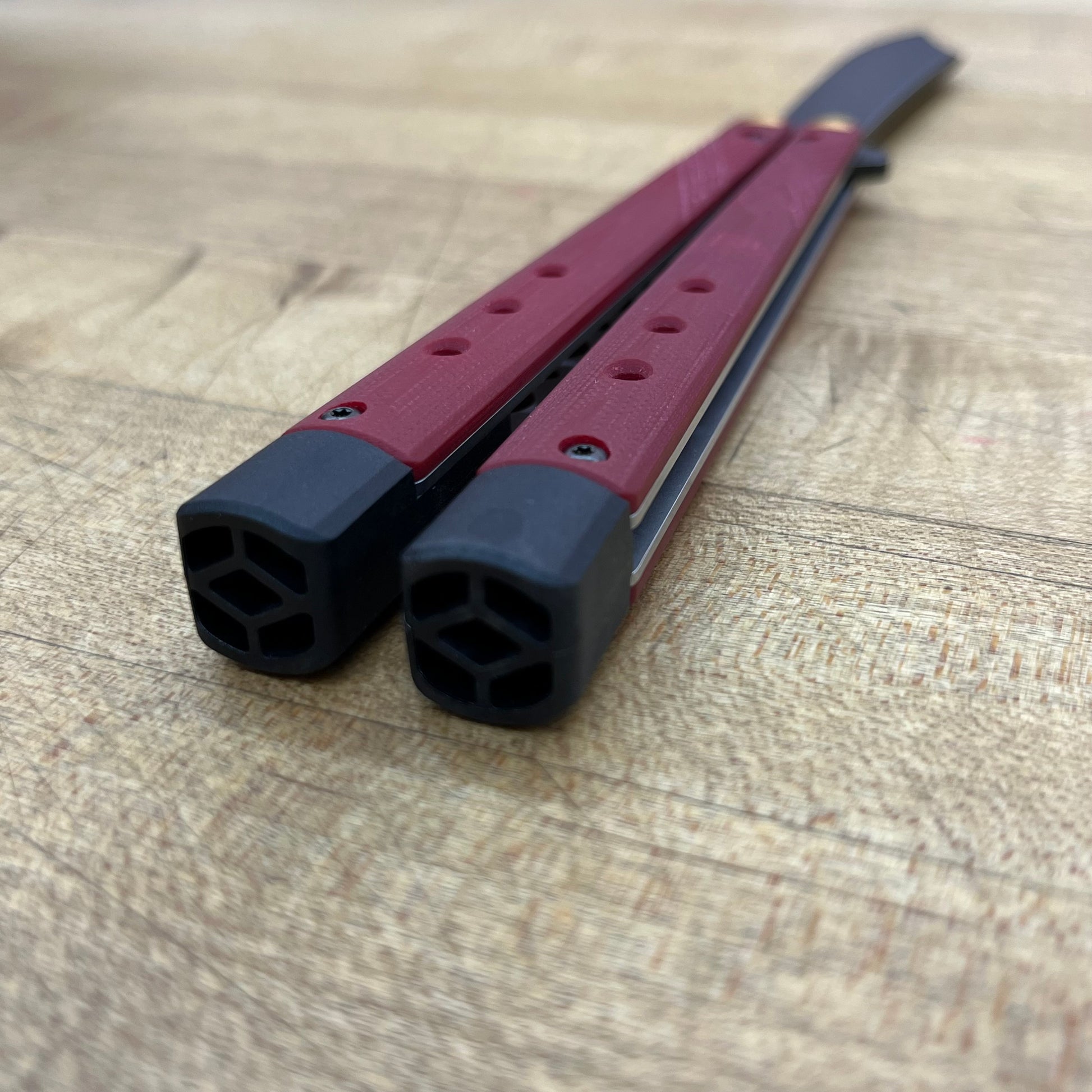 Ruby Red G10 w/ user adjustable and removable tungsten weights and handle extensions |