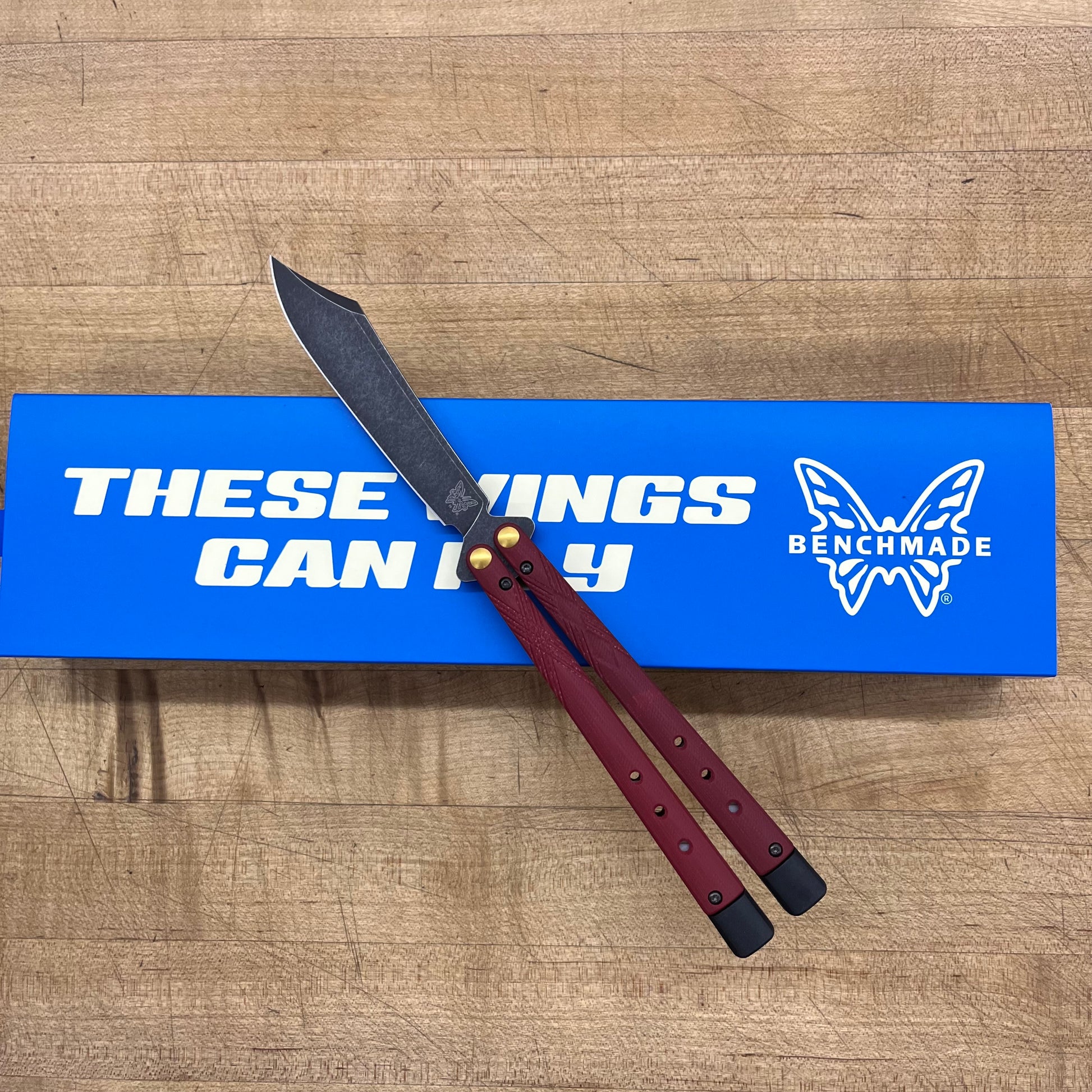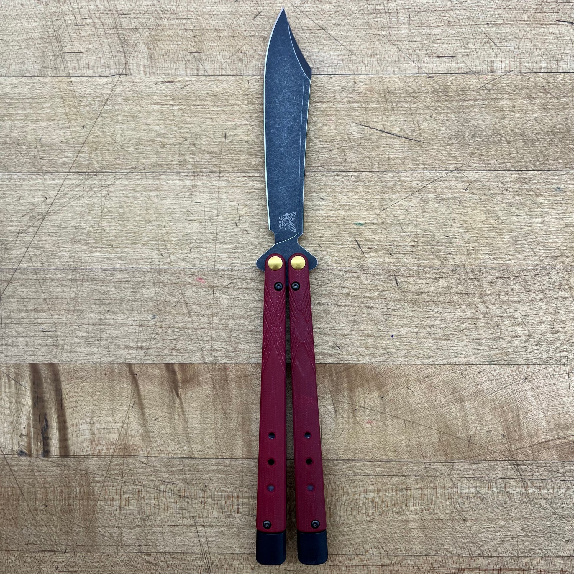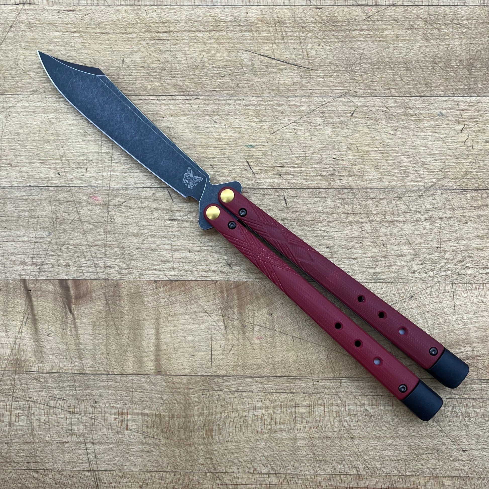The 99BK-1 Necron is a precision-engineered butterfly knife designed for advanced flippers, featuring two customizable models that honor Benchmade’s classic Bali-Song design while incorporating enhanced functionality. It boasts latchless Jade or Ruby Red G10 handles, a CPM-S30V Scimitar blade, and finely balanced tungsten weights, with extendable handles to tailor the knife’s feel and speed. A hollow diamond texture on the safe handle provides tactile feedback, distinguishing it from the bite handle, while a trainer version helps users refine their skills.
