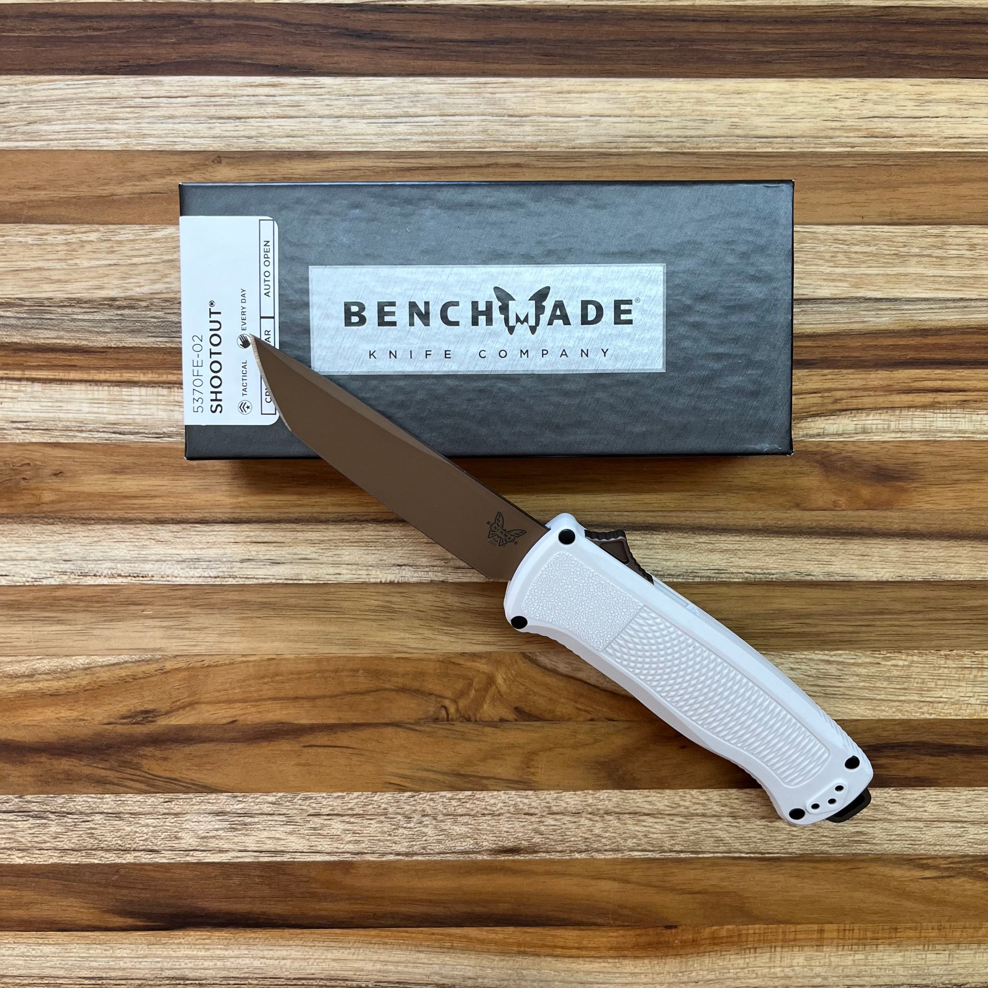 Discover the cutting-edge technology of Benchmade's Shootout 3.5" OTF featuring a Cool Gray Grivory handle. Embraced for its outstanding durability, the 5370FE-02 model maintains its strength while showcasing a modern handle design and a lanyard pommel. The Flat Dark Earth CPM-CruWear blade and spine-fired release enable lightning-fast double-action out-the-front automatic deployment. Secure this essential addition to your knife collection today.