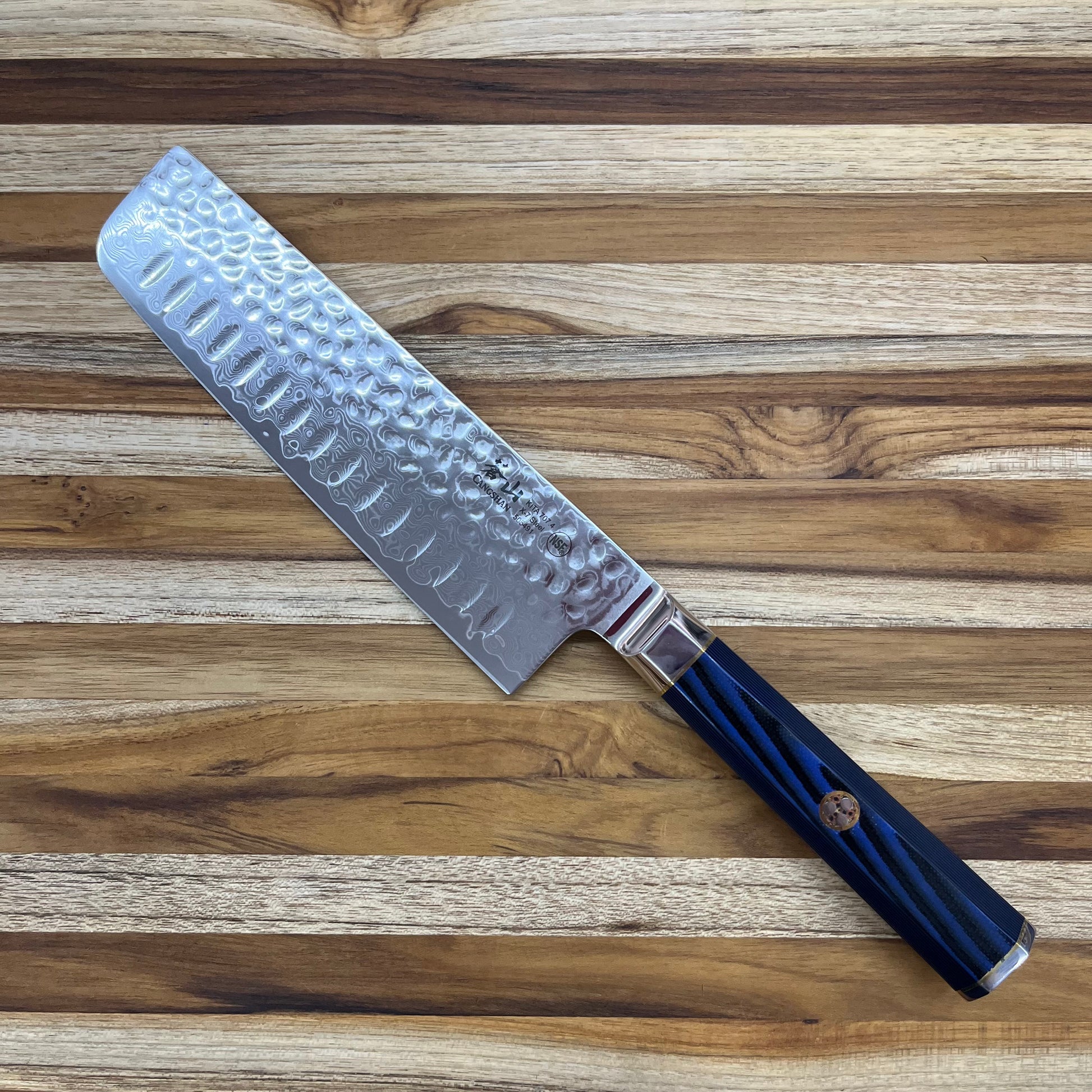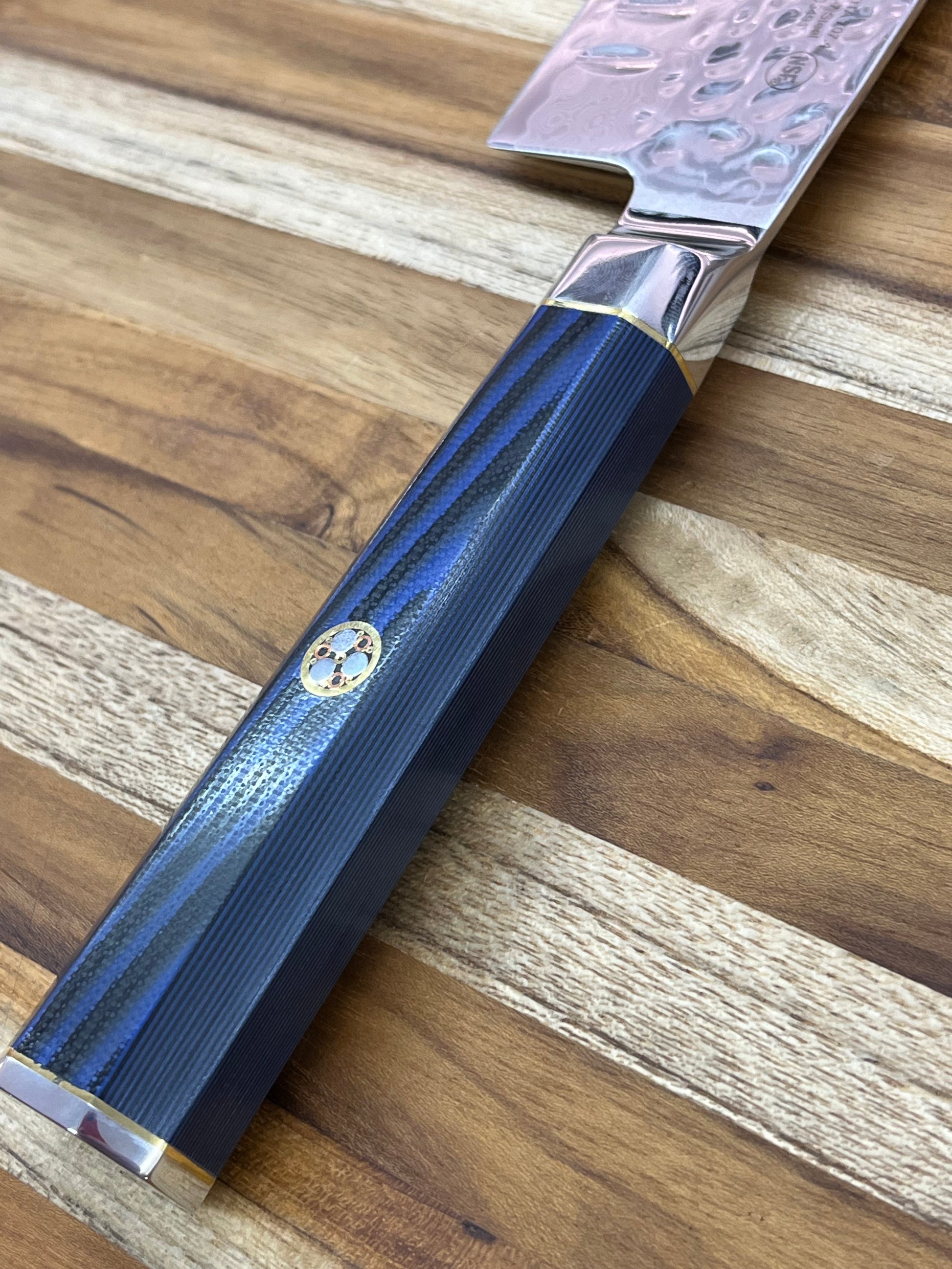 The Cangshan Kita Series brings precision and elegance to any kitchen setting. Its full-tang X-7 Damascus steel blade features a hammered texture that not only provides a striking appearance but also facilitates smooth, reliable food release for clean cuts. The durable octagonal handle showcases a refined blue and black faux wood grain design, secured with a single mosaic rivet to ensure optimal balance and strength. This knife includes a deep blue wooden magnetic saya sheath, specifically crafted to protect its distinctive blade. Hand-sharpened from proprietary X-7 steel with a Rockwell hardness of 60 ± 2, it delivers exceptional sharpness and durability.