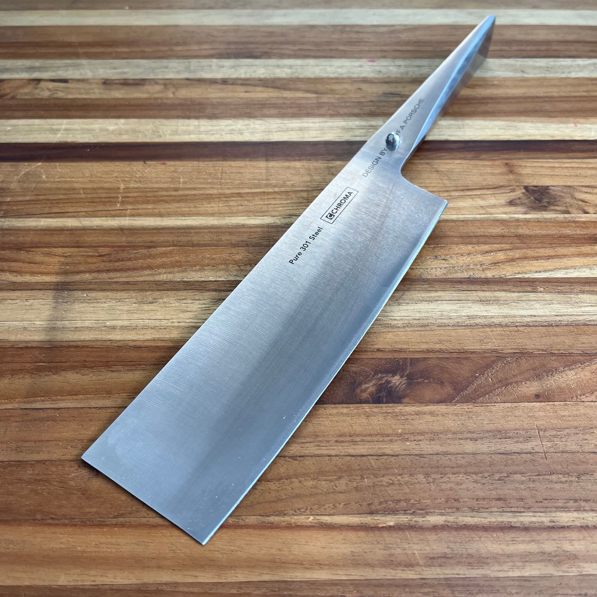 The Chroma Type 301 Series boasts an ergonomic handle crafted by F.A. Porsche, with a metal pearl marking the handle's end to enhance cutting control. It features a seamless, hygienic transition between blade and handle. These knives are ground using a unique technique so that the blade maintains its sharpness longer and is simpler to sharpen.