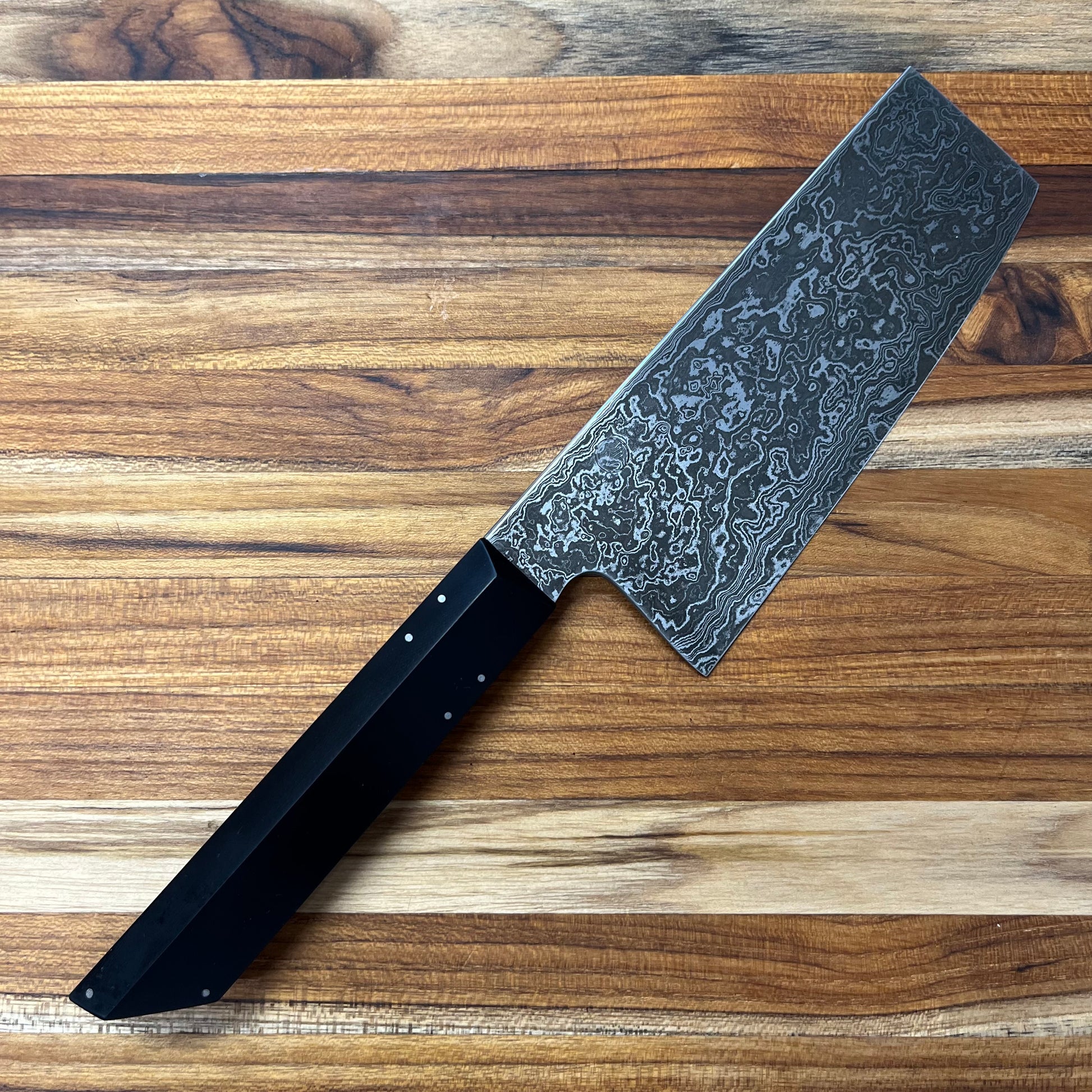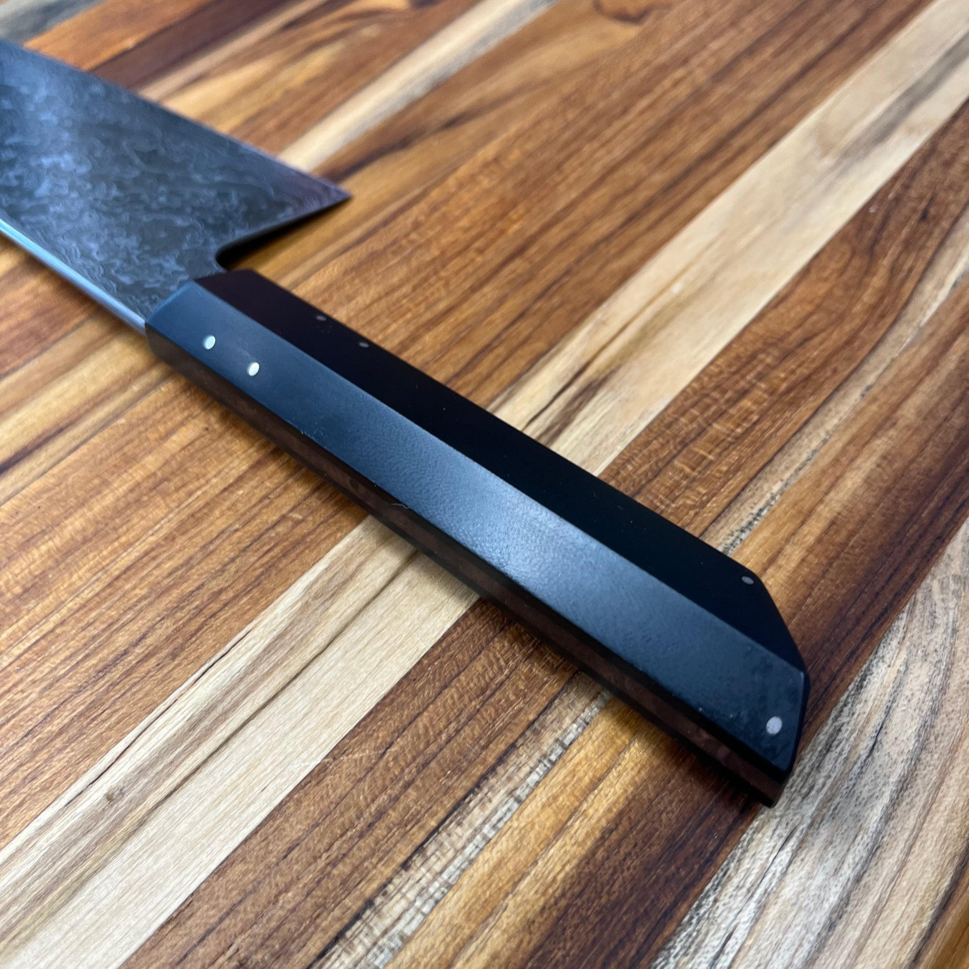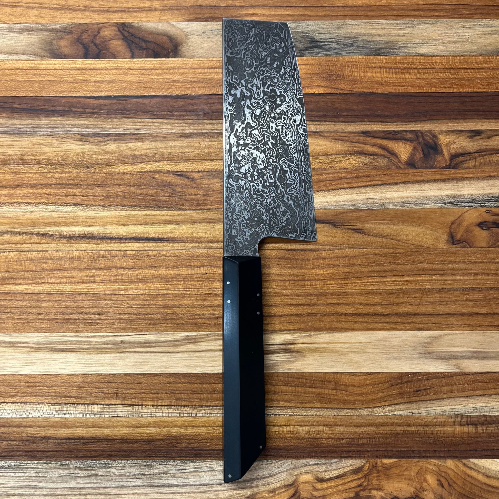 This beautiful, carbon steel nakiri/ko-nakiri is the perfect blend of functionality and artistry. The framed walnut handle with G10 scales fits nicely into the hand and provides an excellent grip and balance to the knife.