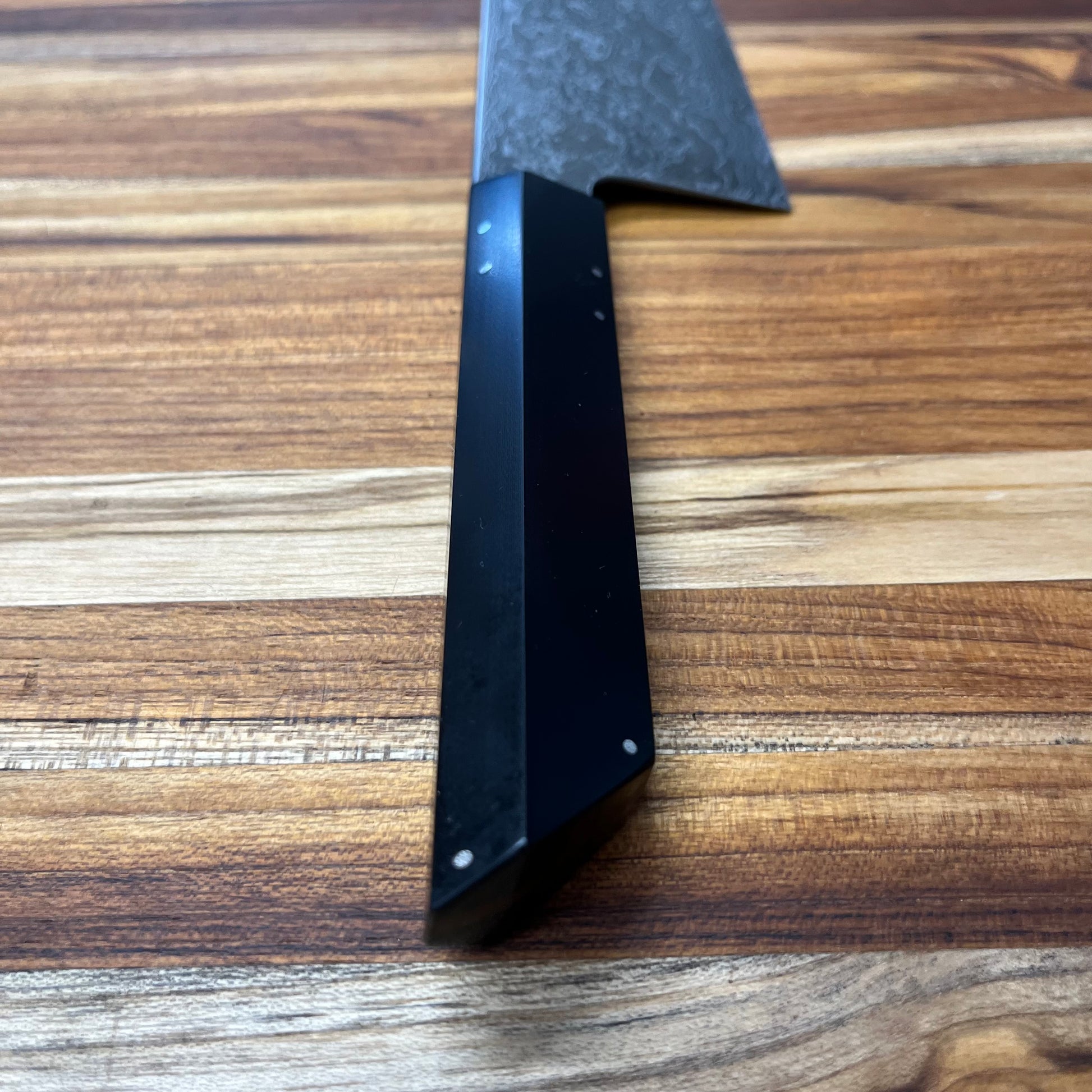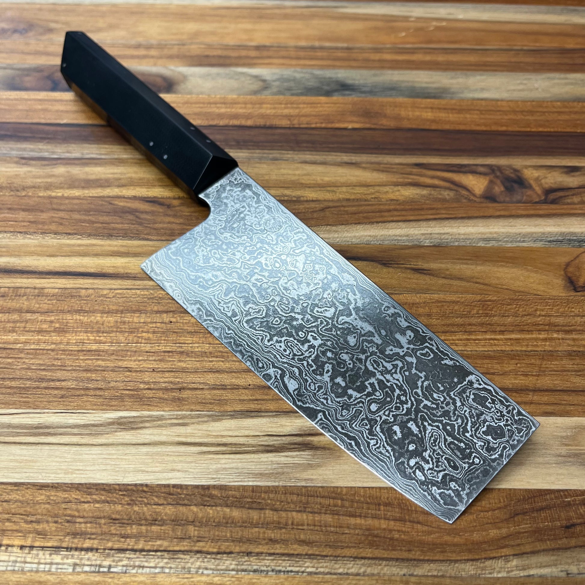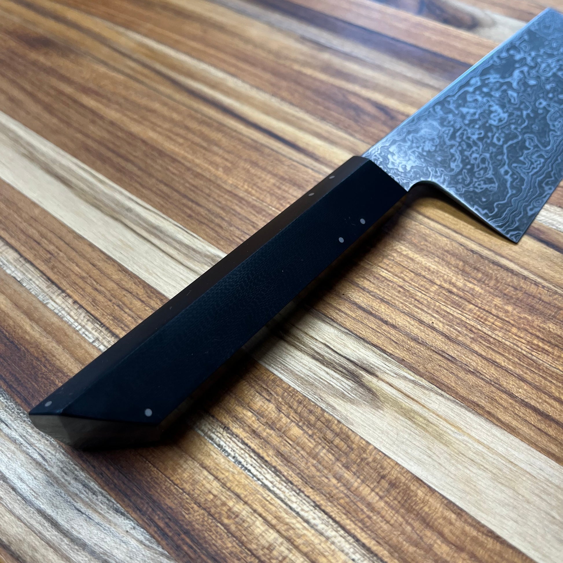 This beautiful, carbon steel nakiri/ko-nakiri is the perfect blend of functionality and artistry. The framed walnut handle with G10 scales fits nicely into the hand and provides an excellent grip and balance to the knife.