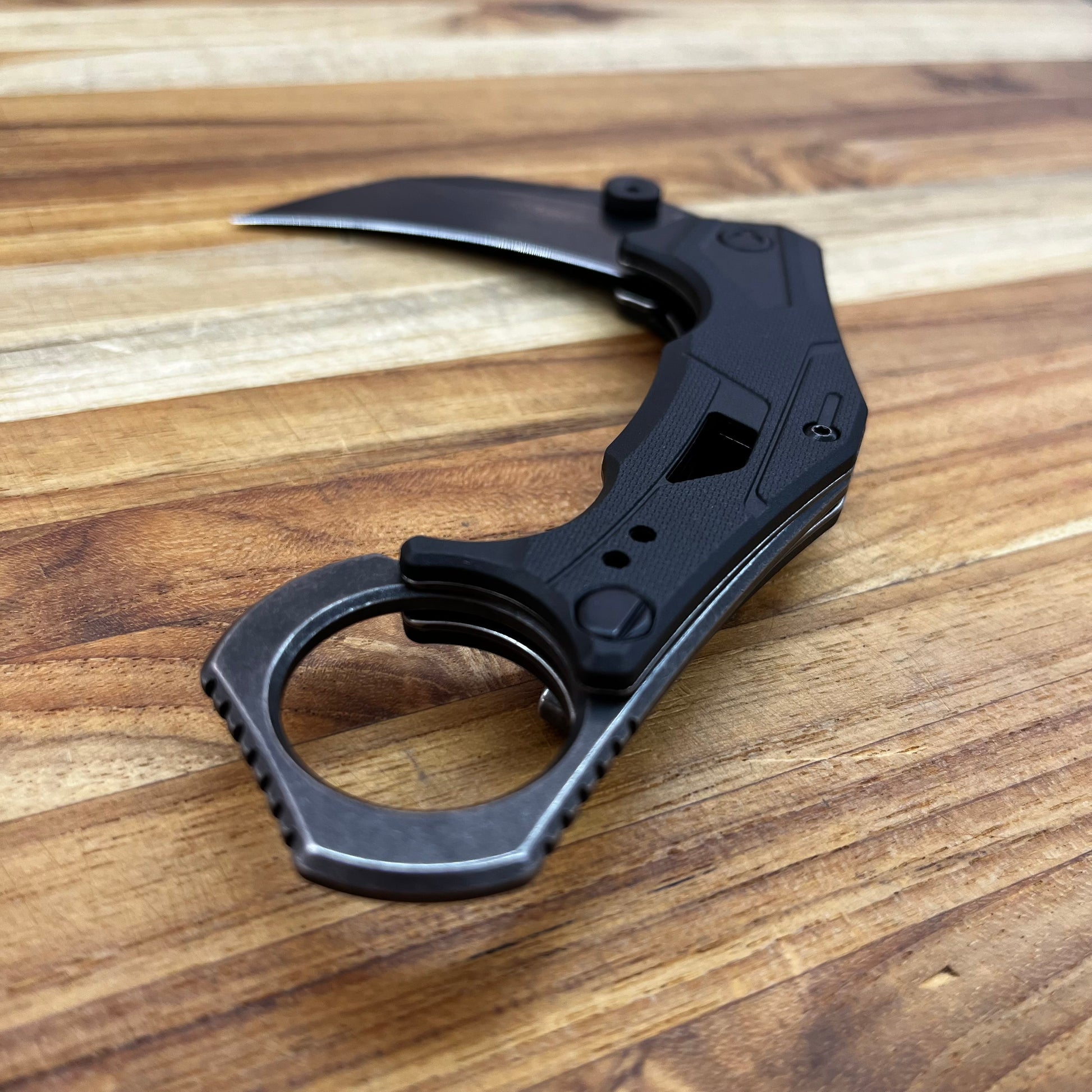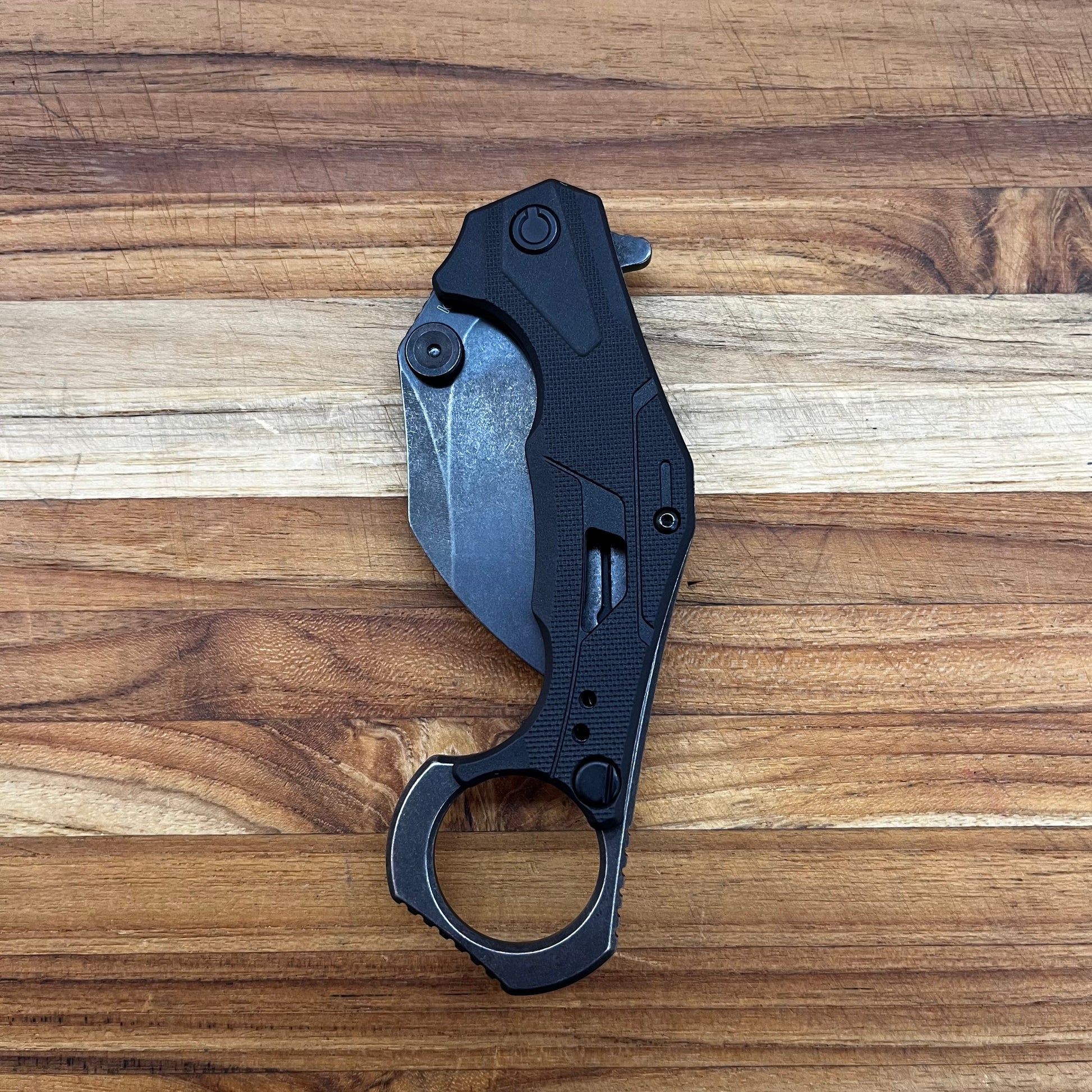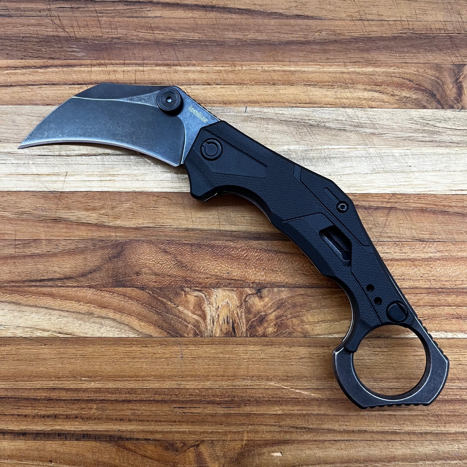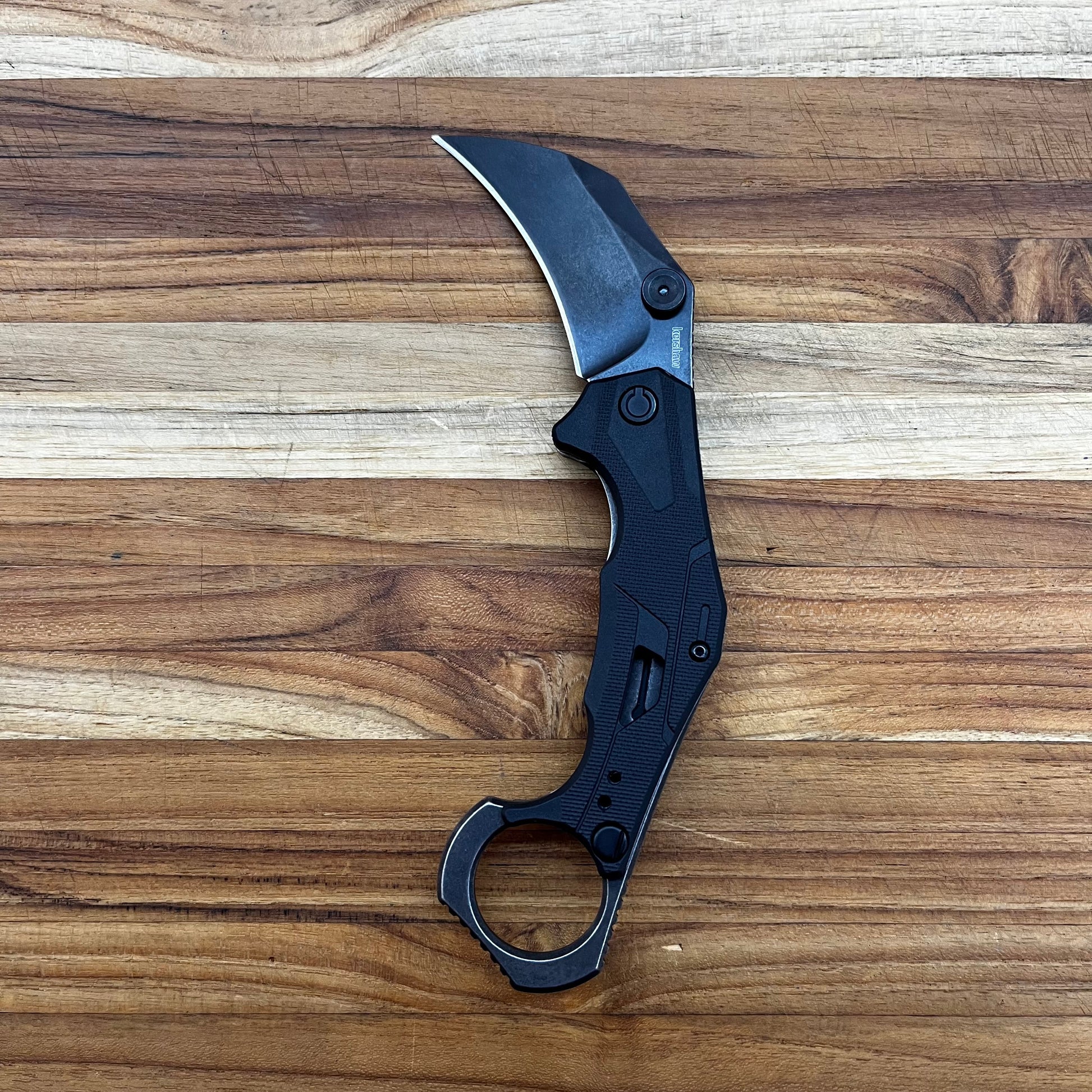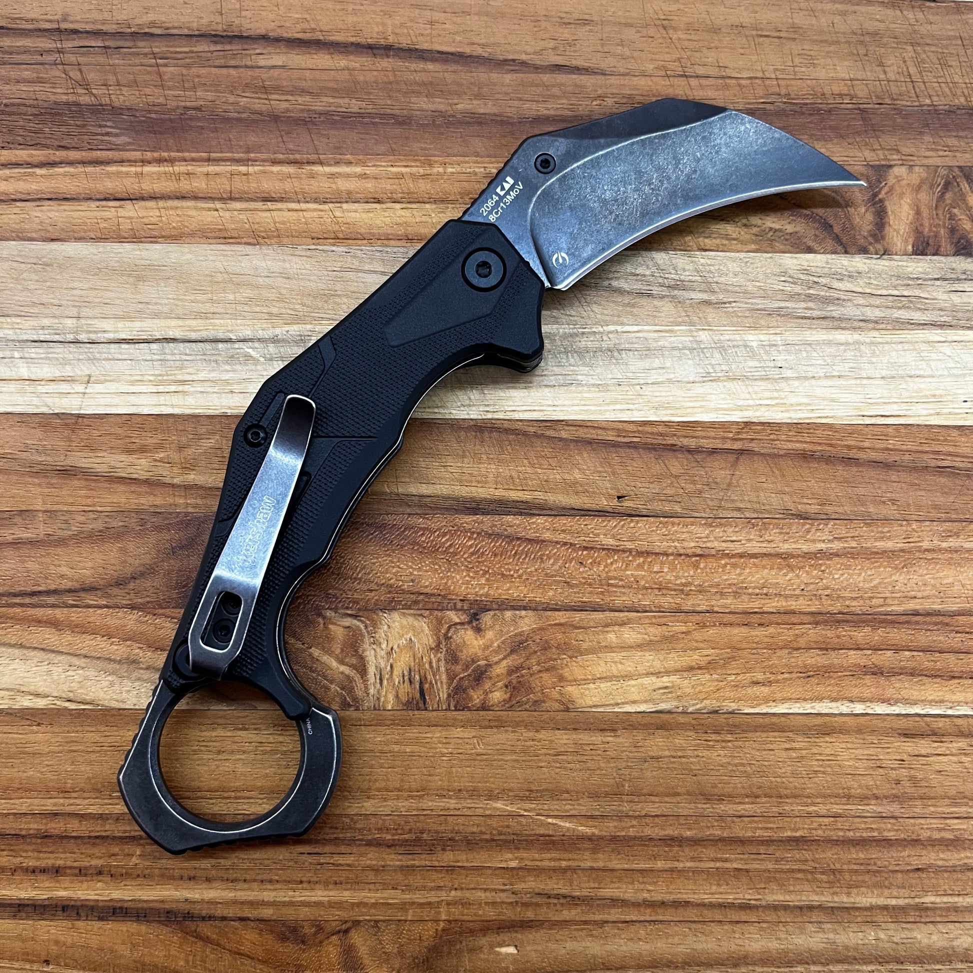 Unleash your inner tactical expert with the Kershaw Outlier Karambit blade. Its versatile steel backspacer features jimping for a secure grip, whether you use the ring or not. And with its unique blade shape, the Outlier is not only practical for cutting tasks, but also adds a tactical flair. The flipper or thumb stud, paired with Kershaw's assisted opening mechanism, makes for a lightning-fast draw. Plus, the BlackWash™ finish on the blade and steel ring adds to its rugged appearance. The Outlier 2.5" All Black Karambit is the ultimate combination of speed and style.