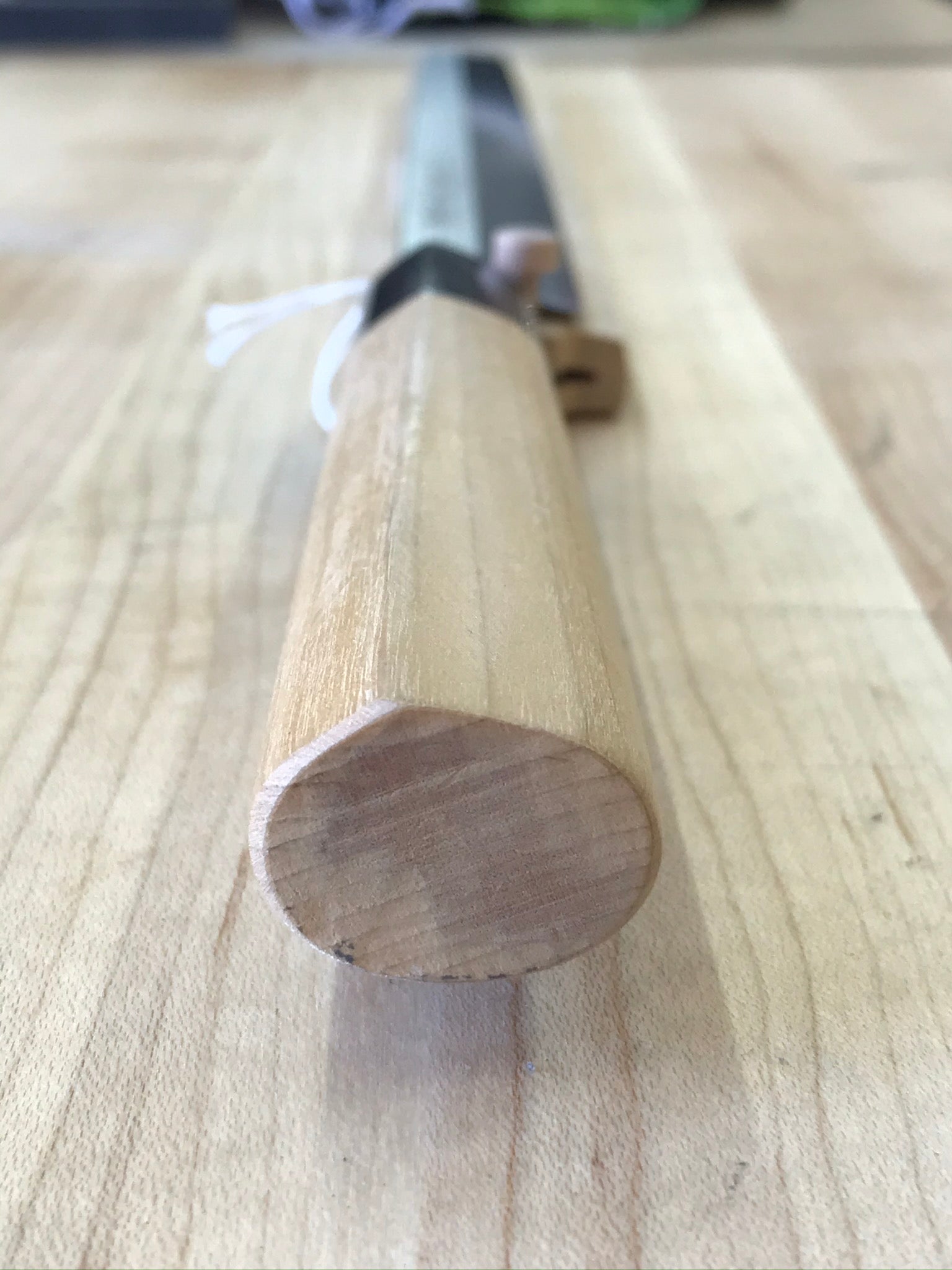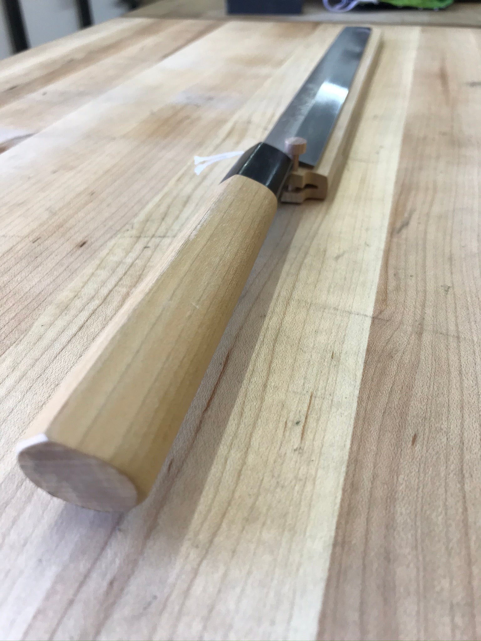 Kikuichi's Ginsan blades are hand forged from two layers with the harder Ginsan making up the edge and a softer stainless for the tang. They are also hand assembled by traditional craftsmen. This makes the knife easier to sharpen and care for.