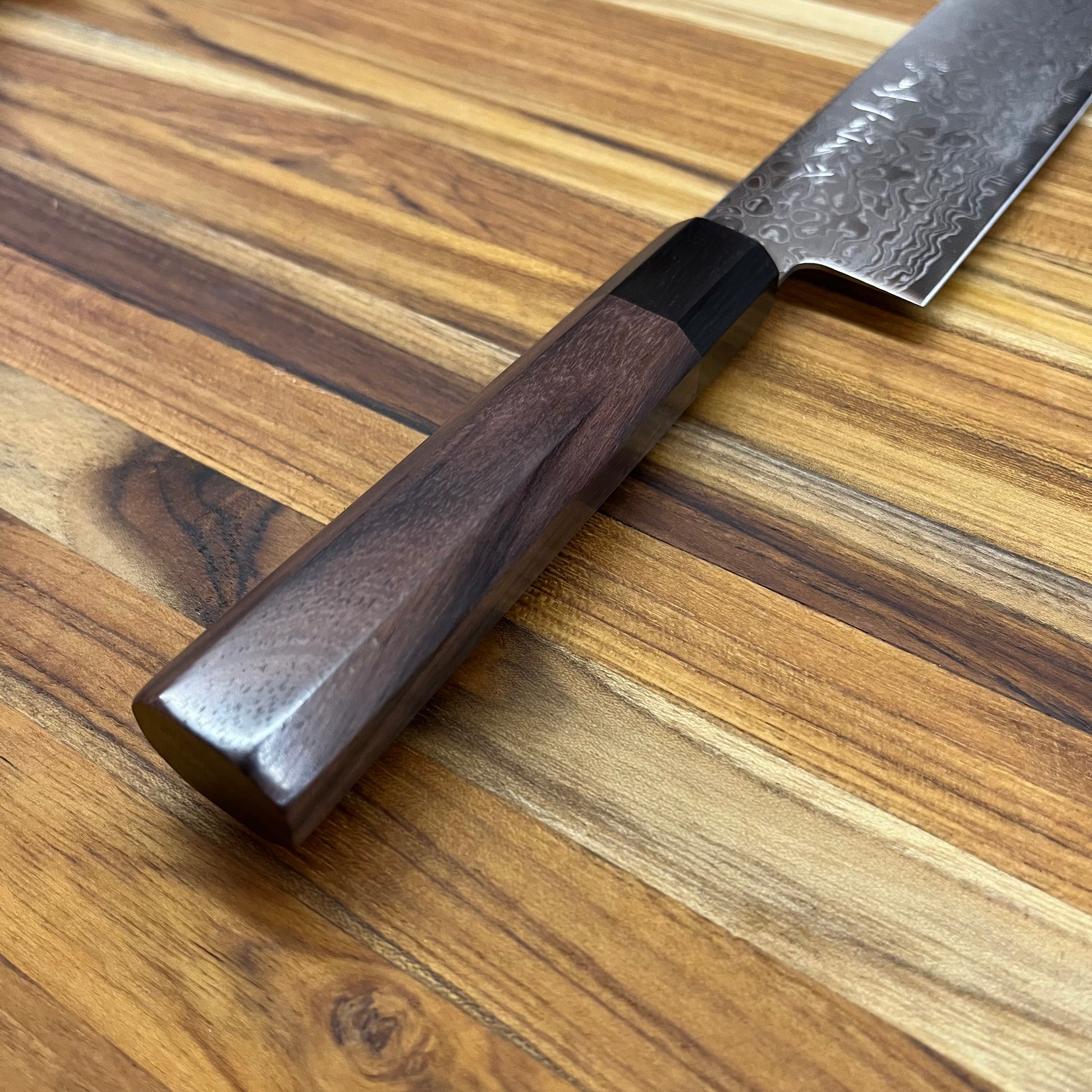 Kikuichi's Nickel Warikomi Damascus series may be the most nimble knives you ever hold. These thin and agile 45-layer Damascus blades have an edge of AUS10, one of the finest modern Japanese blades available. Matched with a Rosewood handle and Ebony ferrule this series is beautiful and functional, and destined to be the showpiece of any kitchen.