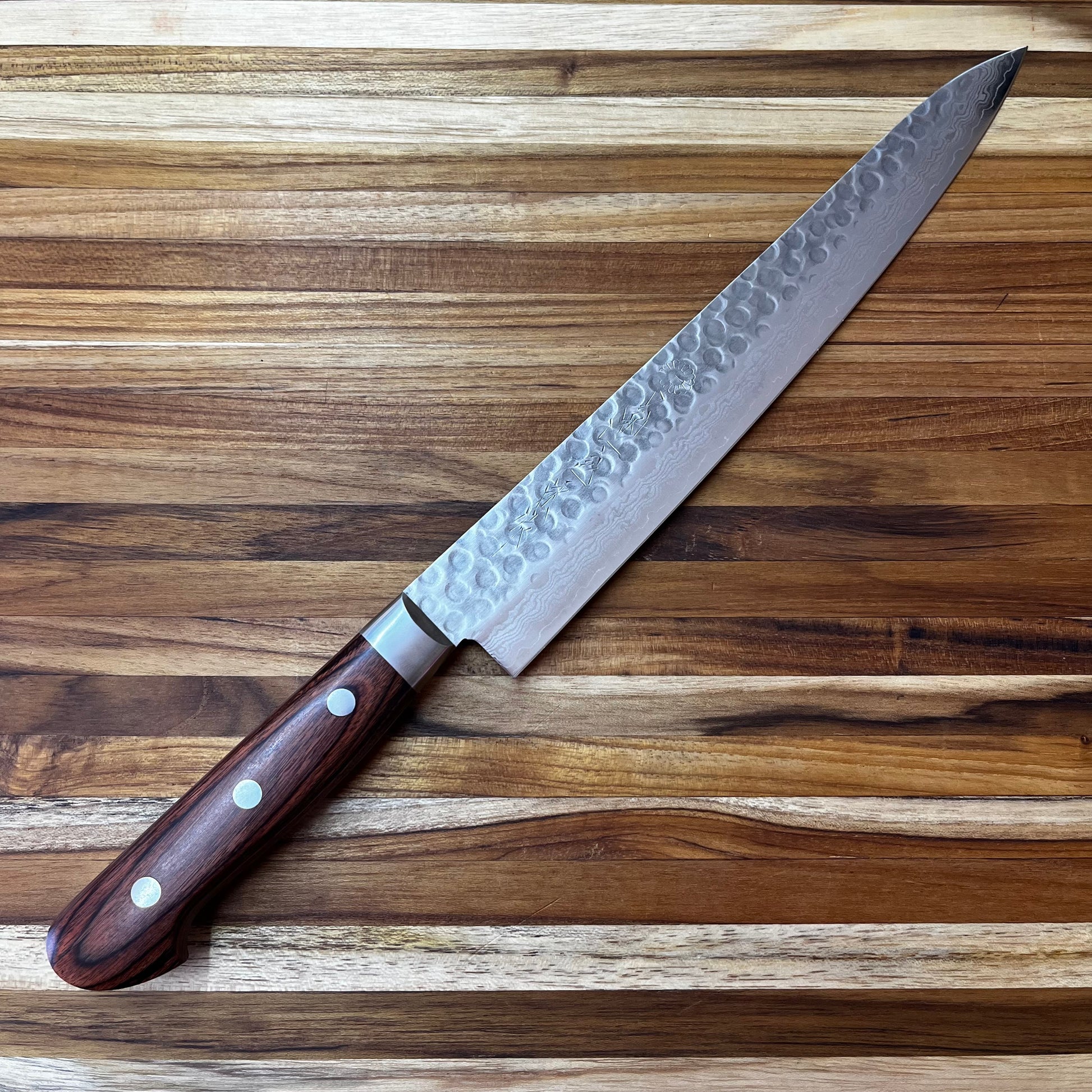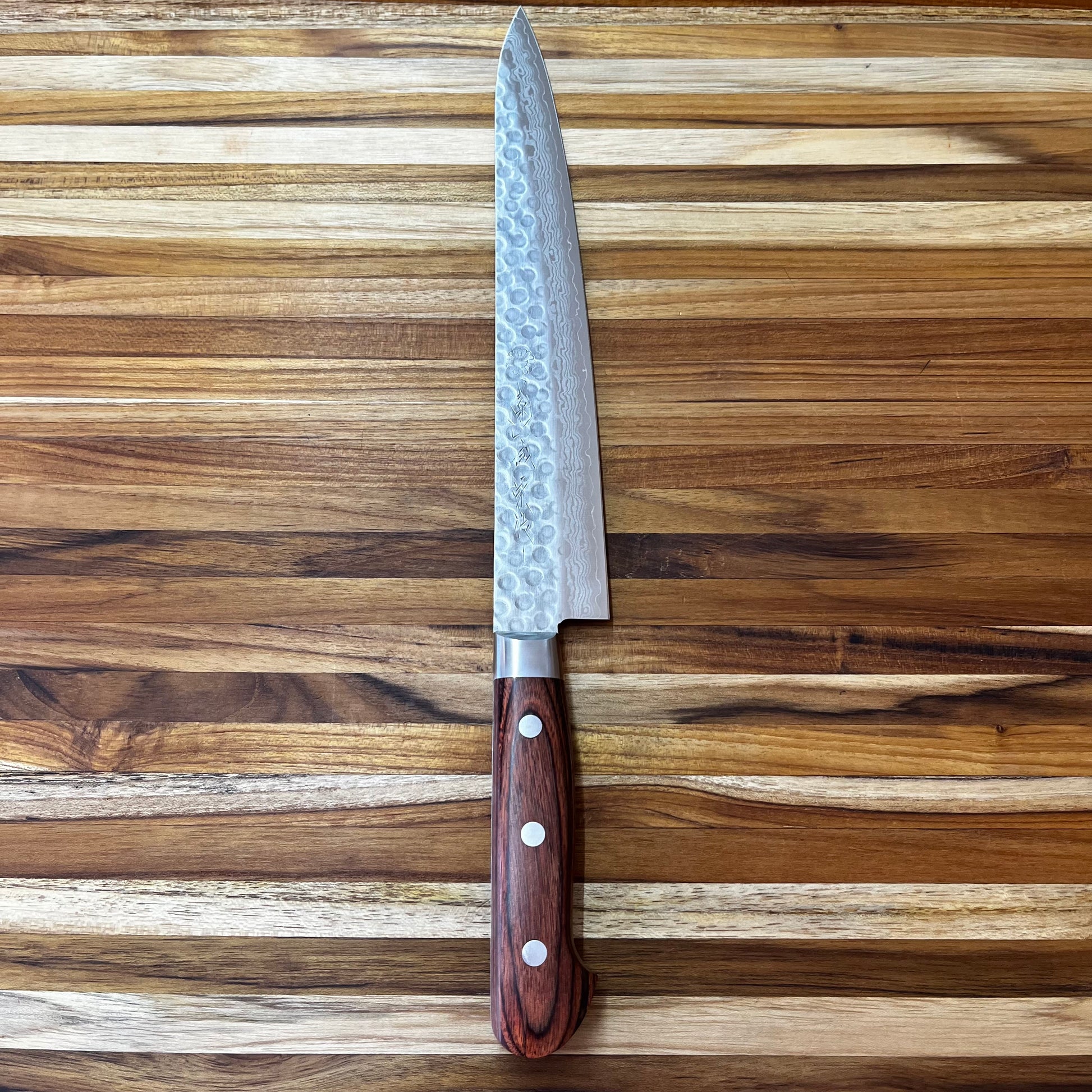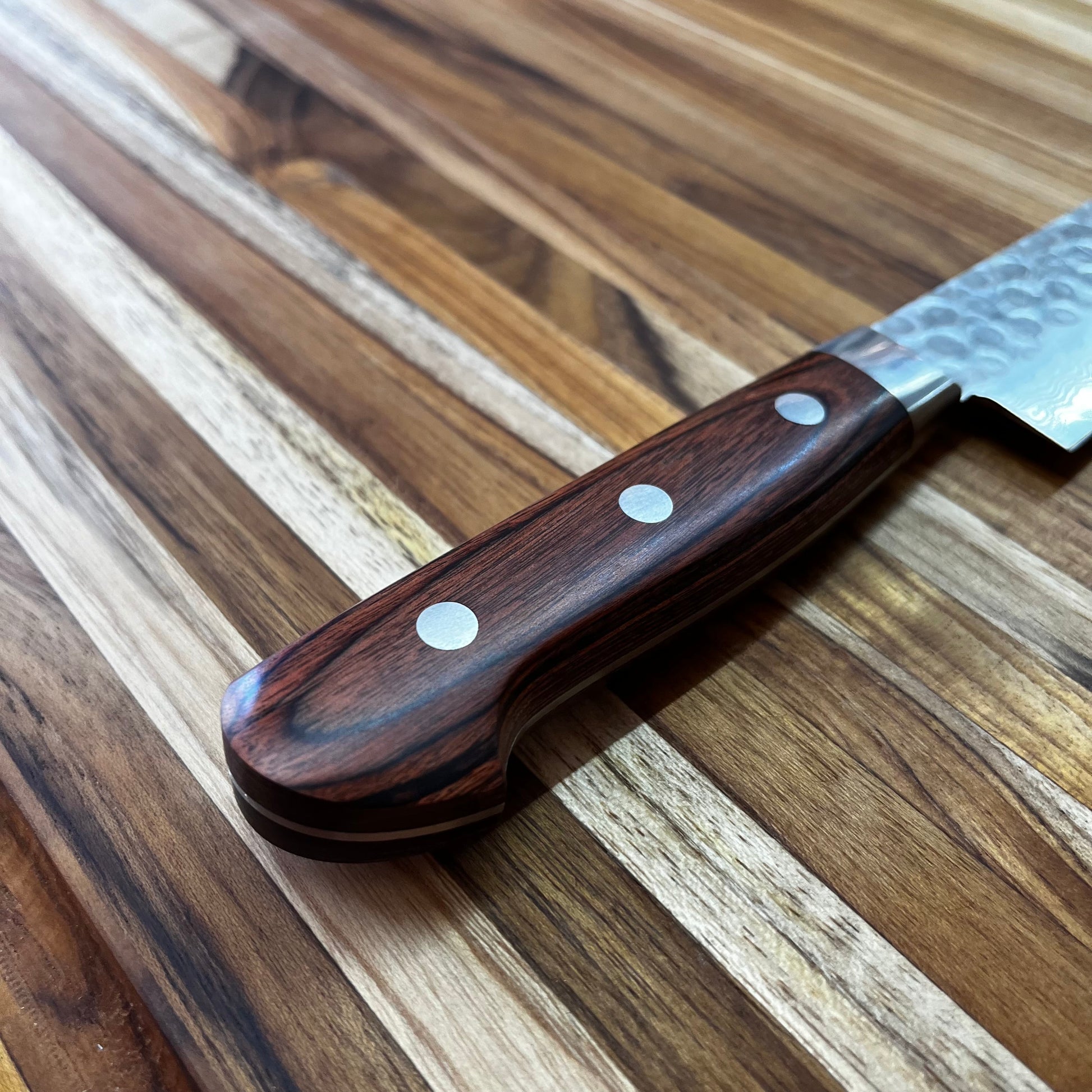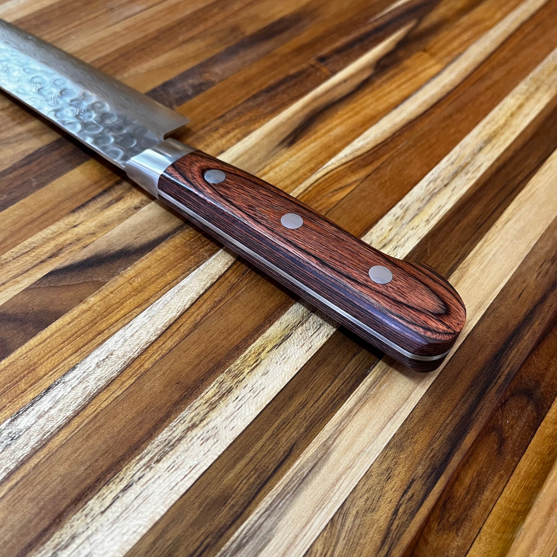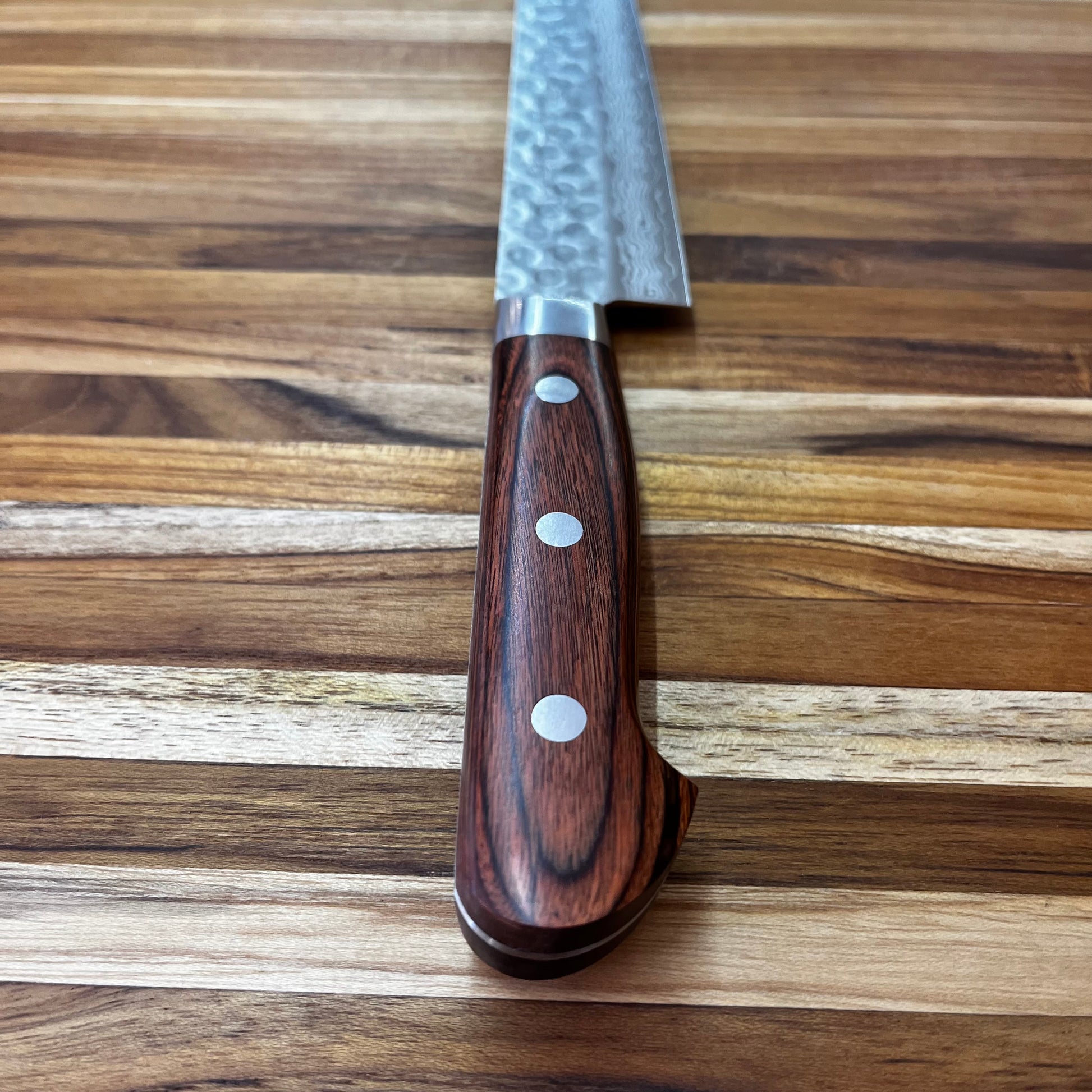 Similar in weight to many German knives, this WDT Series is the new-make of the ever-popular Warikomi Damascus Tsuchime series - now with mahogany handles.