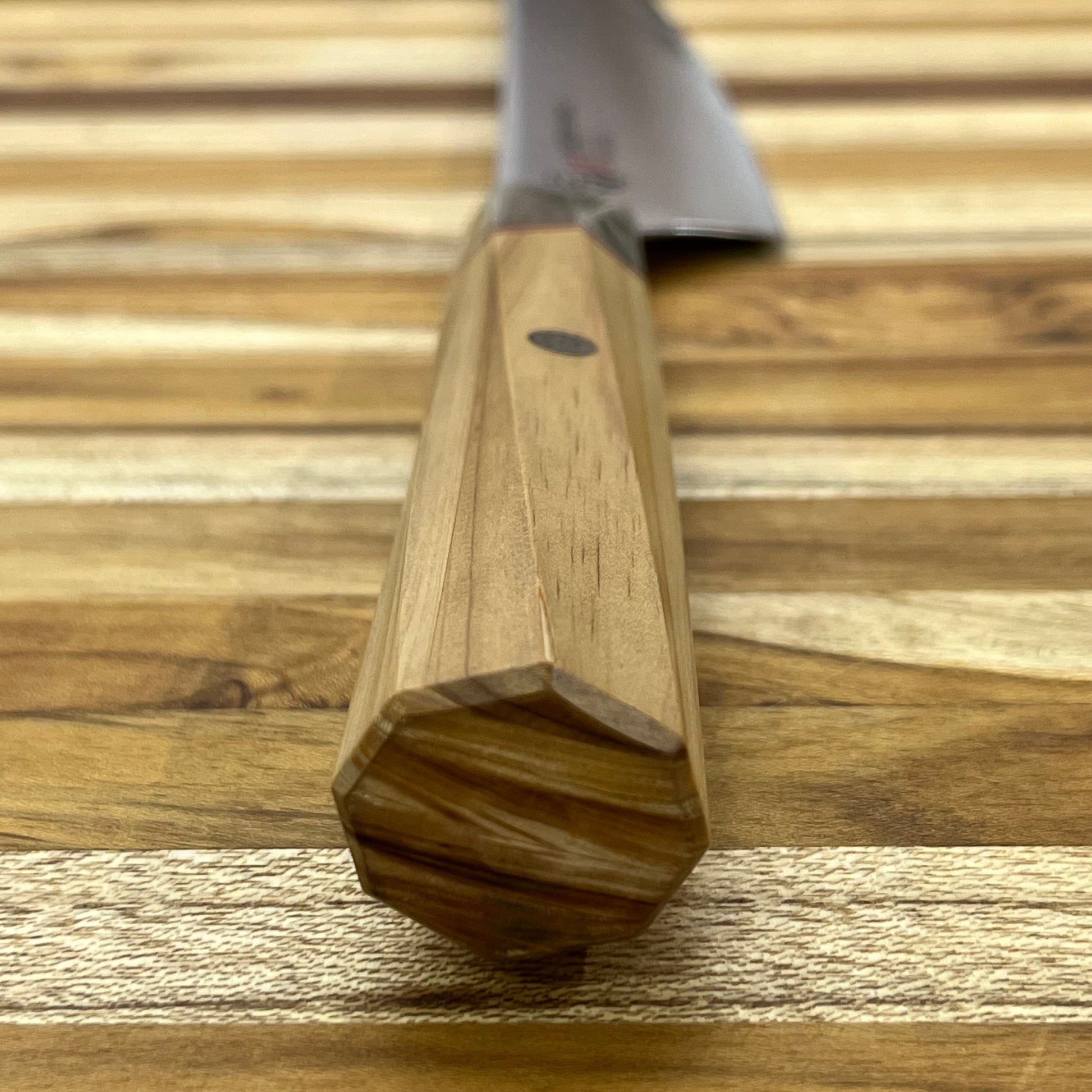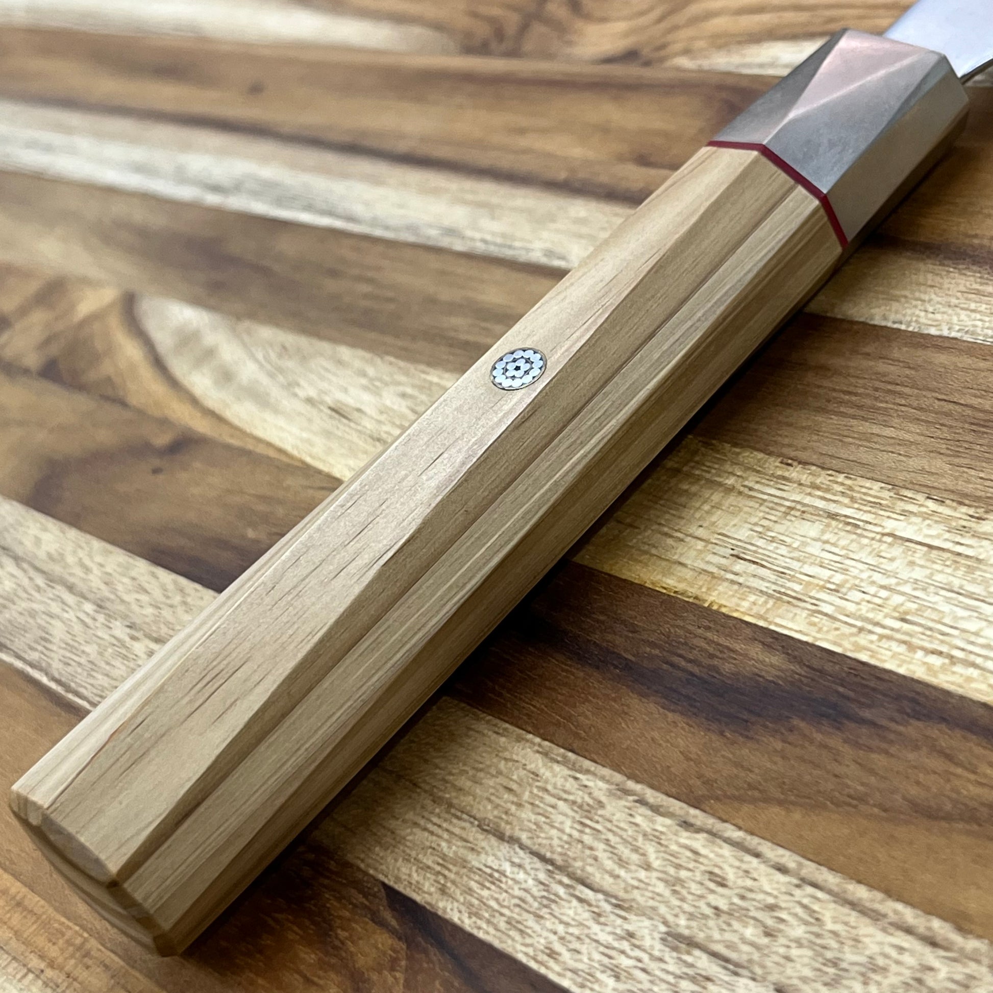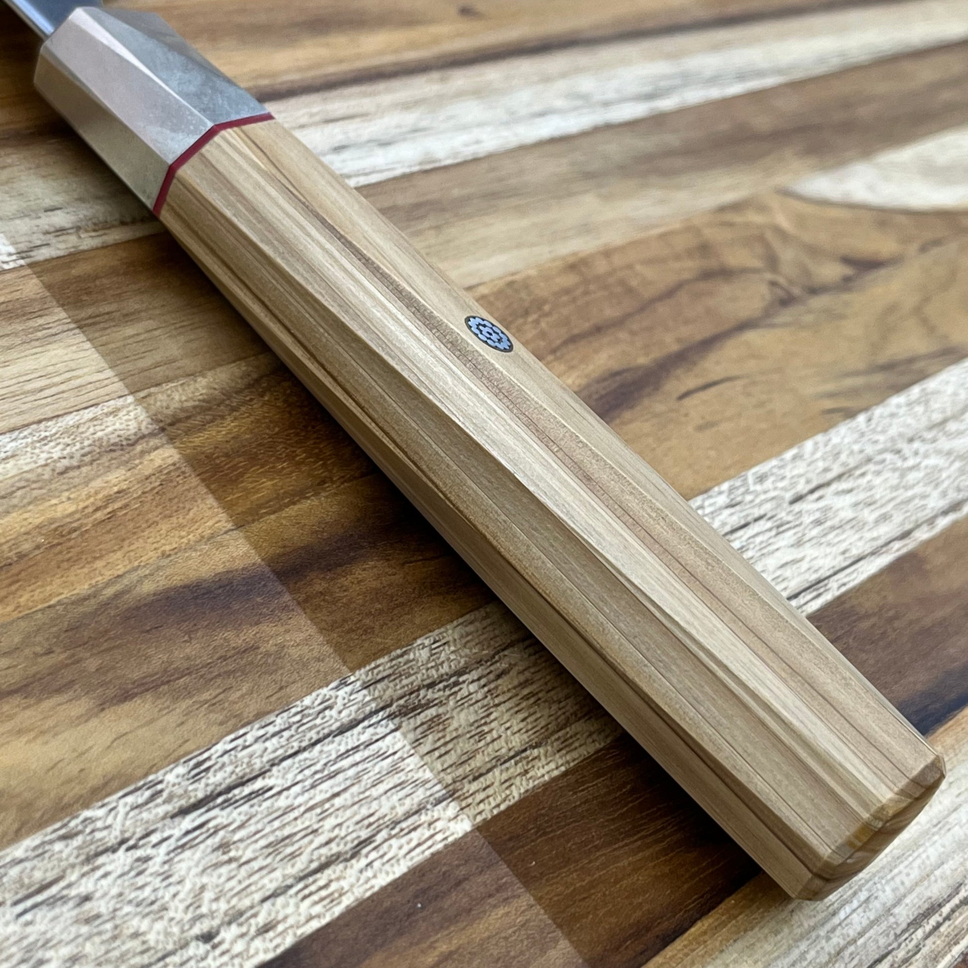 These blades are complemented with a traditional, octagonal Wa handle made from non-stabilized natural wood, accessorized by a decorative pin, and twisted for remarkable comfort.