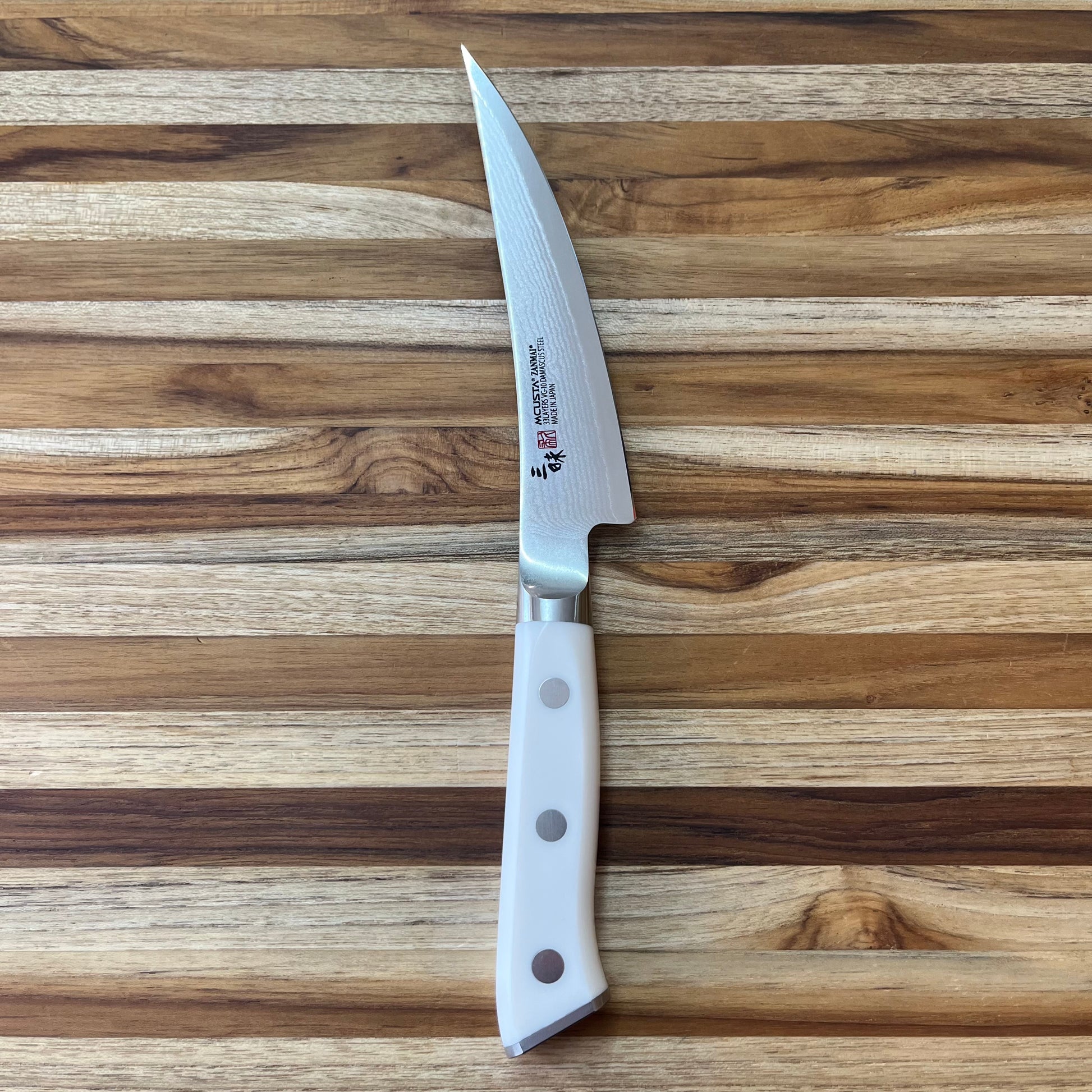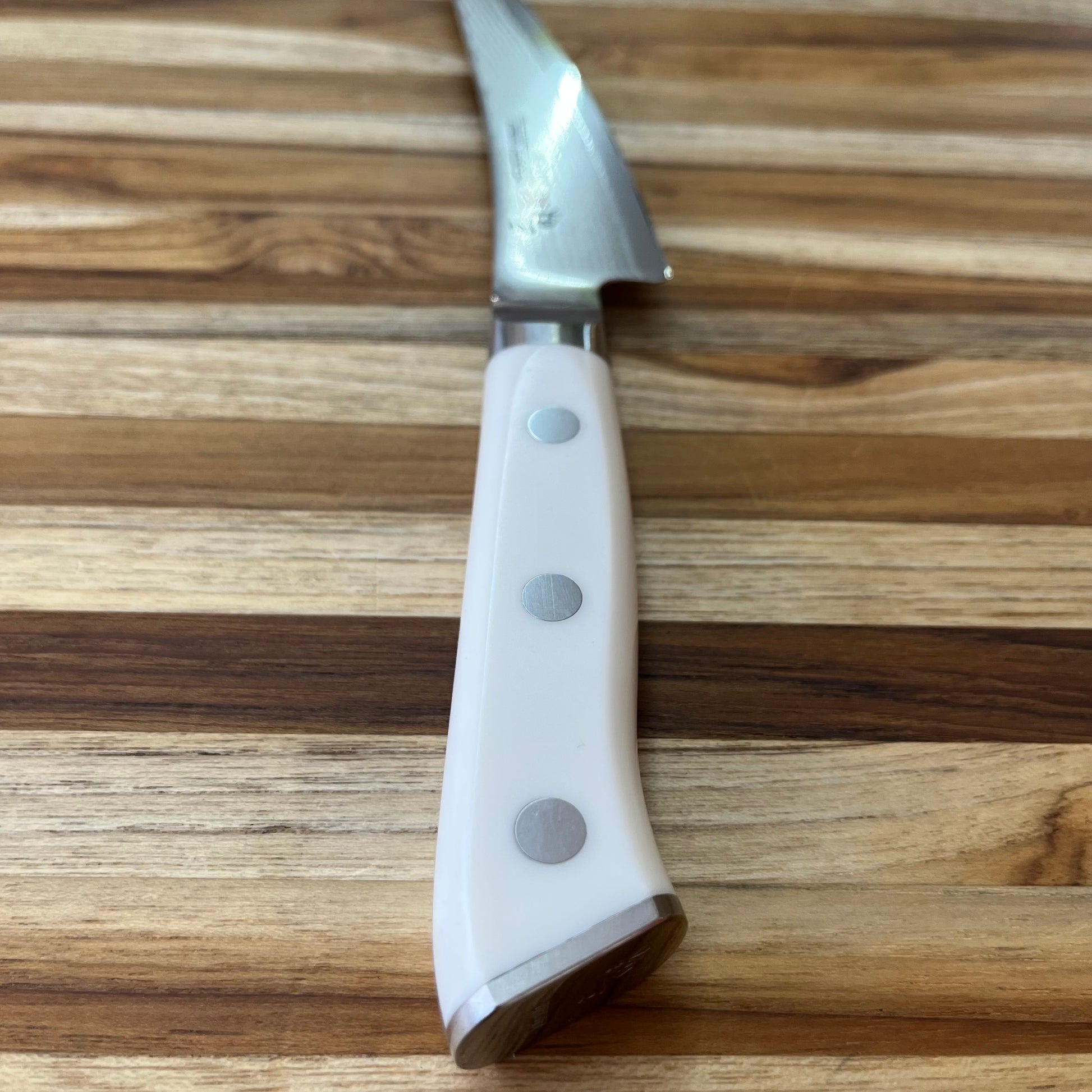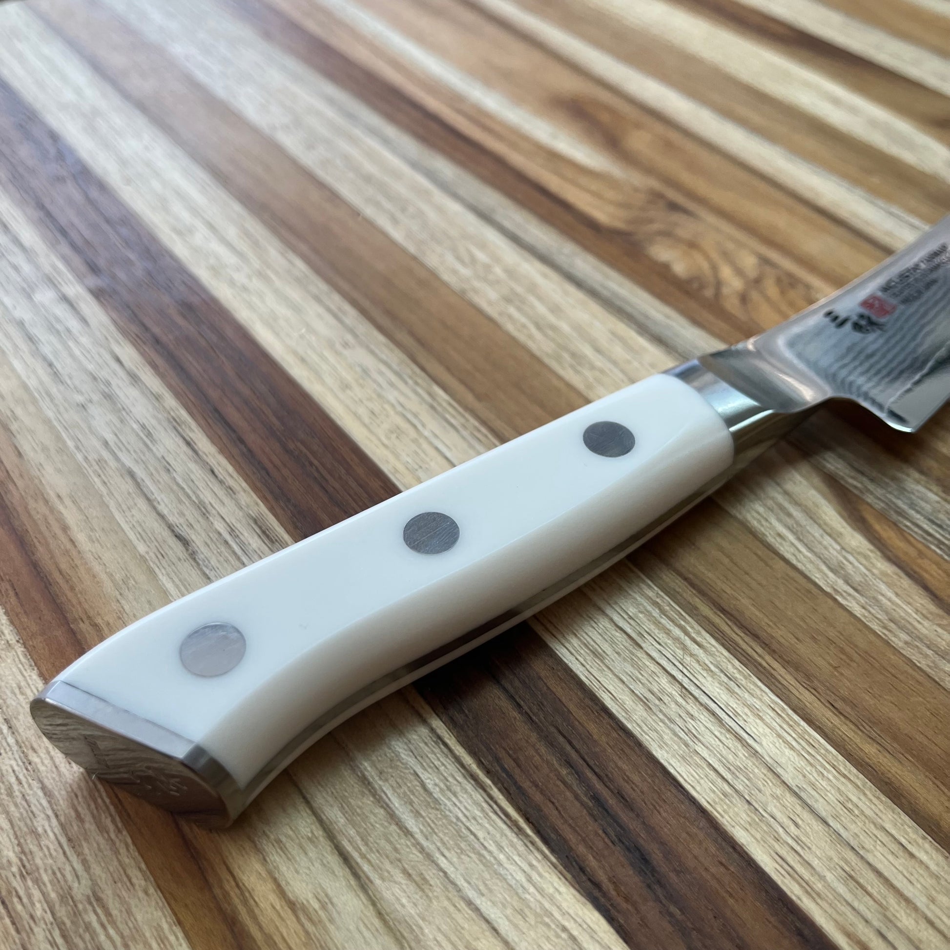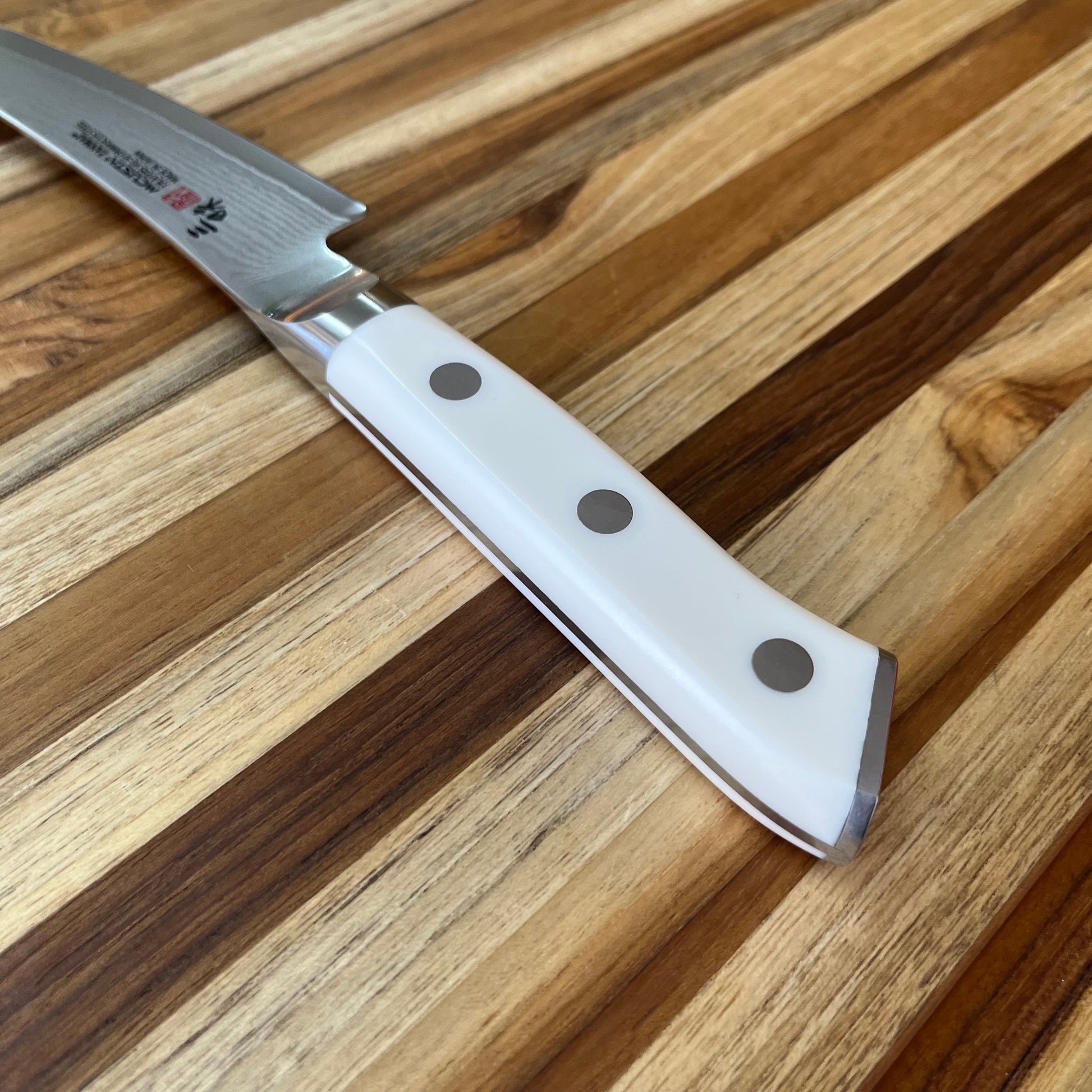 As a part of Zanmai’s cutlery collection that features 33-layers of steel with a VG-10 core, the Classic Damascus series is available in riveted white Corian or Ironwood handles. This type of blade construction, complete with a full-tang, adds a bit of weight and balances out well. It cuts very fine and is responsive to standard honing techniques.