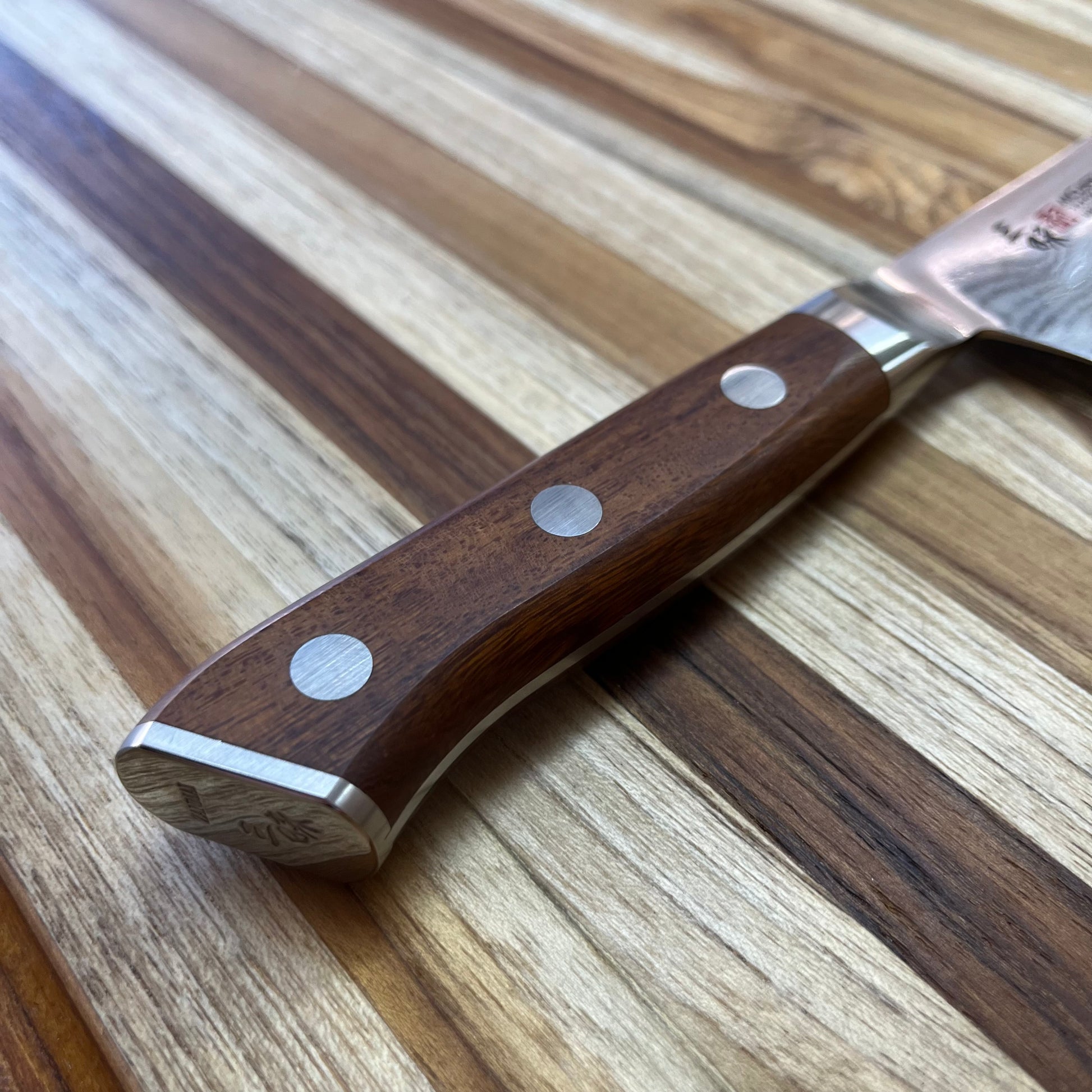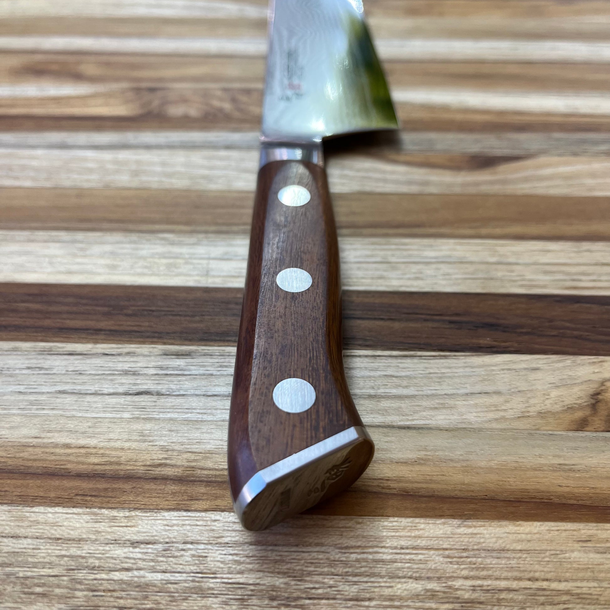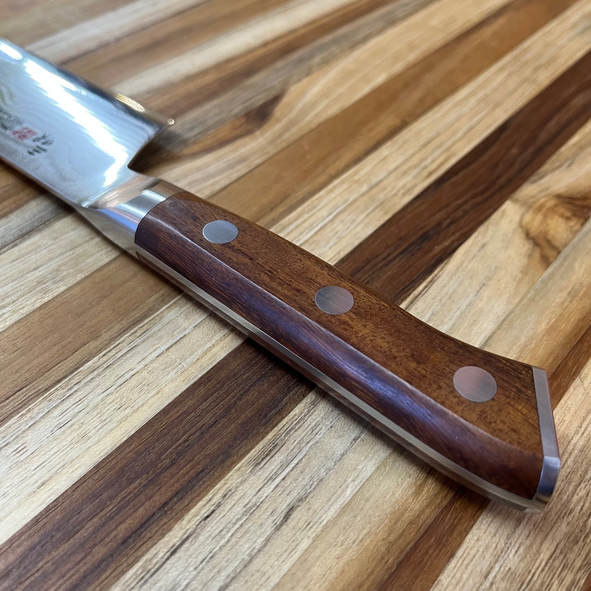 As a part of Zanmai’s cutlery collection that features 33-layers of steel with a VG-10 core, the Classic Damascus series is available in riveted white Corian or Ironwood handles. This type of blade construction, complete with a full-tang, adds a bit of weight and balances out well. It cuts very fine and is responsive to standard honing techniques.