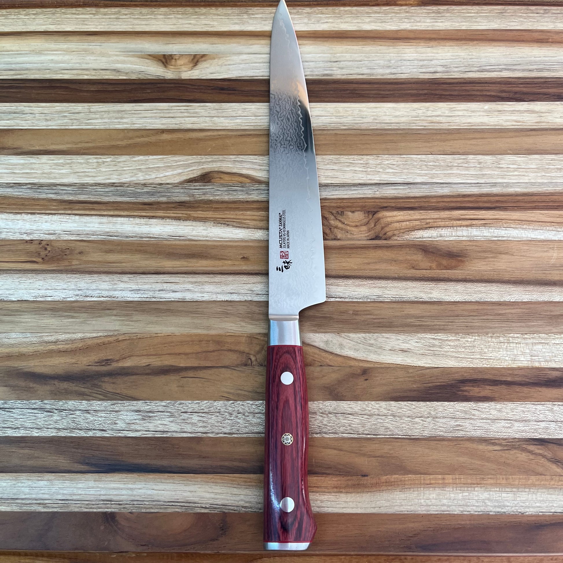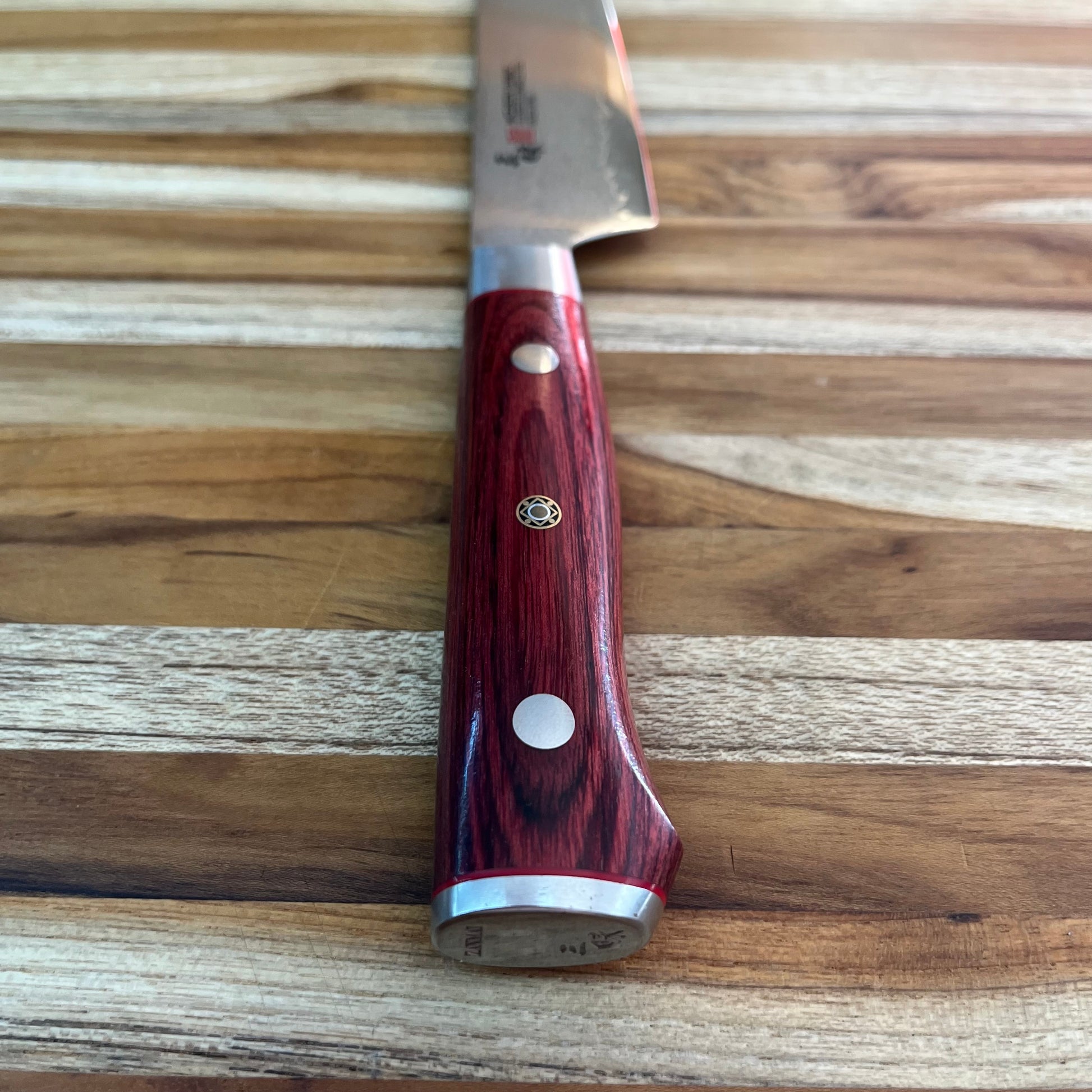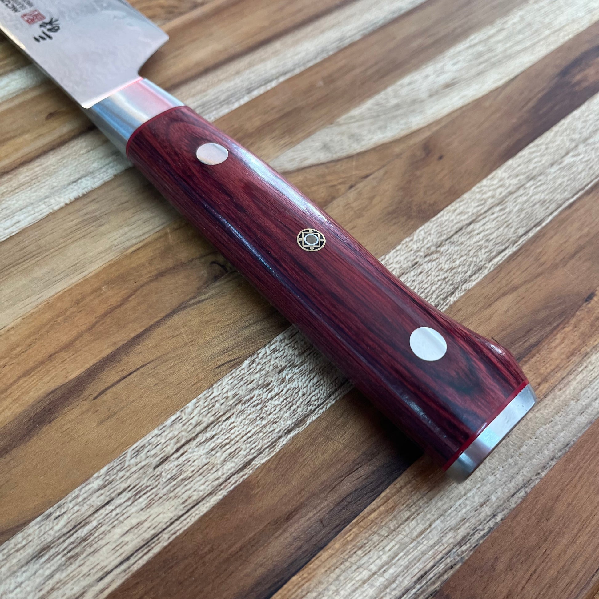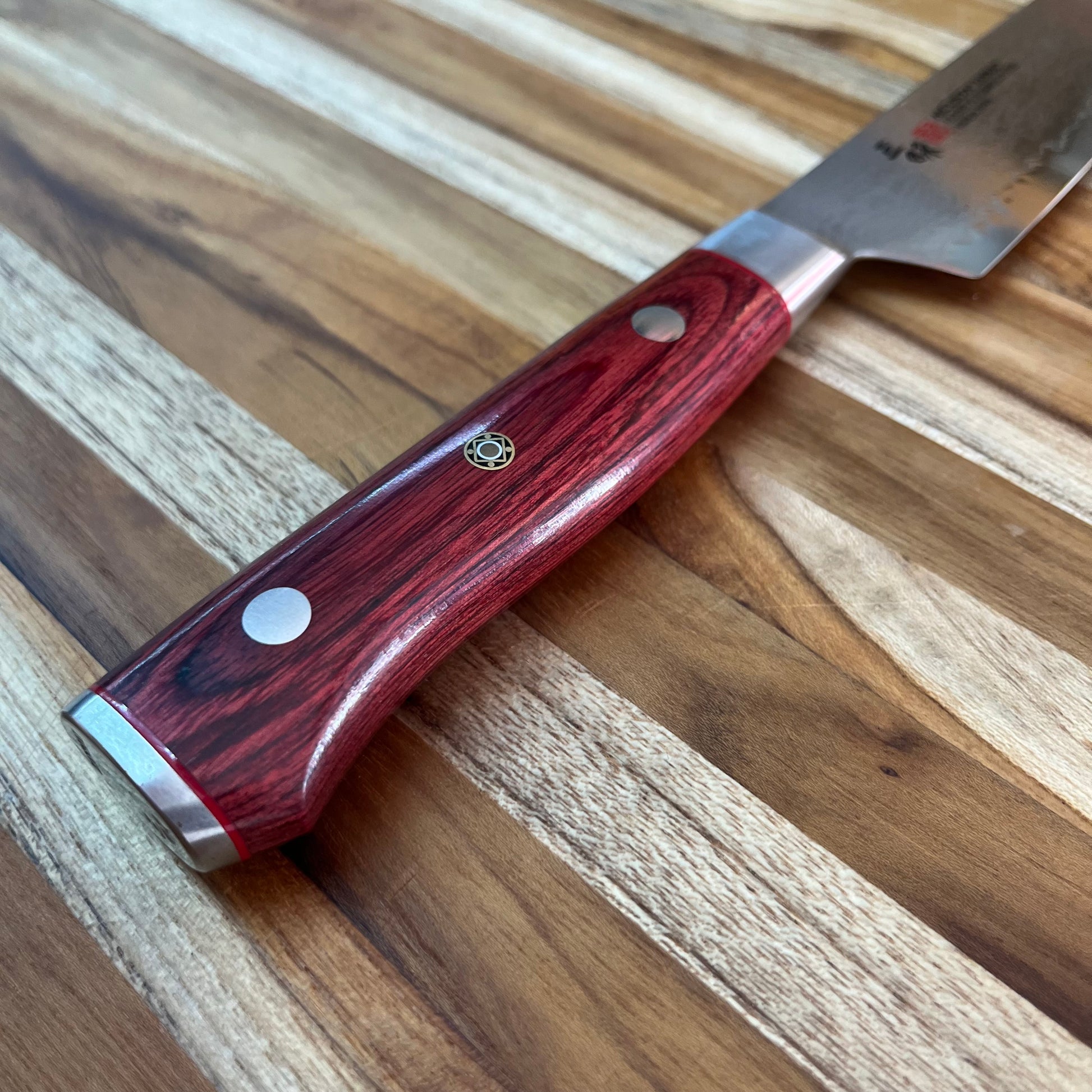 Mcusta Zanmai’s Classic Pro Damascus Flame series is innovative and surprisingly light-weight, making it one of the most popular series Zanmai offers. The striking appeal of the Damascus blades, similar in design to the standard Classic series, surpasses its aesthetic presentation inasmuch the riveted with mosaic Red Pakkawood handle is given an ergonomic feel that still maintains the balance point of the Classic, while offloading some of the weight. The needs of professionals and home-chefs alike are met earnestly.