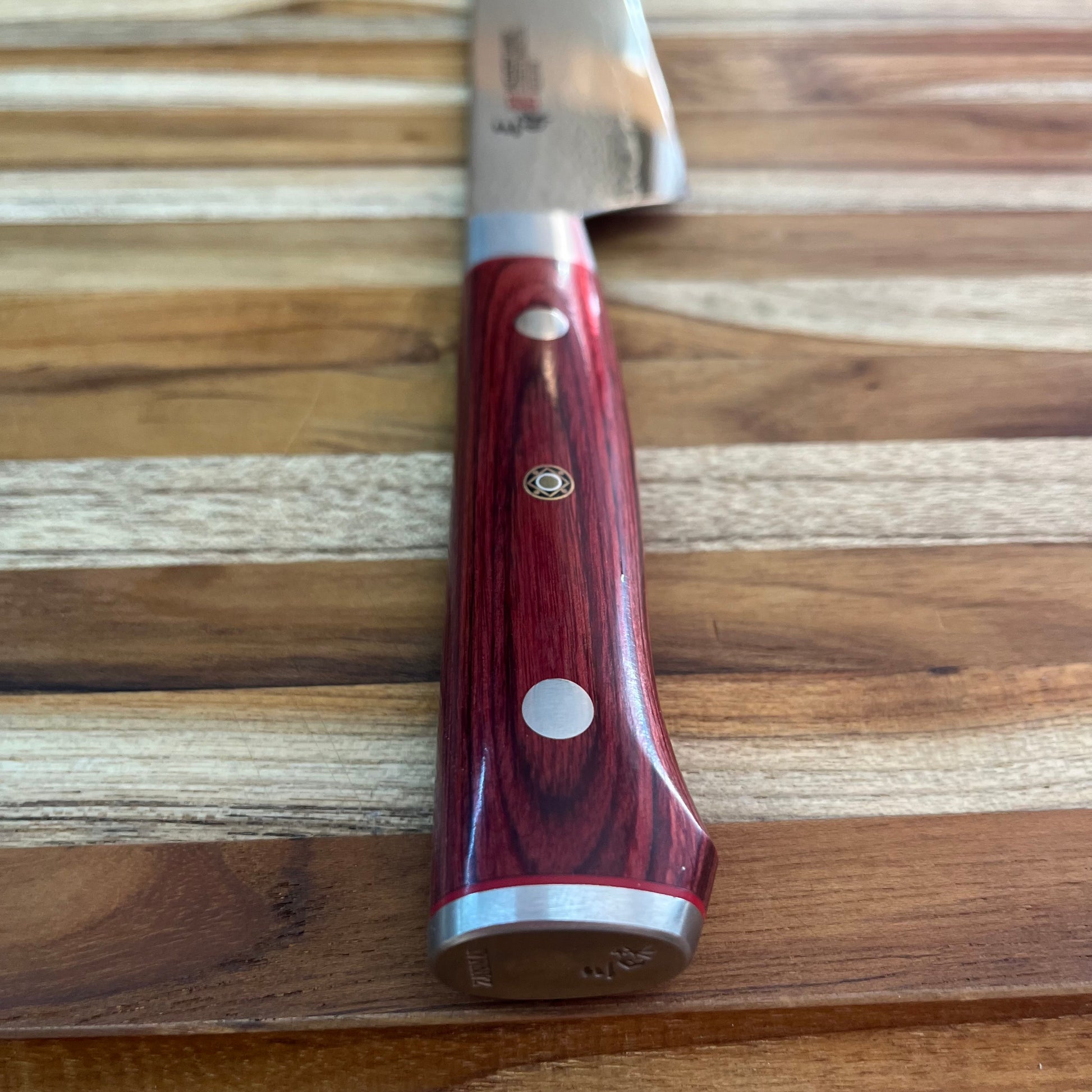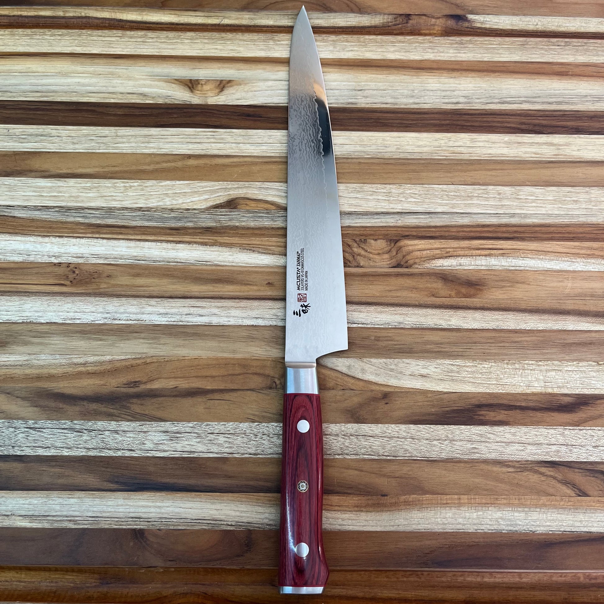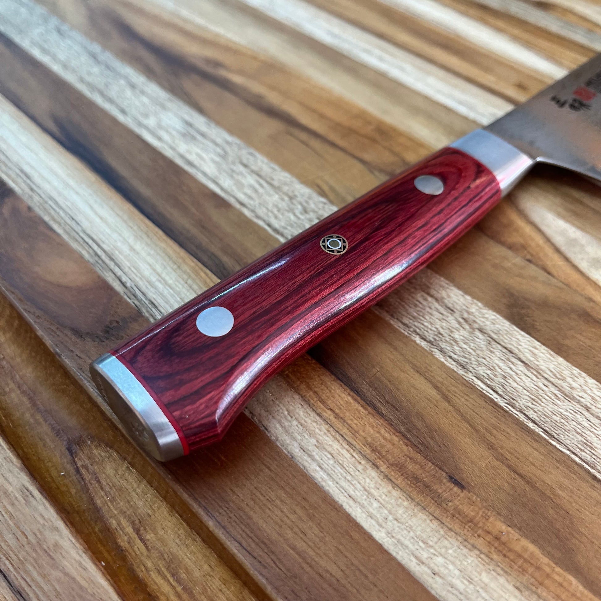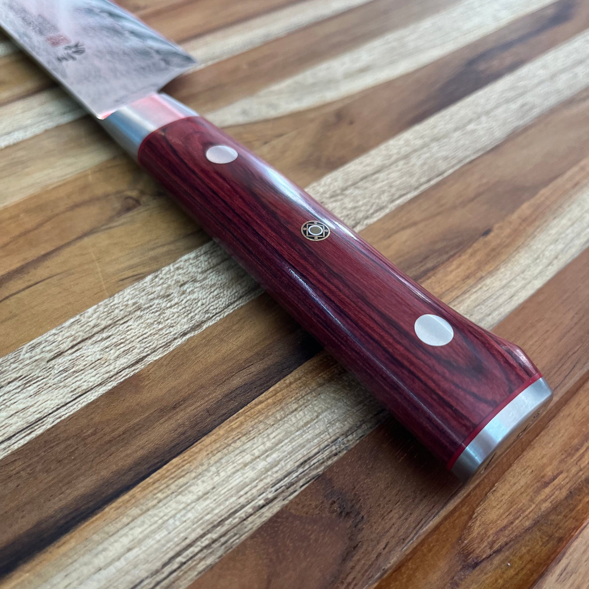 Mcusta Zanmai’s Classic Pro Damascus Flame series is innovative and surprisingly light-weight, making it one of the most popular series Zanmai offers. The striking appeal of the Damascus blades, similar in design to the standard Classic series, surpasses its aesthetic presentation inasmuch the riveted with mosaic Red Pakkawood handle is given an ergonomic feel that still maintains the balance point of the Classic, while offloading some of the weight. The needs of professionals and home-chefs alike are met earnestly.