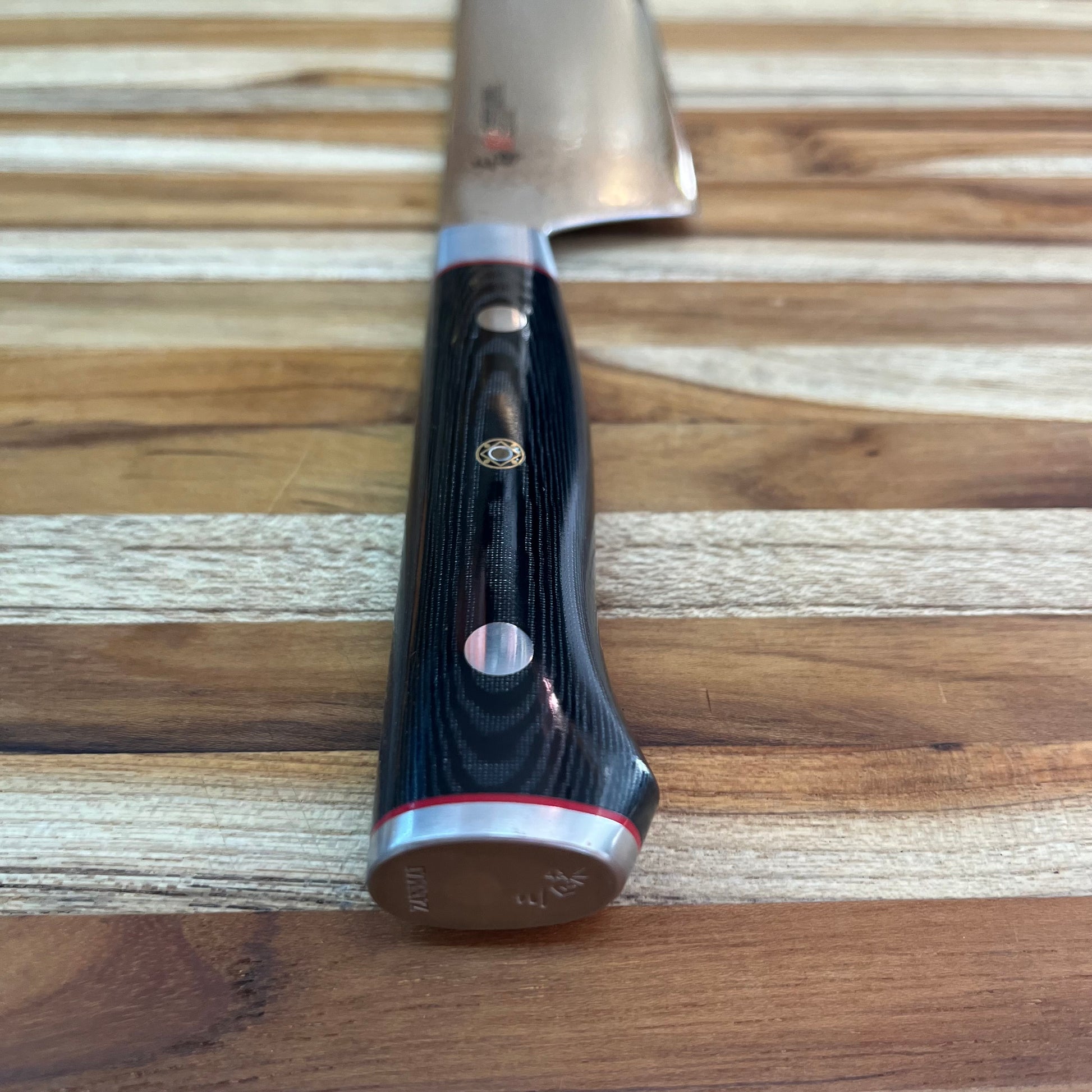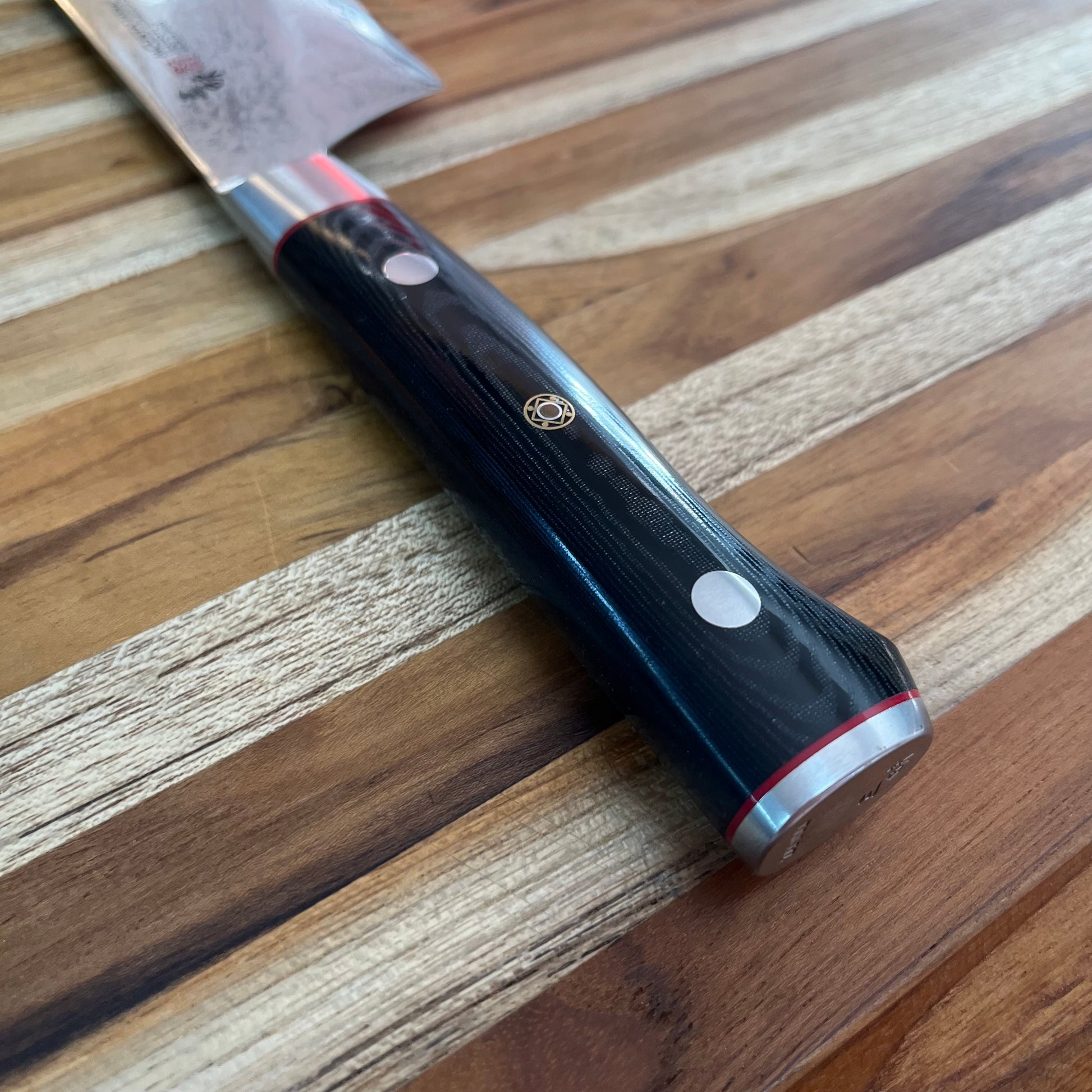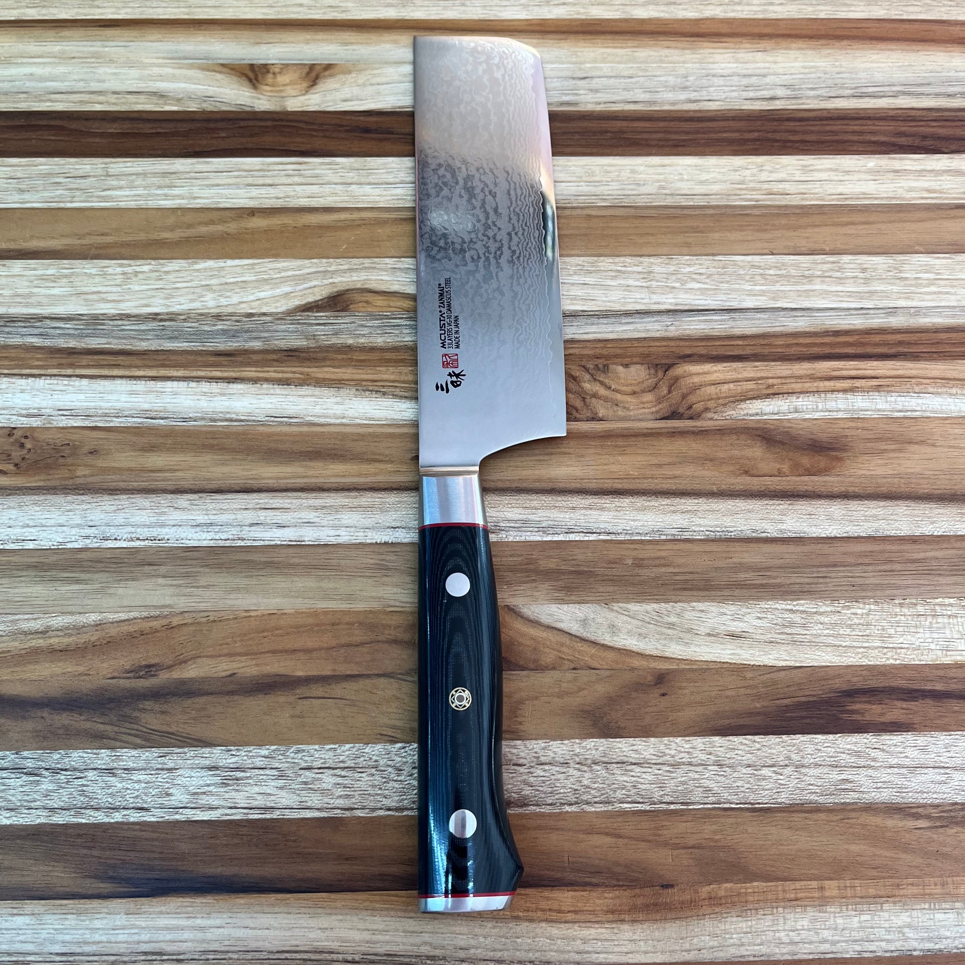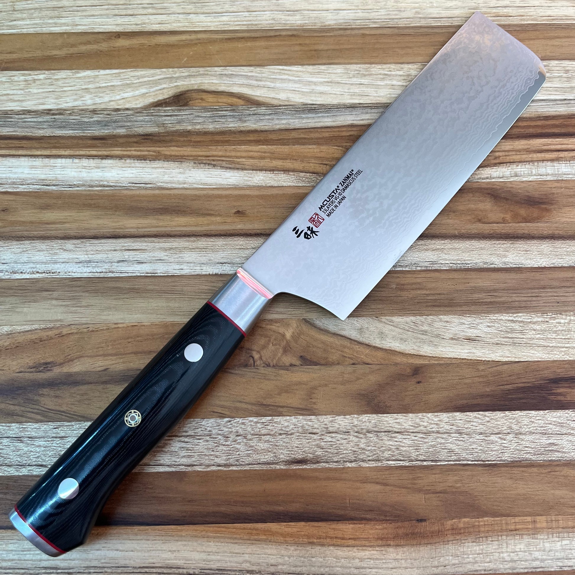 Mcusta Zanmai’s Classic Pro Damascus Zebra series is stunning in both performance and aesthetic. The striking appeal of the Damascus pattern on the blade gives an exquisite touch without sacrificing performance and would make a fine addition to any kitchen. The beautiful Micarta handle is lightweight but leaves the entire knife perfectly balanced.