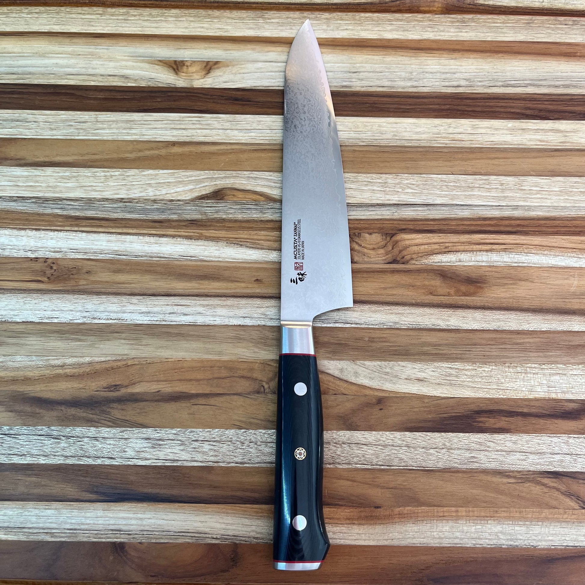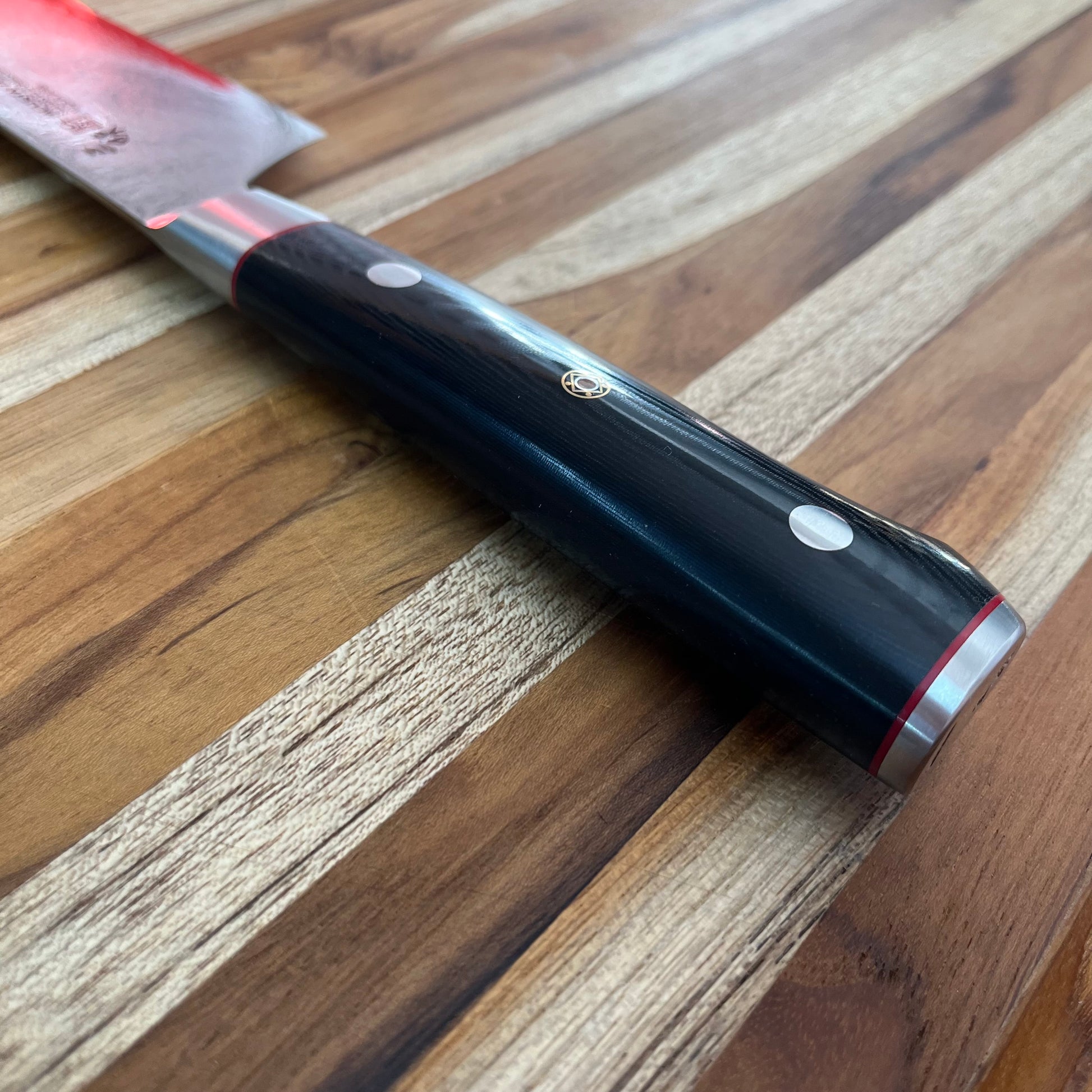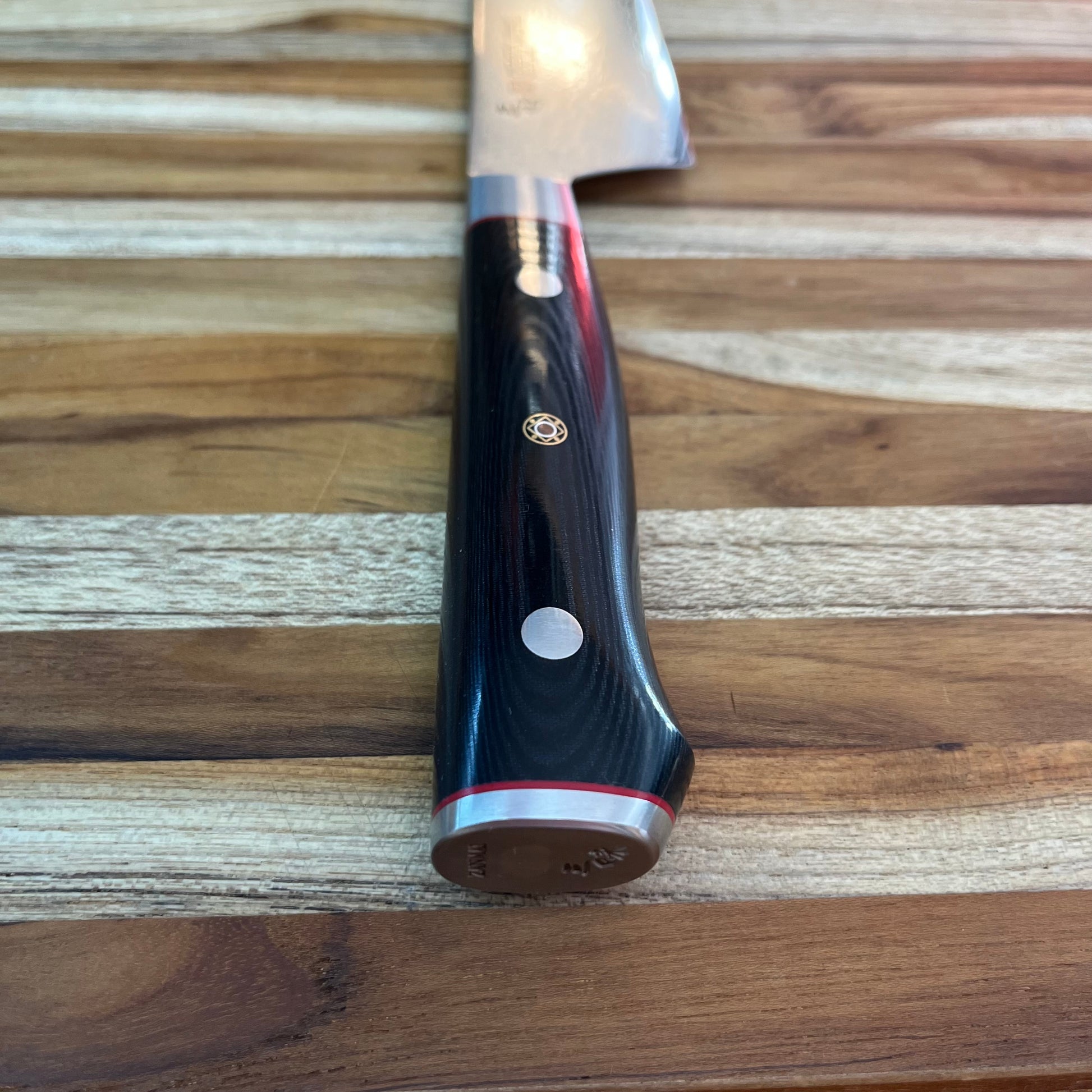 Mcusta Zanmai’s Classic Pro Damascus Zebra series is stunning in both performance and aesthetic. The striking appeal of the Damascus pattern on the blade gives an exquisite touch without sacrificing performance and would make a fine addition to any kitchen. The beautiful Micarta handle is lightweight but leaves the entire knife perfectly balanced.