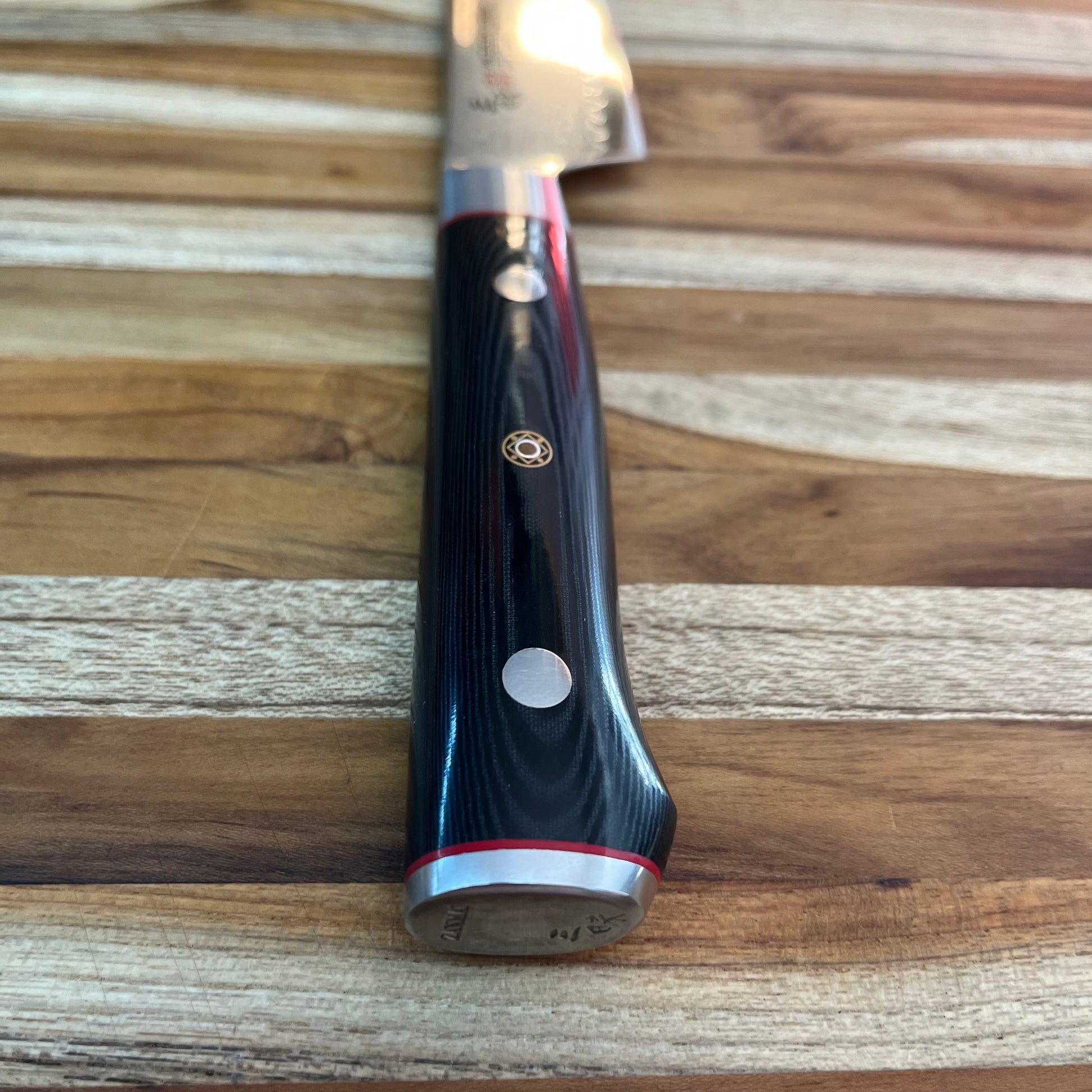 Contoured black micarta; three rivet with the middle a set Mosaic pin. Red Spacers add an elegant and professional look/feel to the handle.Specifications