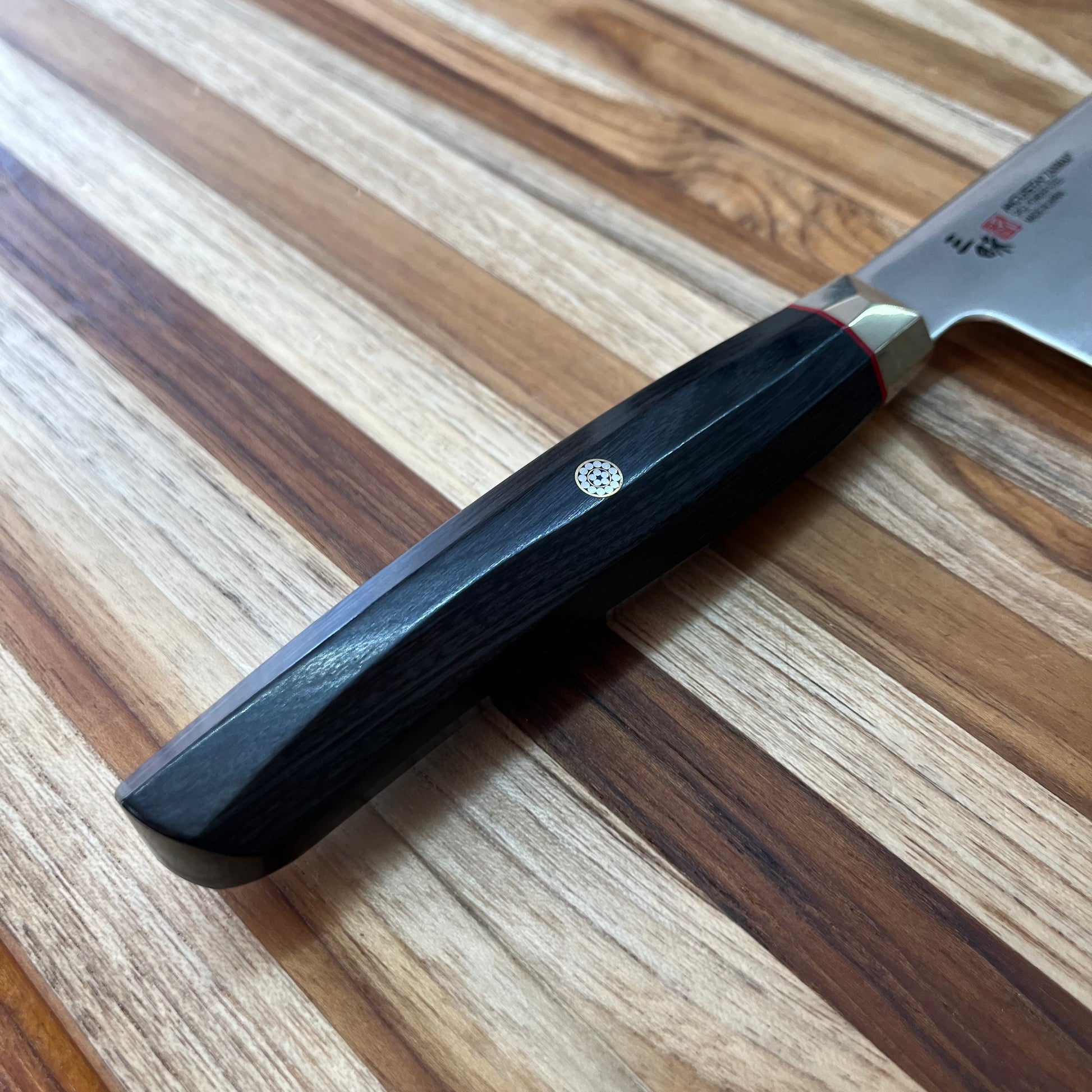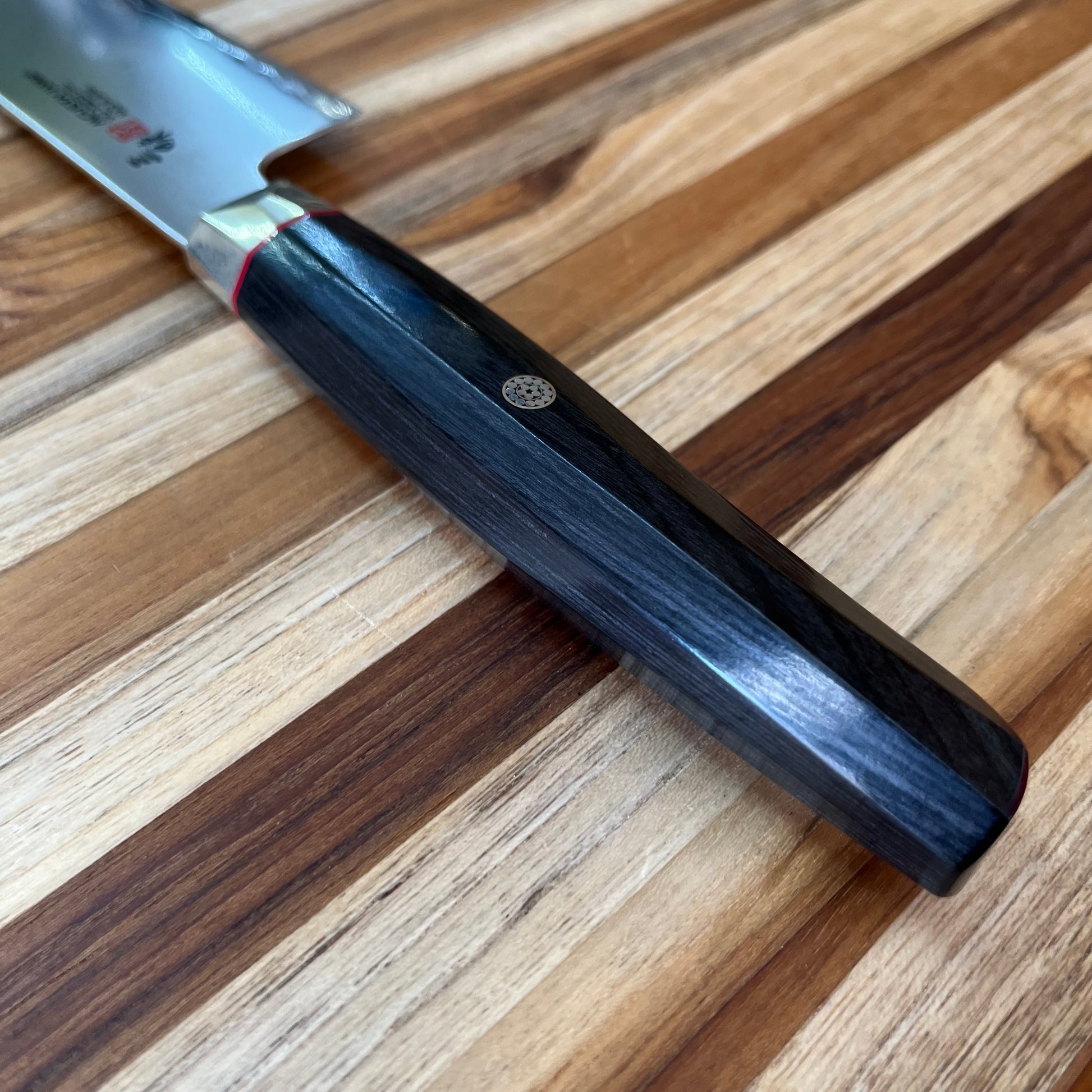 Mcusta Zanmai’s Revolution series is stunning in both performance and aesthetic. The striking appeal of the sanmai blade construction is reminiscent of a japanese sword and would make a fine addition to any kitchen. At the same time, the elegant performance of these hand-finished blades meets or exceed the needs of professionals and home-chefs alike.