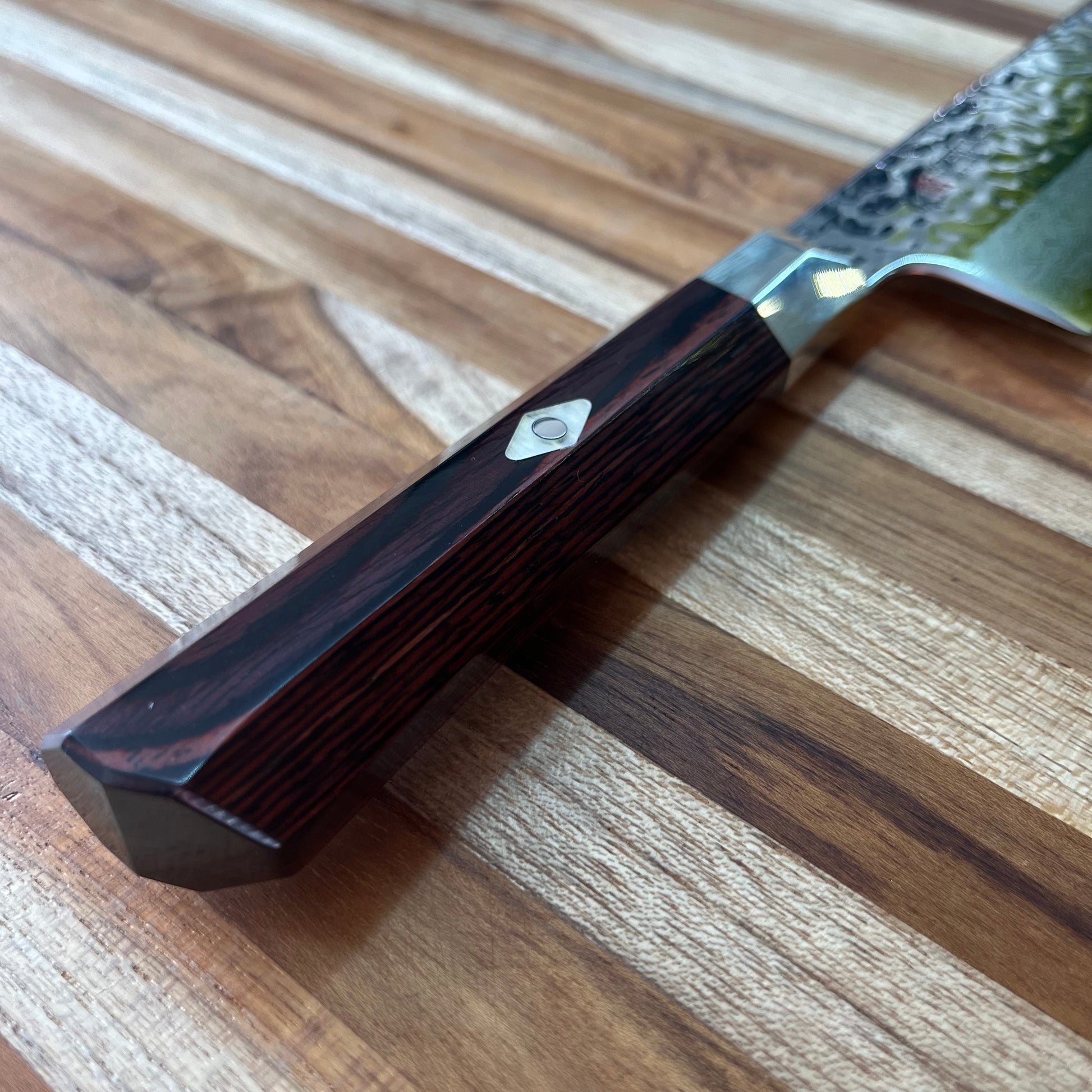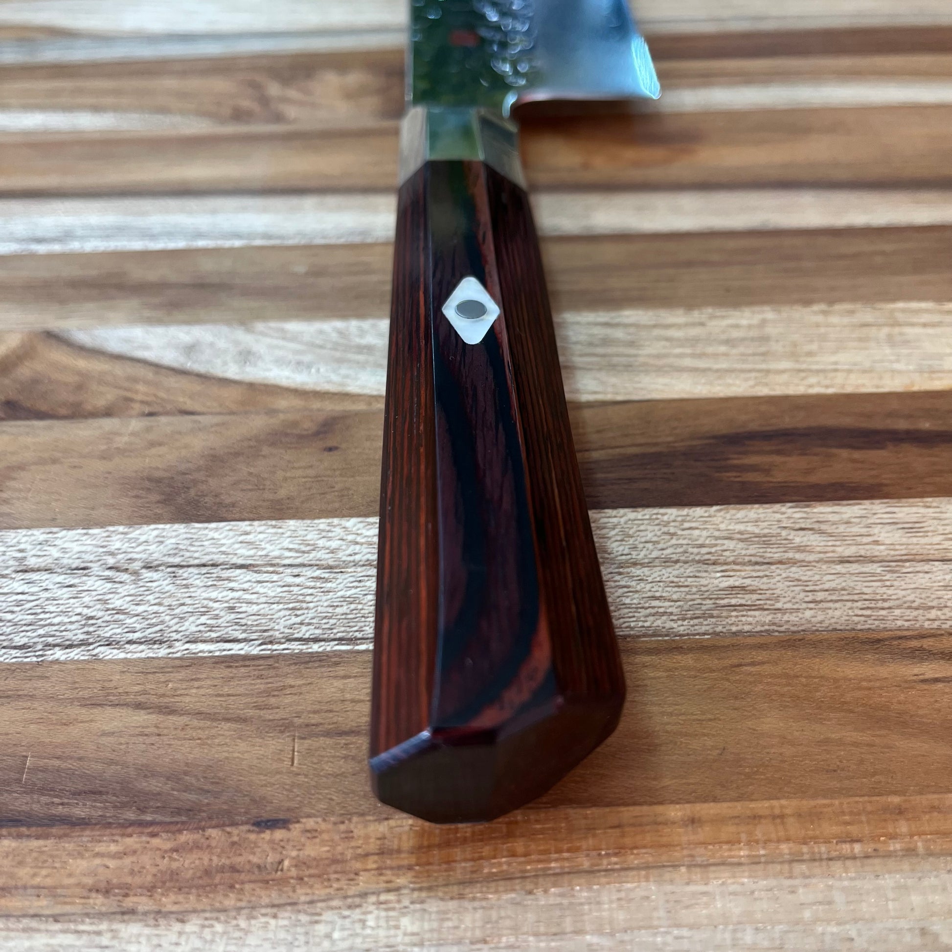 Experience the precision and quality of Japanese craftsmanship with the Mcusta Zanmai Supreme Hammered Series. This expertly crafted knife features 33 layers of polished Damascus steel with a VG10 core with a remarkable 60 Rockwell hardness. Its double bevel edge provides the perfect angle for precise cuts. The red Pakkawood octagonal handle, adorned with a Japanese mosaic accent rivet, offers a comfortable and stylish grip. As an added bonus, the contoured bolster is made of nickel silver, providing anti-bacterial and anti-rust properties. Each knife is handcrafted in Seki city, Japan and comes with a limited lifetime warranty.