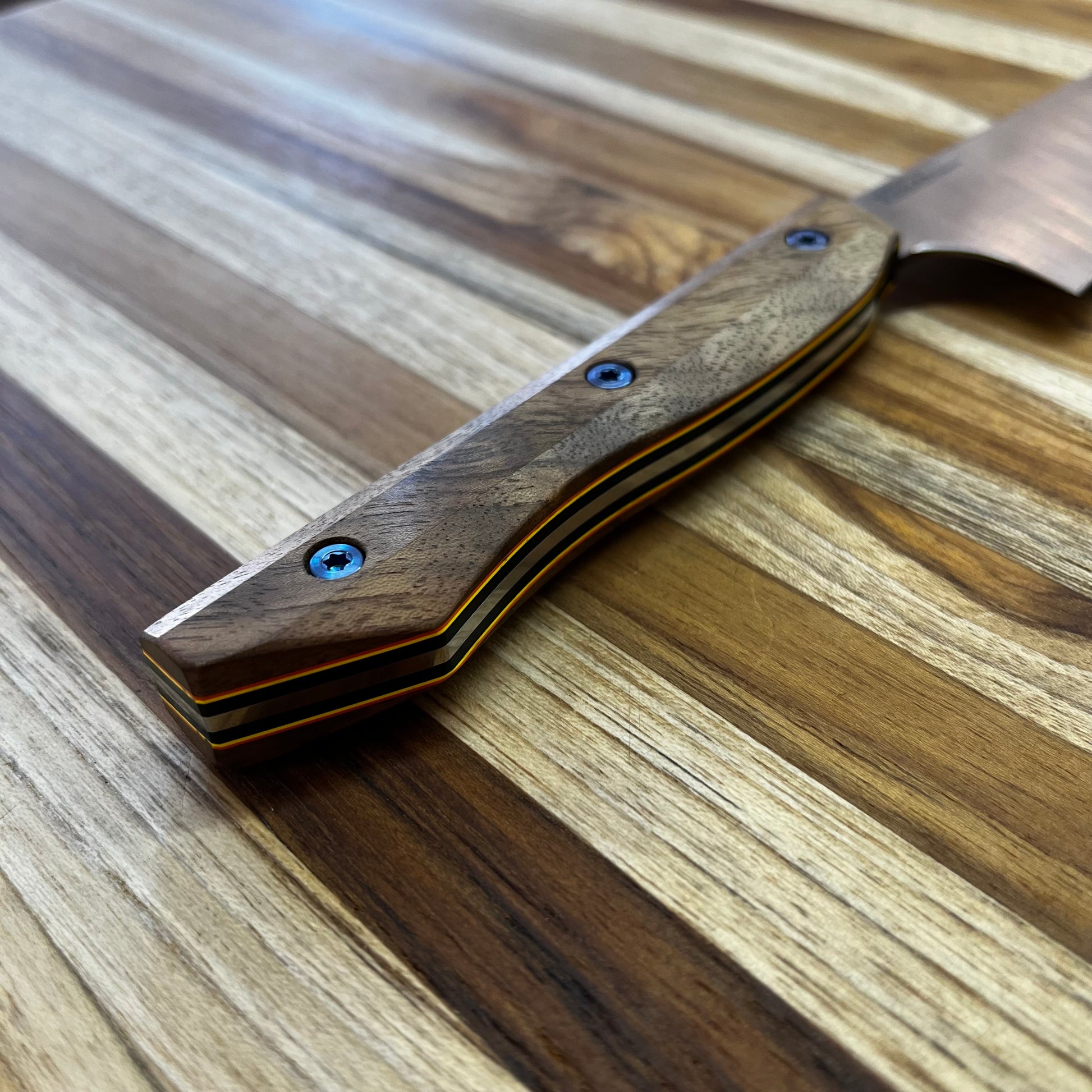 Bastogne Walnut Wood w/ Orange, Yellow, and Black Spacers & Blue Titanium Hardware |