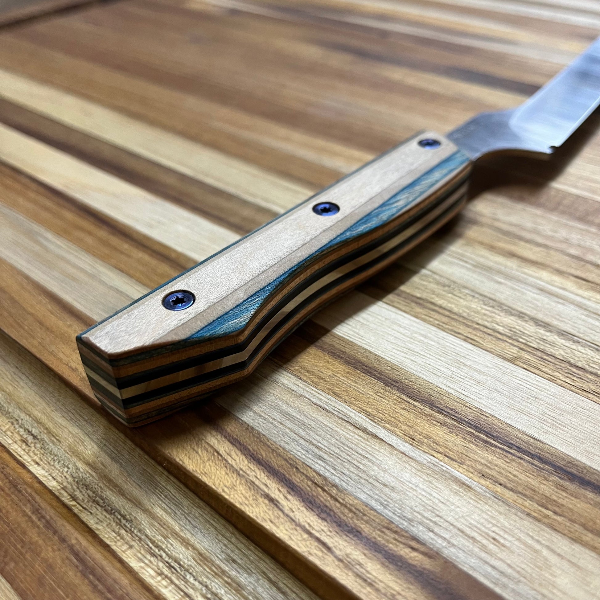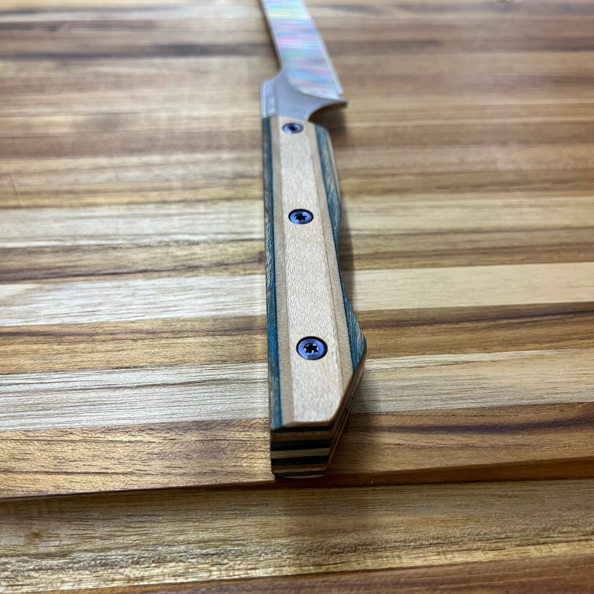 Expertly crafted using top-of-the-line MagnaCut stainless steel, this 8" Fillet Knife incorporates a unique skateboard deck handle for a rugged and distinctive aesthetic. With black liners along the tang for added stability, this knife is perfect for chefs at any level, offering unparalleled performance and durability. Whether for a busy work day or occasional home use, this semi-custom knife is a must-have tool that requires low maintenance and delivers long-lasting results.