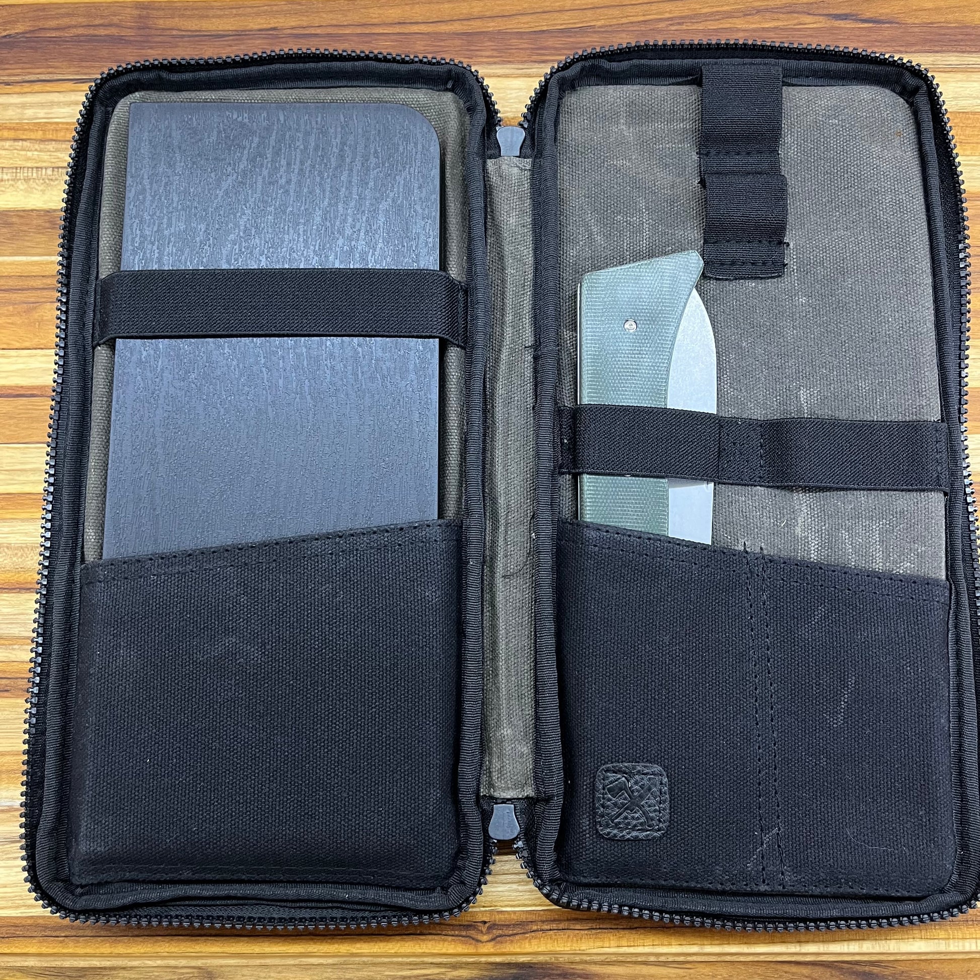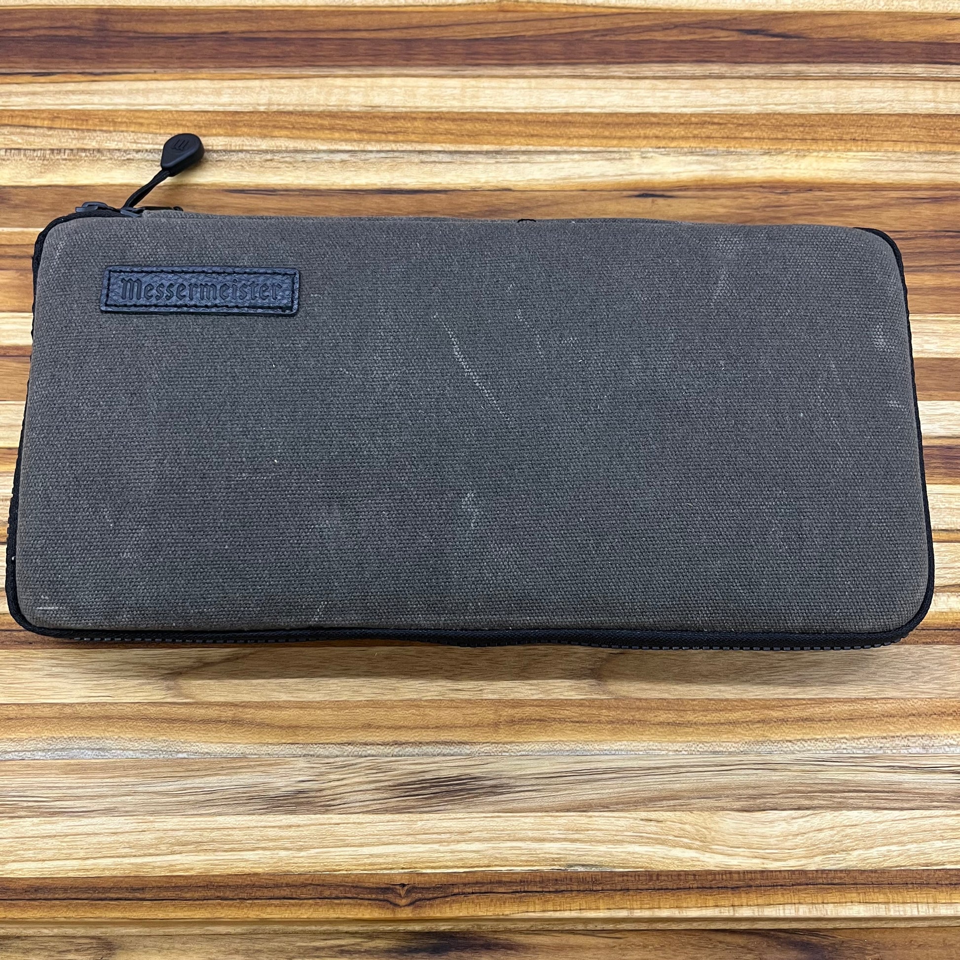 The Messermeister Adventure Chef Linen 3 Piece Set comes with a classic stainless blade and distressed linen handles, as well as a denim blue waxed canvas case to hold the included Folding 6" Chef's Knife and TPE faux wood cutting board. The knife features a liner lock system and a 15° cutting edge, while the cutting board is incredibly durable and heat resistant. The waxed canvas case also has pockets for additional items, such as a folding fillet knife and folding peeler/paring knife, making it a versatile and essential set for any passionate cook looking to express themselves in an outdoor setting!