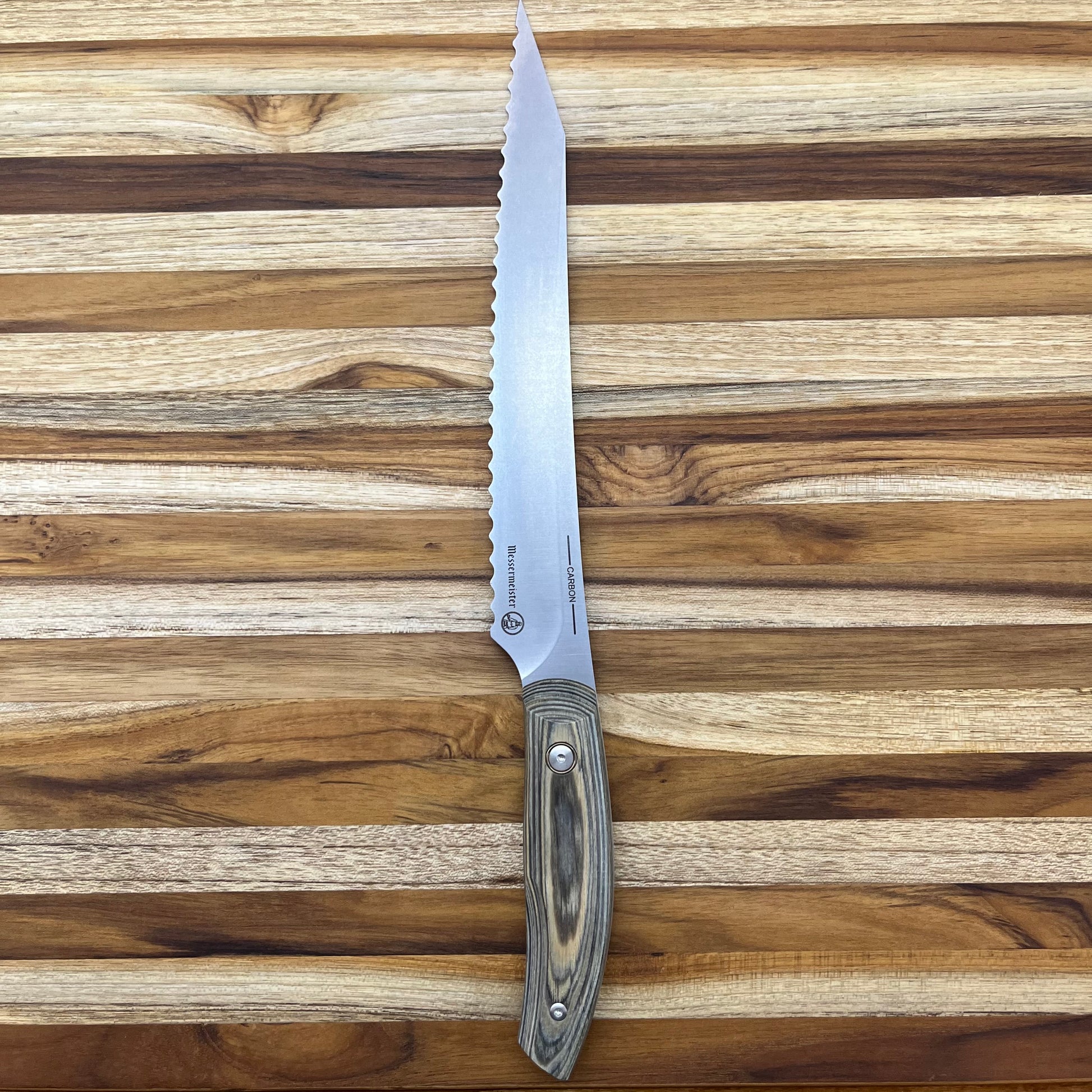 The Carbon 9" Bread Knife has a subtle offset to keep your hands off the cutting board and in control. The edge has a toothed serration that is ideal for piercing tough crusty bread or pineapple skin. Razor sharp curved teeth gently slice through delicate meat without tearing.