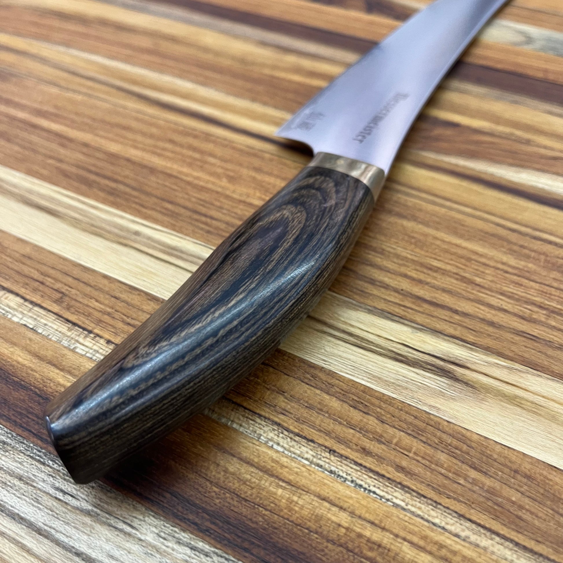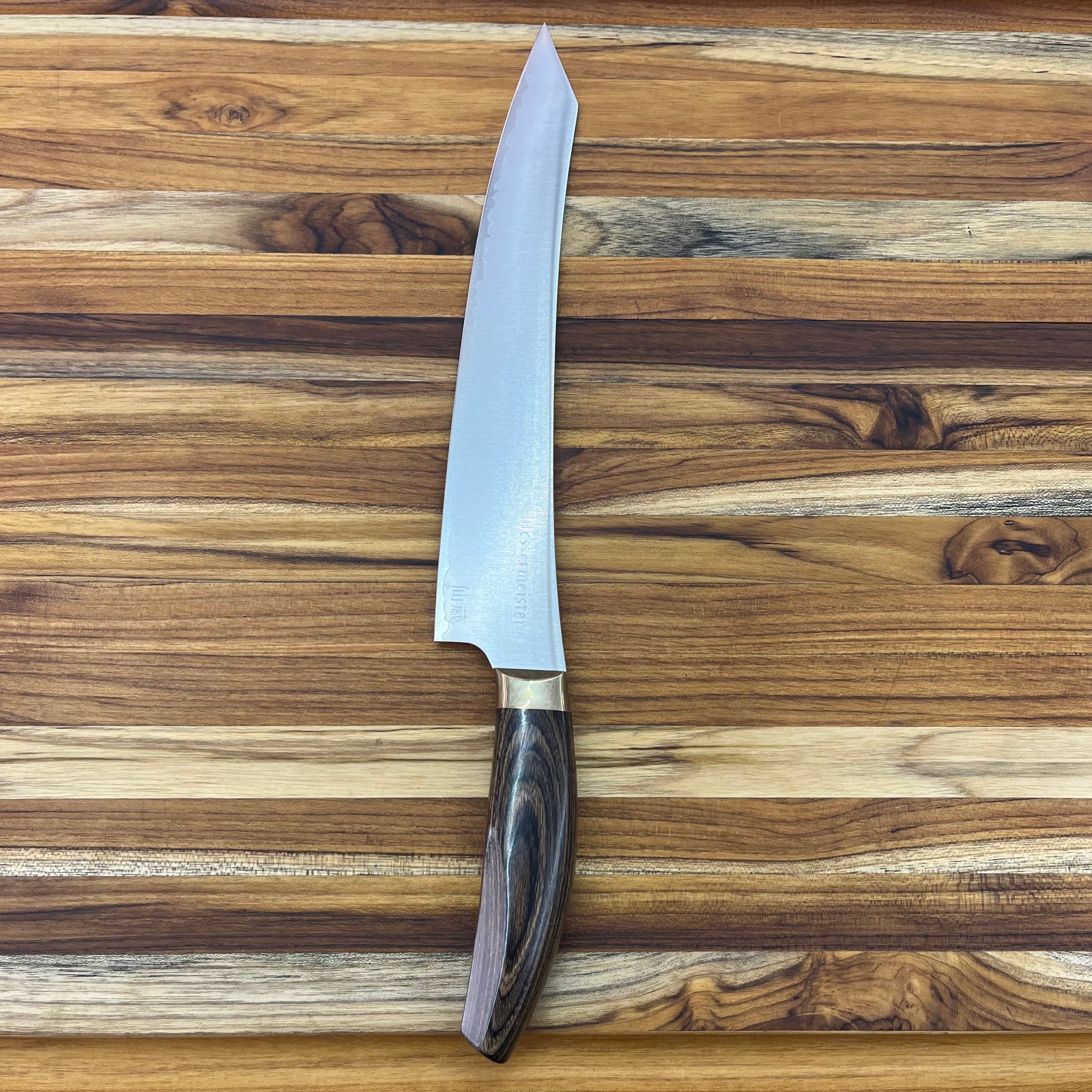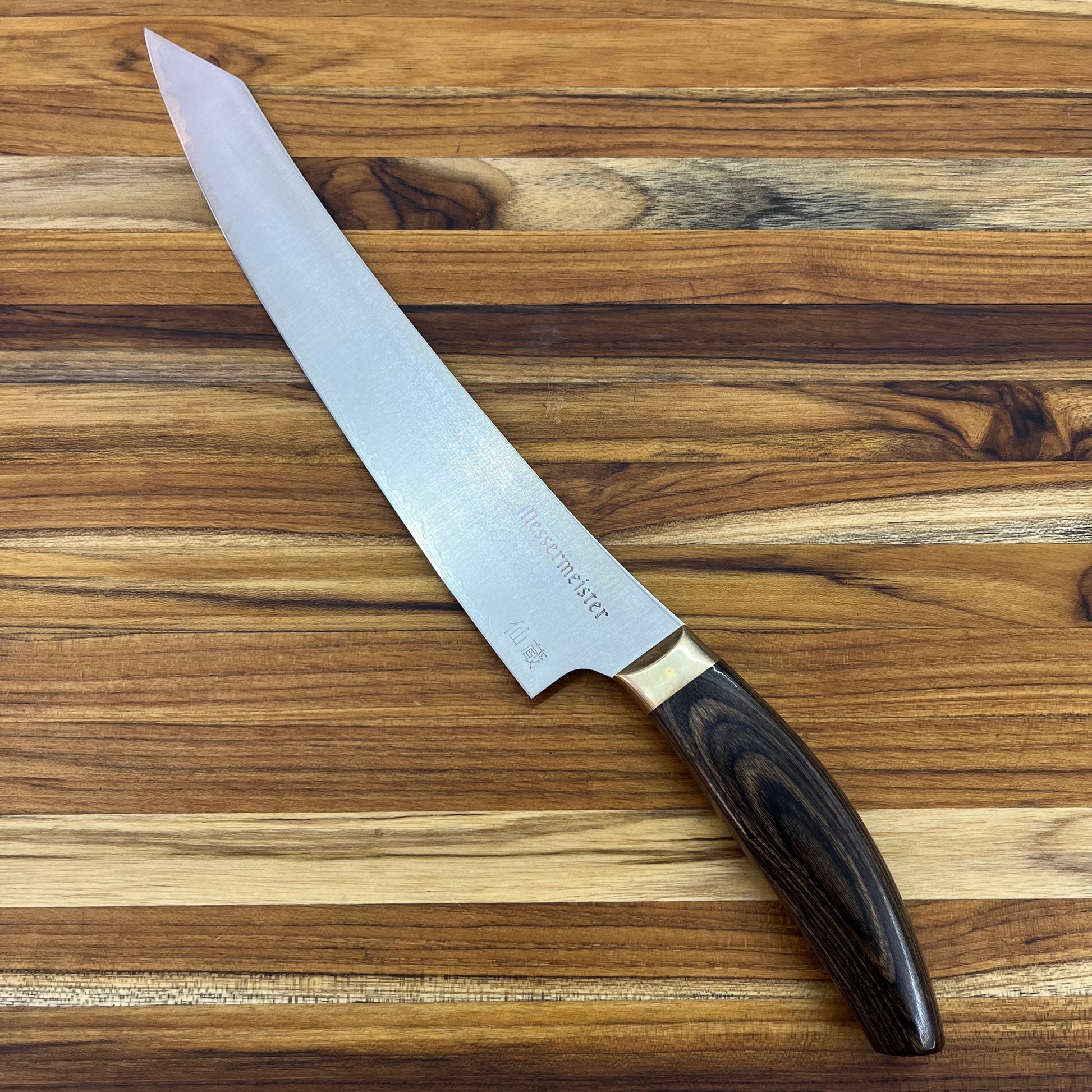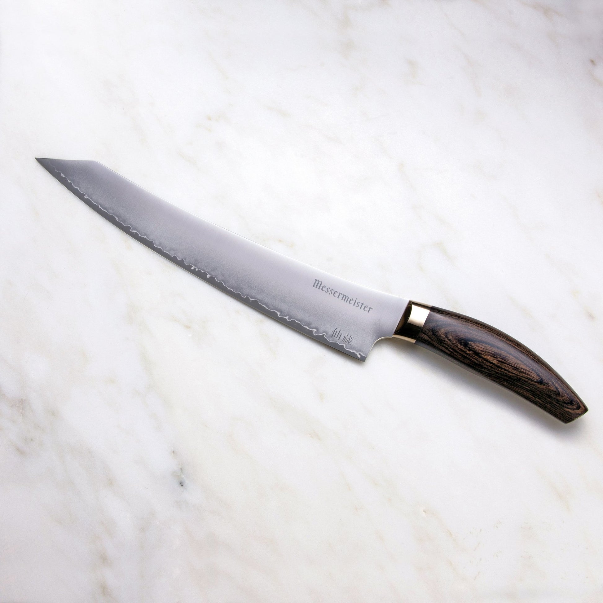 Crafted by 3rd generation knife artisans in the historical cutlery city of Seki, Japan, the Messermeister Kawashima 10” Slicing Knife, has a narrow spear-point (k-tip), fine-edge blade that is used for medium to large carving chores. It separates meat from the bone and slices it into thin serving portions.