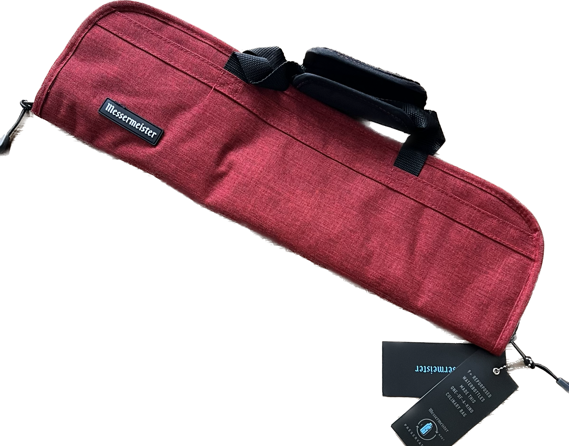 The Messermeister Preservation Collection is the first knife luggage with woven fabric made from 100% recycled water bottles. The new material has a luxurious soft feel and heavier weight, but is priced the same as the best-selling polyester bags. The aim is to eventually replace all Messermeister staple 600D polyester bags with the highly durable recycled water bottle fabrics. 9 recycled water bottles were used to create a 5 Pocket Bag. Shoulder strap included.
