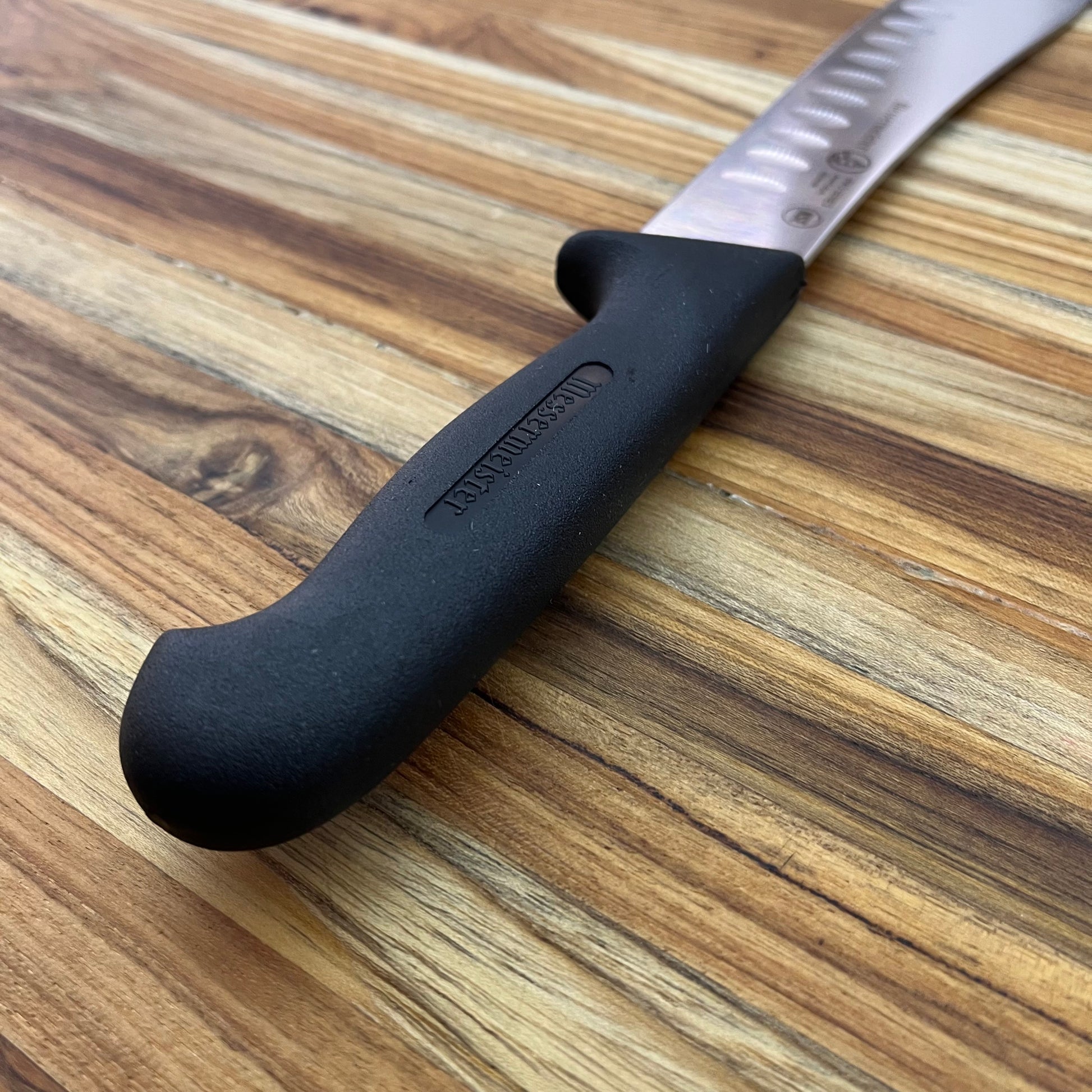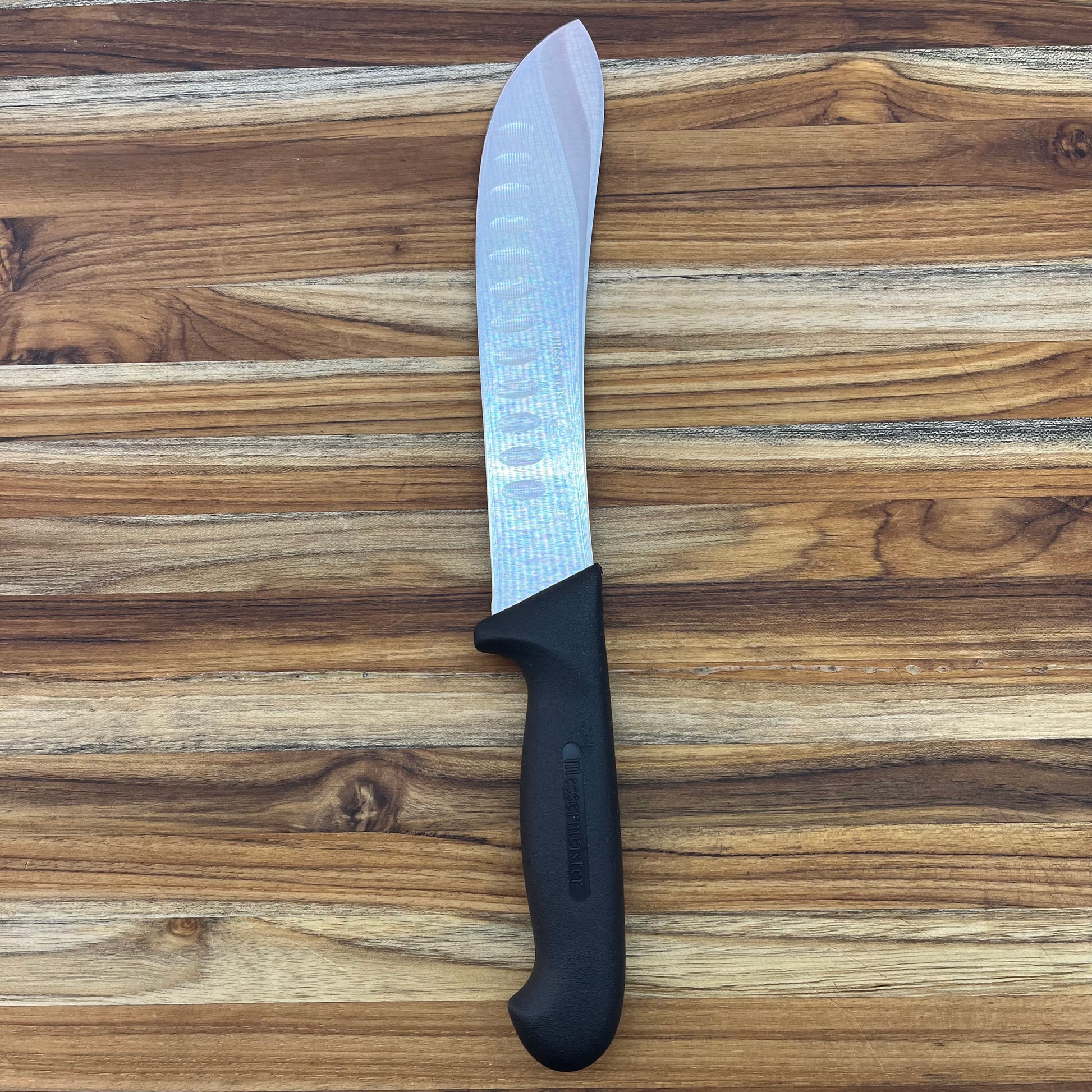 The Messermeister Pro Series 8" butcher's knife is crafted for chefs, butchers, and avid deep-sea anglers. Featuring a sturdy stamped blade and an ergonomic, non-slip handle, it ensures accurate, effortless slicing. Its alternating hollow-ground ovals on both sides minimize friction and resist sticking, making it ideal for efficiently breaking down retail cuts.