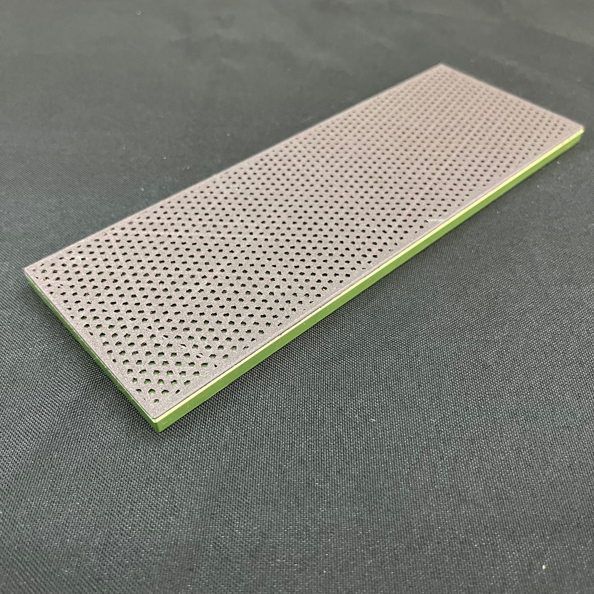 This honeycomb matrix is an original design by Hap Stanley. He makes each one of these stones in his workshop. Hap's resin is much softer than anything else on the market. This allows the surface to be maintained more easily. Typically, diamond resin stones are extremely hard to flatten. Hap has overcome this problem by creating a completely new material. This binder is environmentally friendly, slightly hydrophilic, and very tough. Sharpening can be done completely dry or with a few drops of water. Flattening can be accomplished with our chevron Style lapping plate (NL-4). Remember, when flattening a diamond resin stone, you are not flattening the diamonds in the resin. Rather, you are "Kicking" the diamonds out of the resin. So, you need a very tough lapping plate.