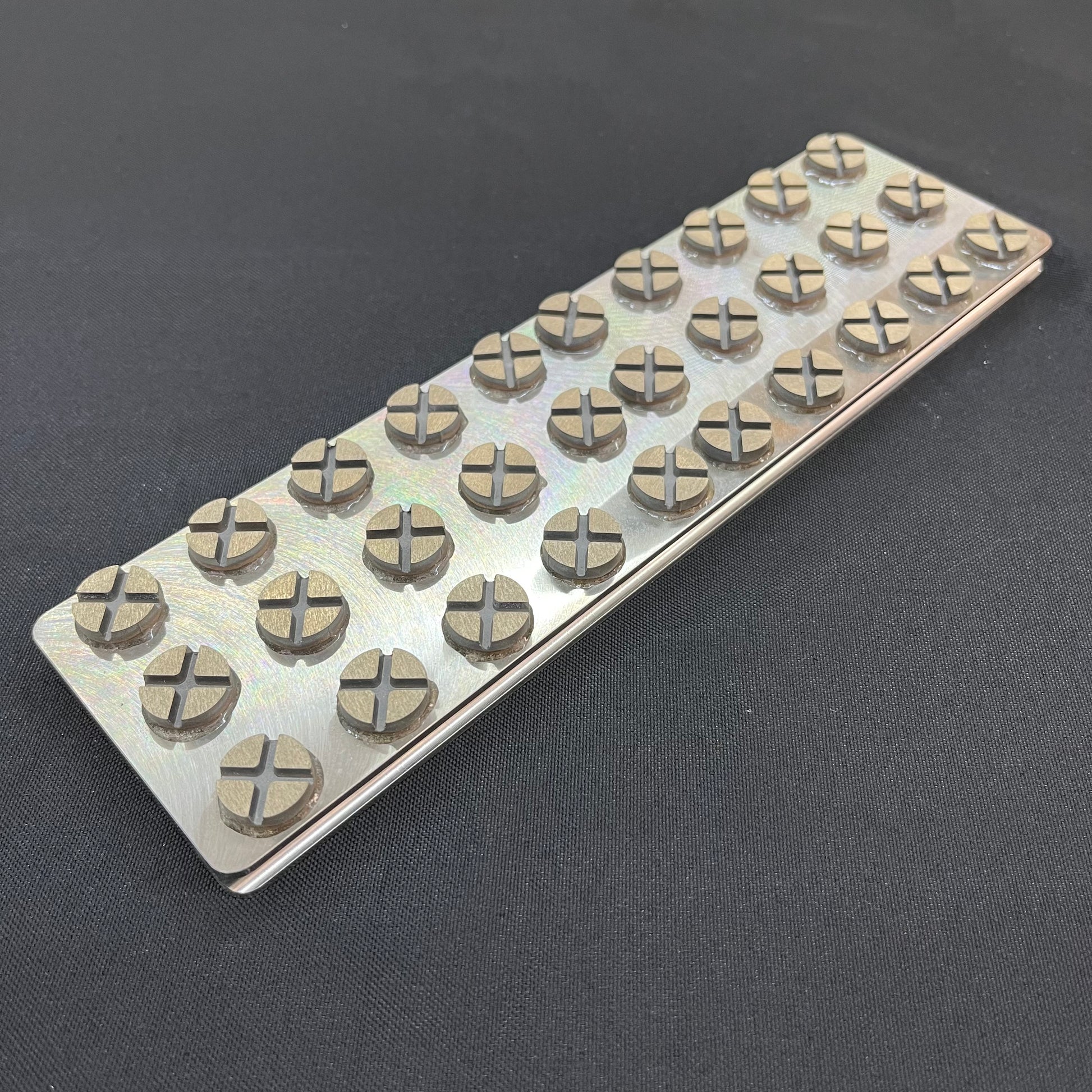 Diamonds are dispersed evenly throughout the metal button matrix. This design is extraordinarily tough. The buttons have been set in stainless steel weighs to ensure structural integrity. These buttons are extraordinarily durable. The button plate is an amazing surface leveling tool. Its weight is integral to its smooth lapping action.