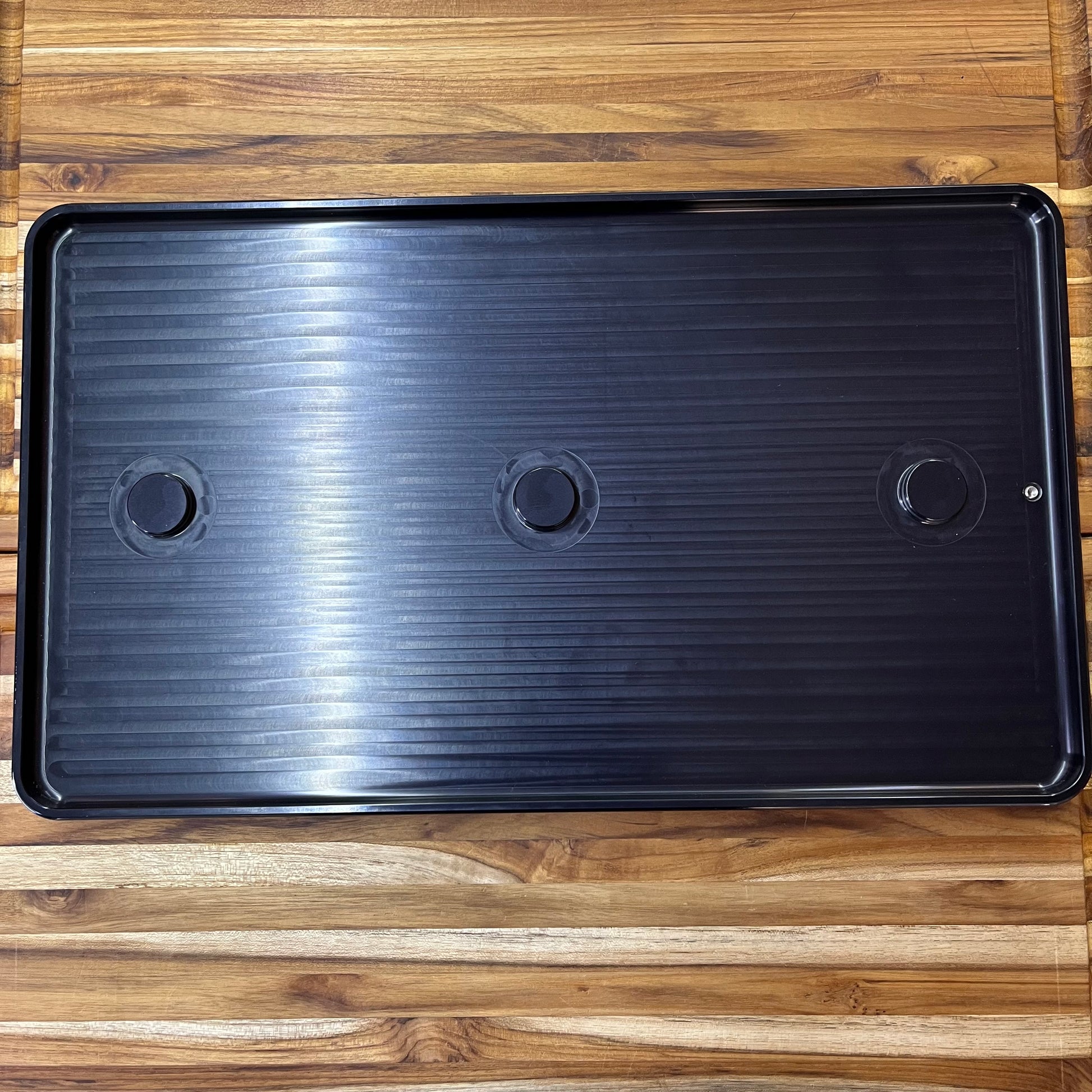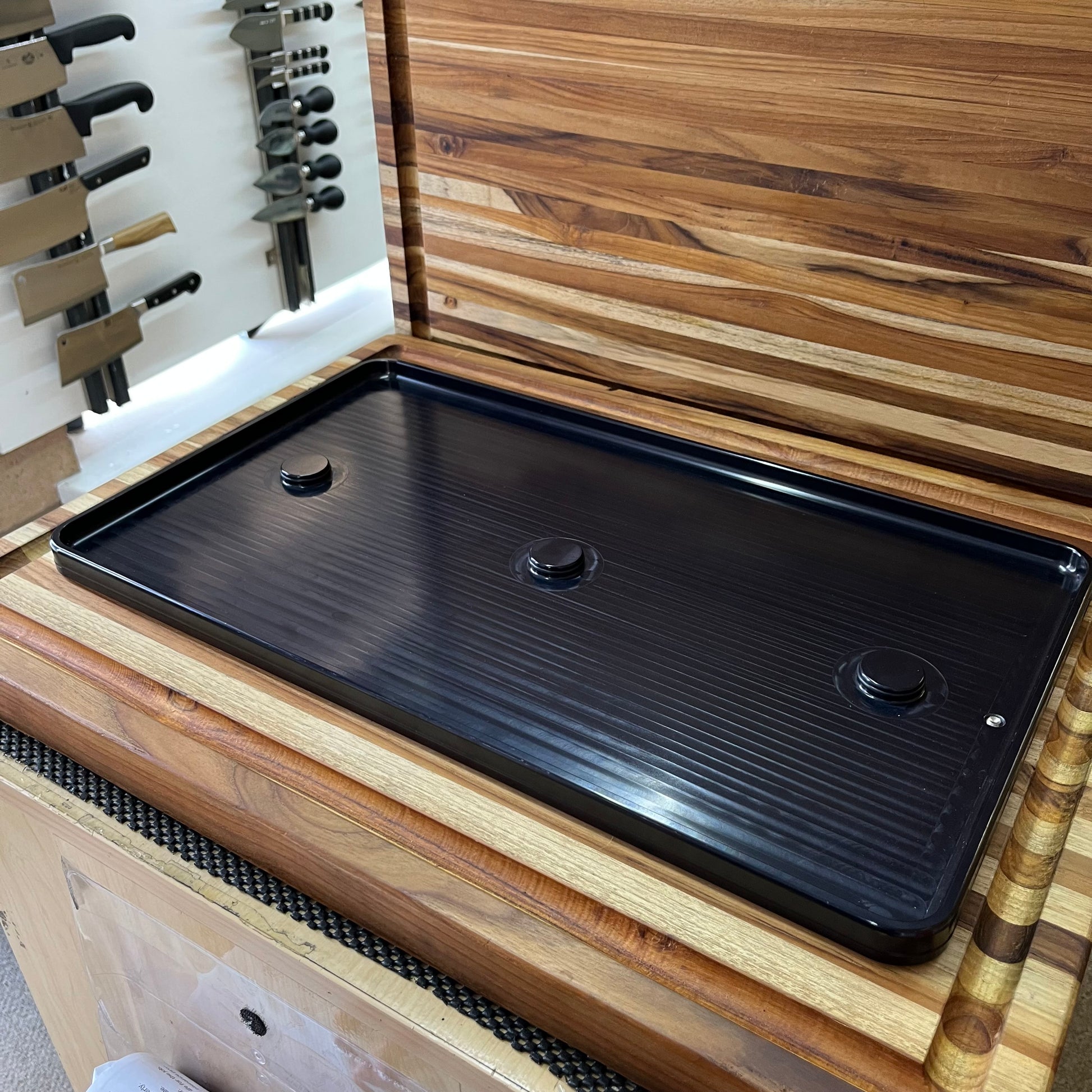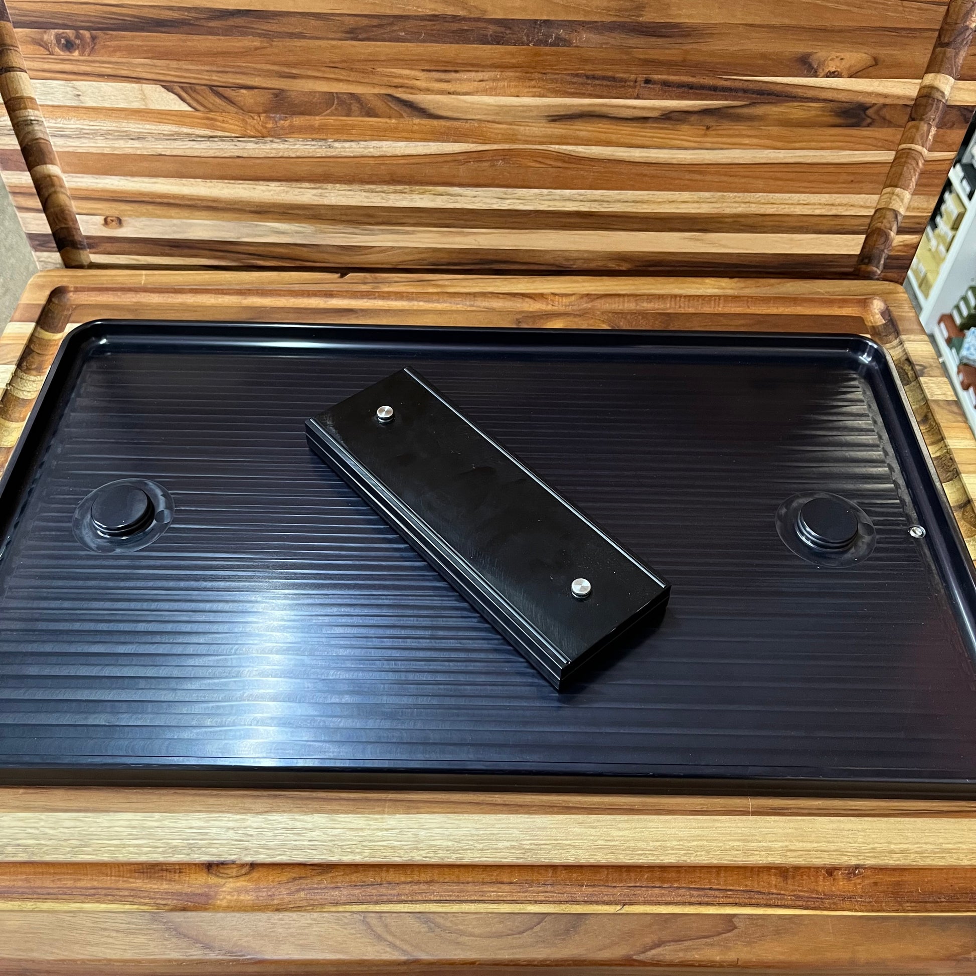 This is Nano Hone's largest sharpening pond measuring 20" x 12". Three posts secure 3 Stone Stages onto the pond to work multiple grit surfaces without moving anything.