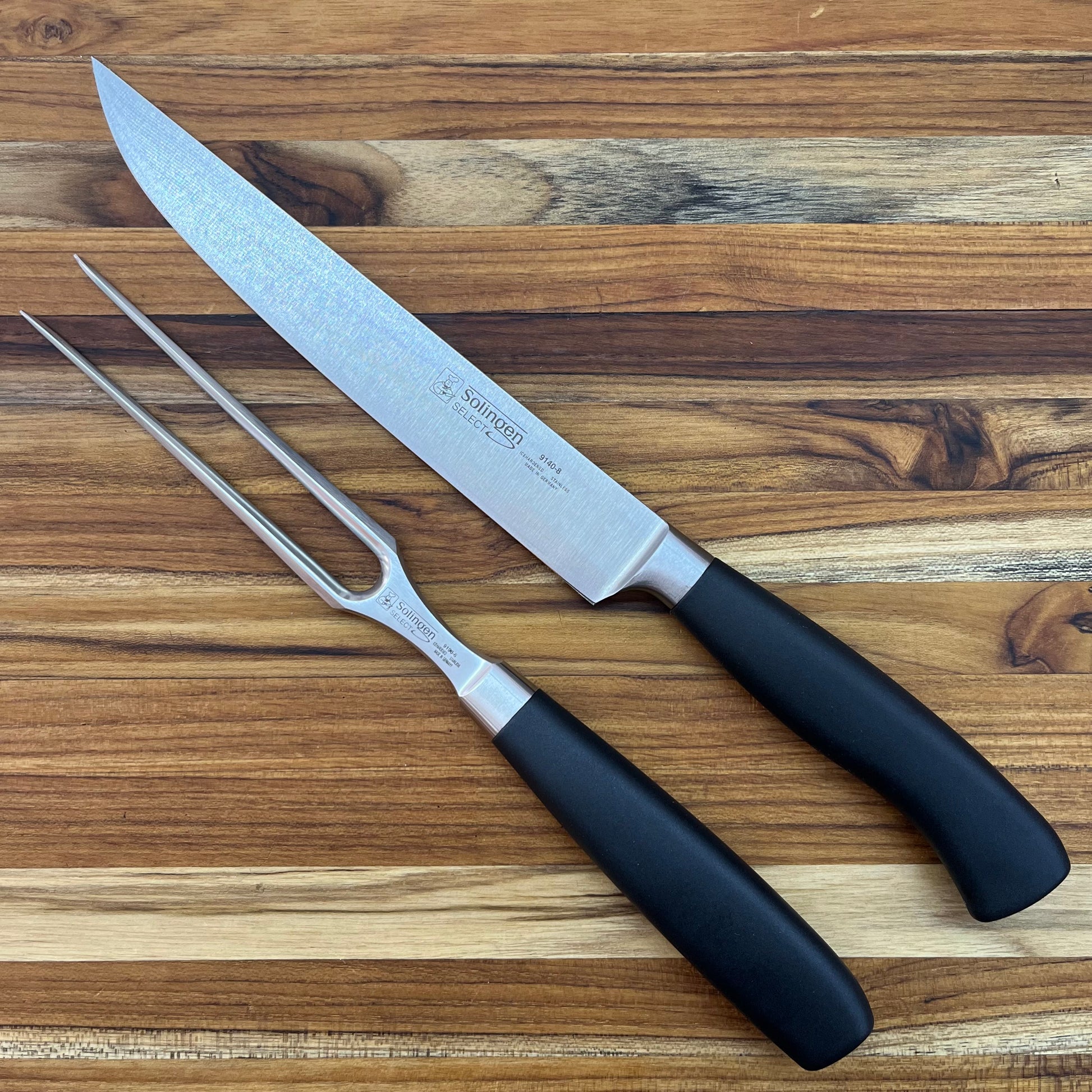 Elevate your carving technique with this German-engineered duo from PEC Solingen Select. The 8" Euro Slicer features a distinctive upturned tip that guides your blade through meat with precision, while the stainless steel stabilizing fork secures your protein with unwavering stability. Forged in Solingen's renowned steel tradition, the blade maintains its edge through repeated honing and delivers the responsiveness serious cooks demand. Thoughtfully designed handles provide the control and confidence needed for flawless slicing, whether you're a seasoned professional or dedicated home enthusiast.