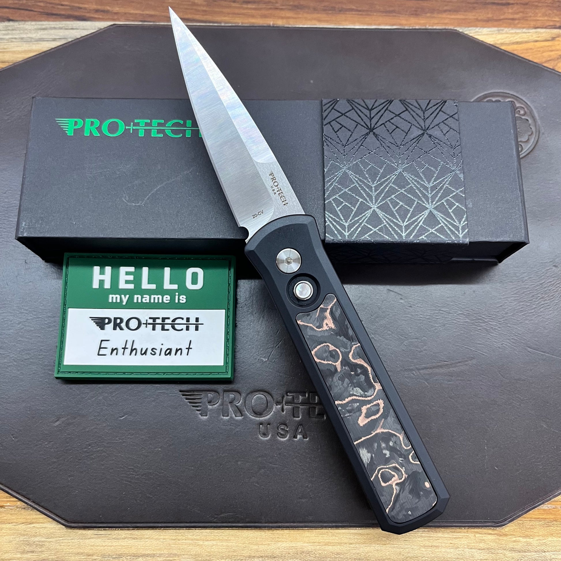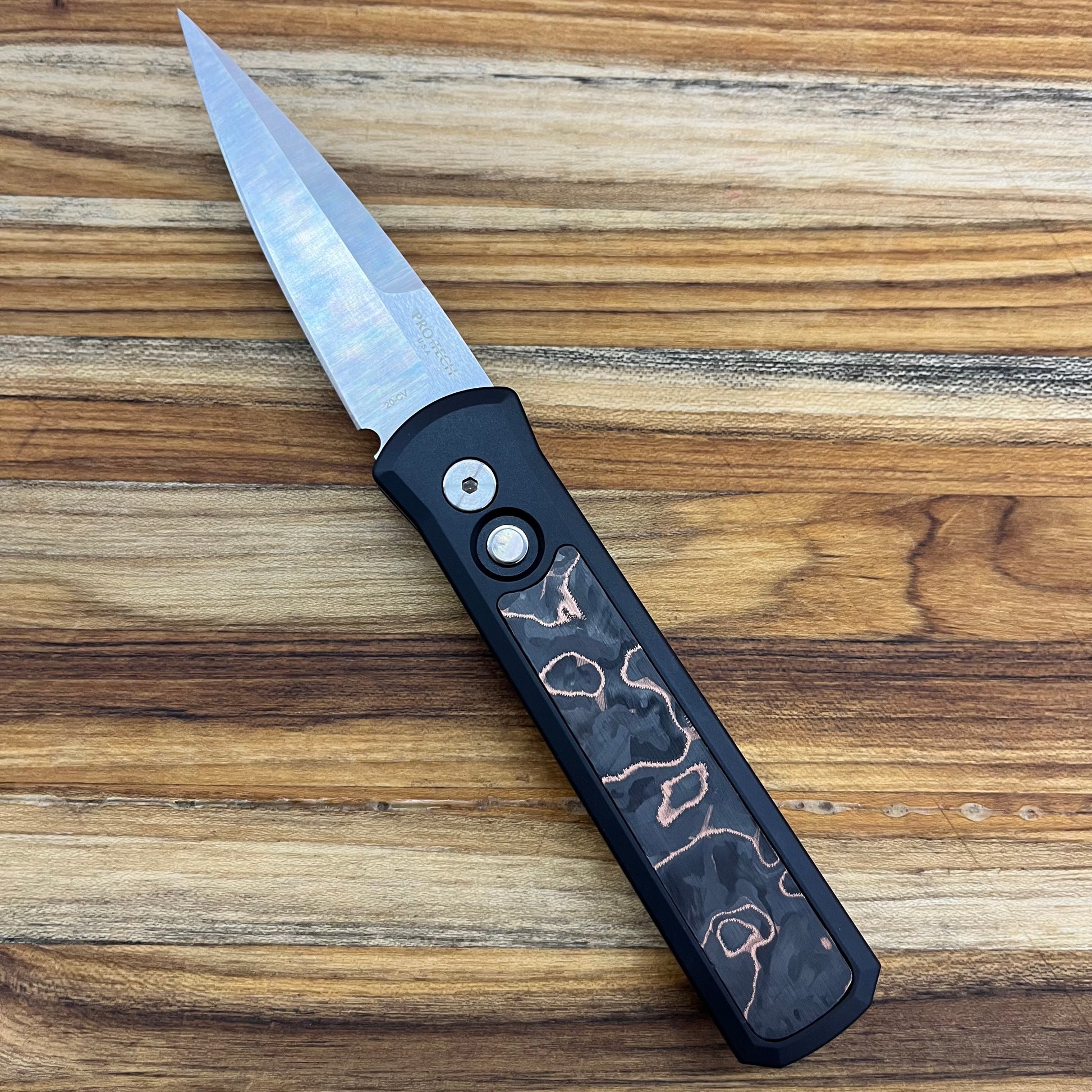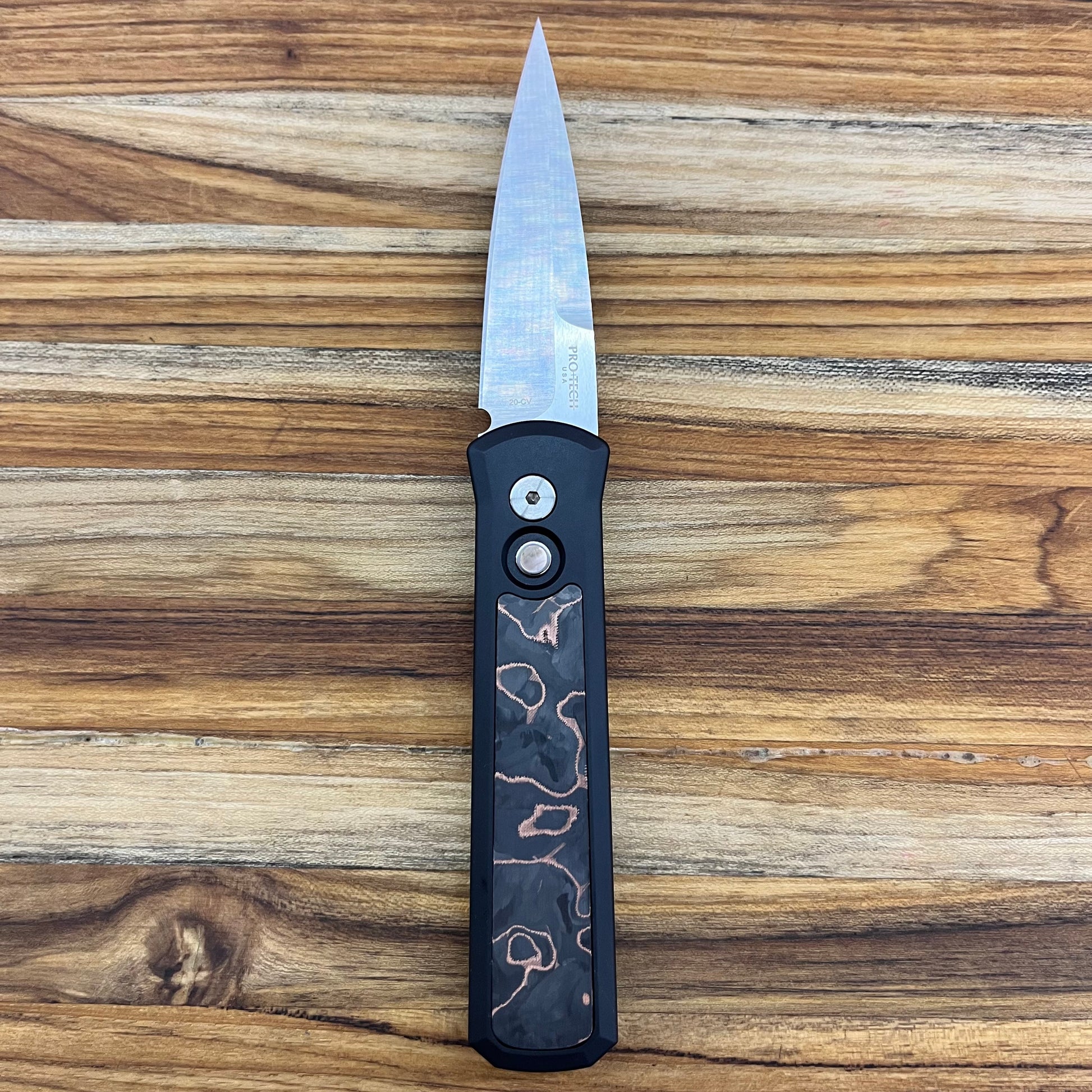 Pro-Tech Godson 3.15" Auto w/ Livewire Copper Carbon Fiber Inlay on Black Aluminum & Black Lip Pearl Button
