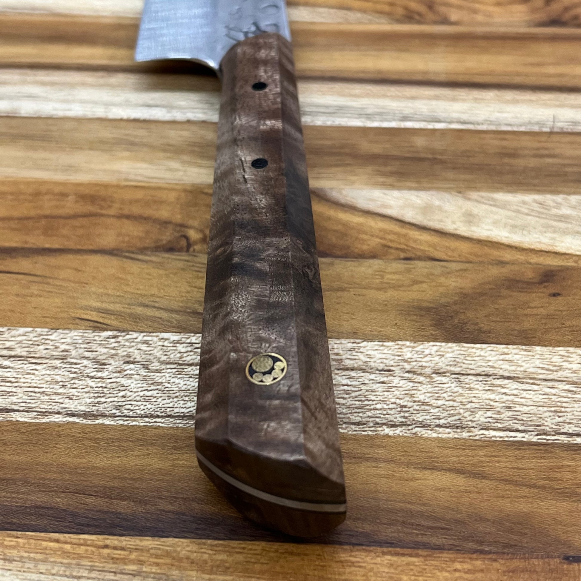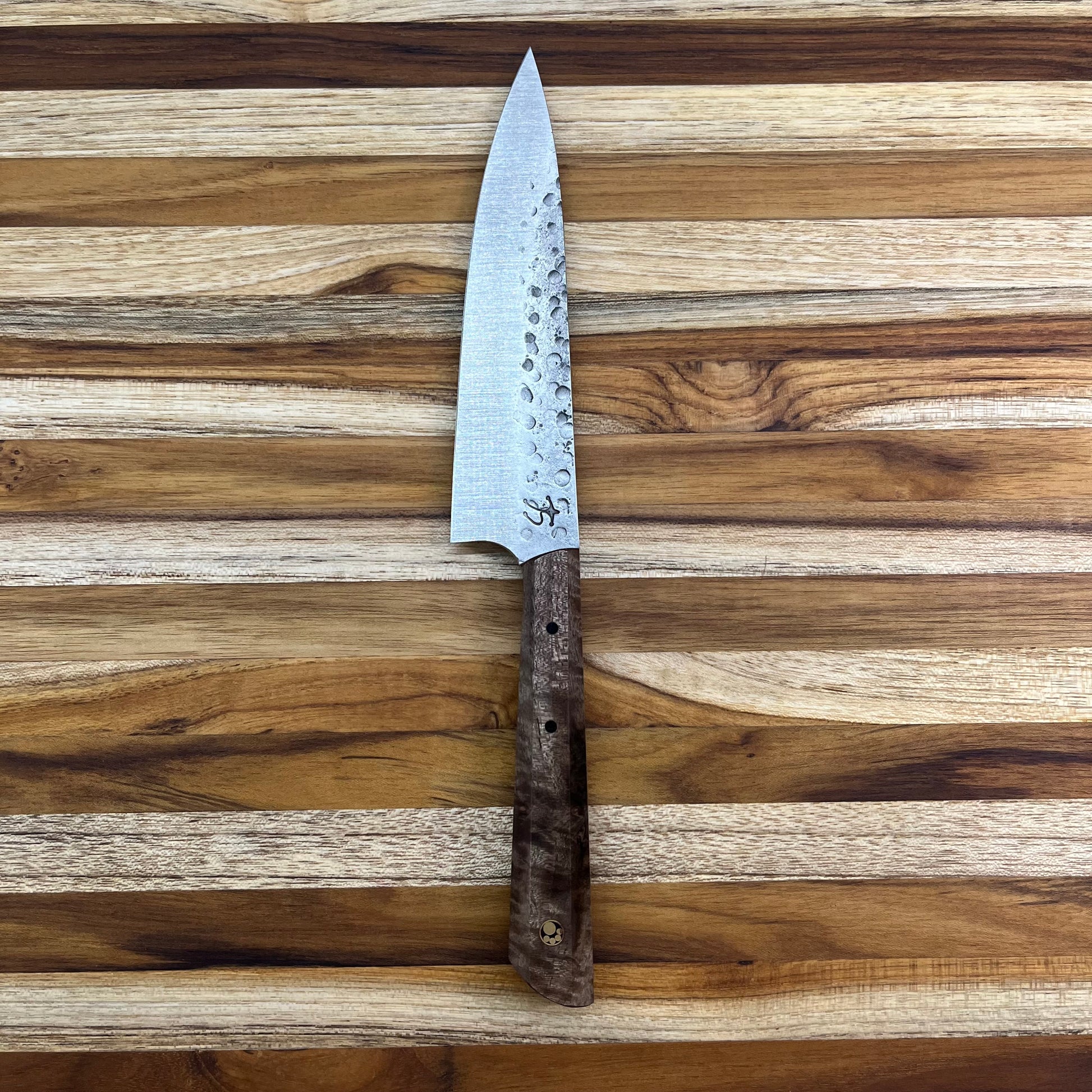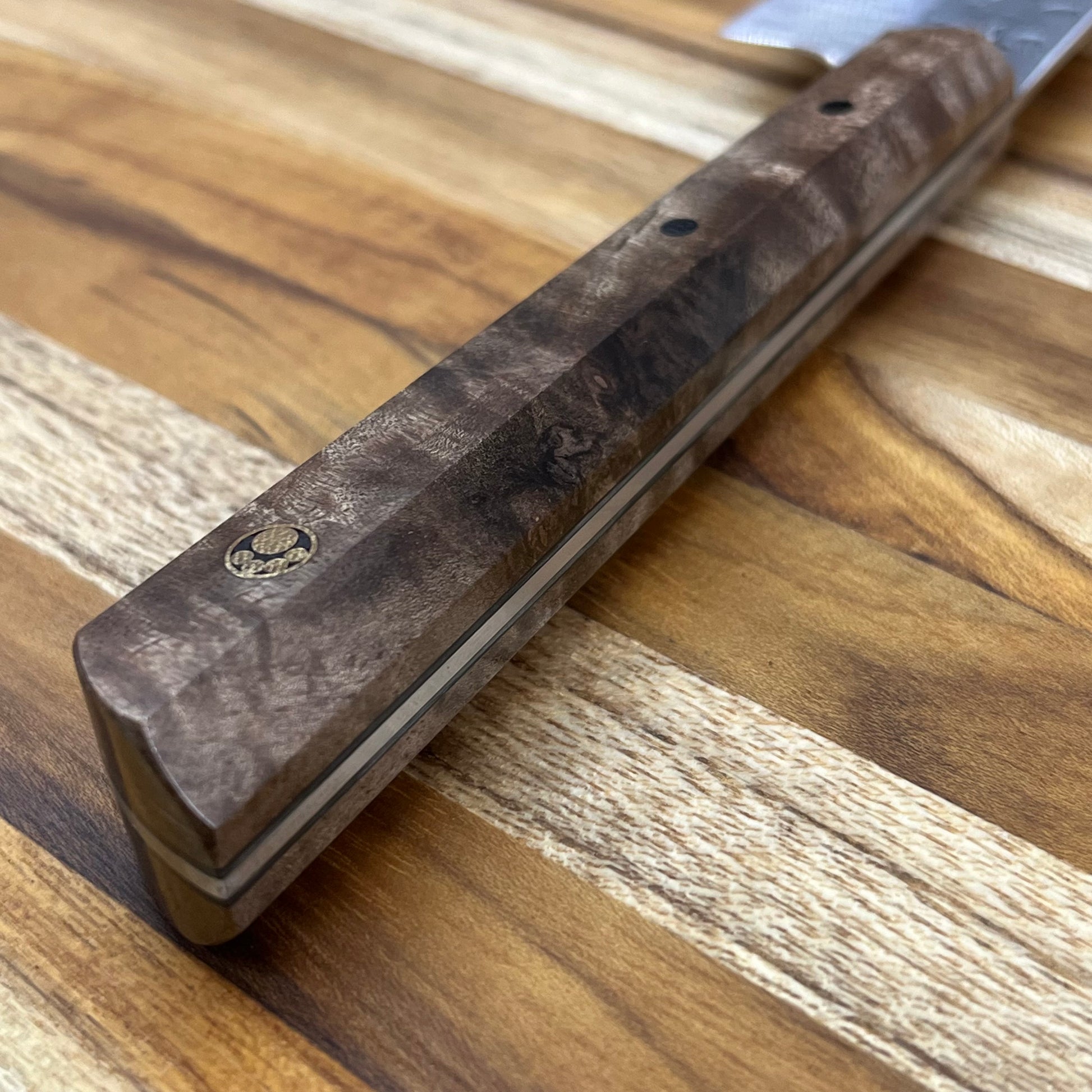 Each petty is distinct in its aesthetic. This brown maple burl handle is complimented with a beautiful golden mosaic inlay that resembles a paw print and is sure to astonish any knife lover. This exquisite tool offers precision and comfort for all your culinary needs. Beauty is in the eye, and hand, of the knife holder.