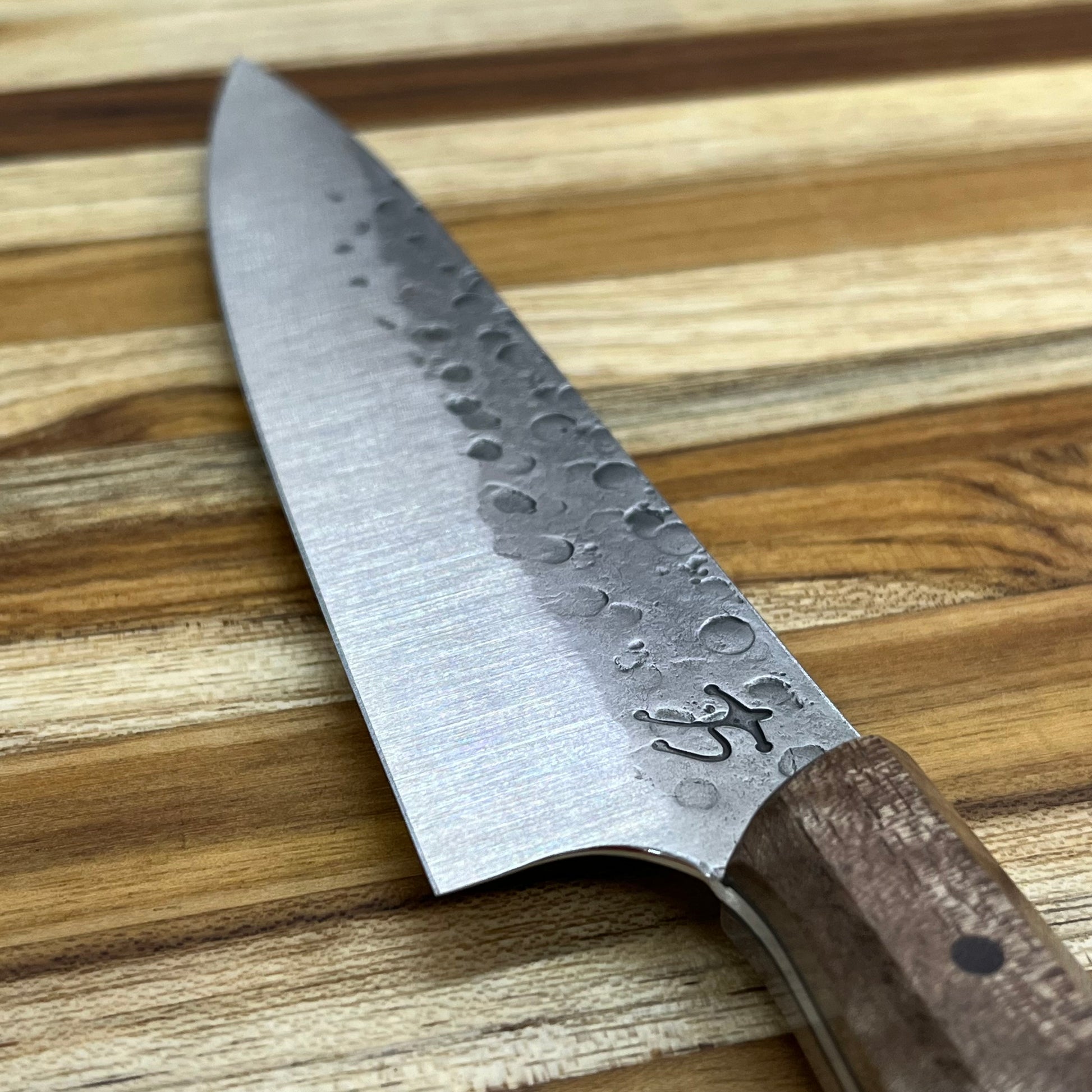 Experience the performance of Japanese-style cutlery from Running Man Forge. The Thin Forged Petty is a highly-desired custom knife, handcrafted in the USA. Due to its popular octagonal Wa handle and high-grade spicy white carbon steel & tsuchime (hammered) finish, these pieces will not sit for long.