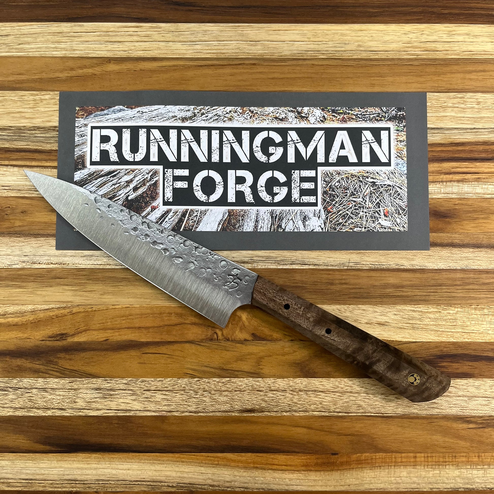 Running Man Forge Custom 150mm (6") Thin Forged Petty w/ Brown Maple Burl Handle & Gold Mosaic Inlay