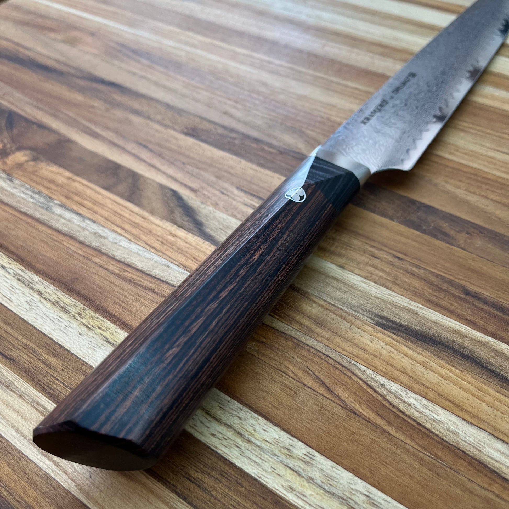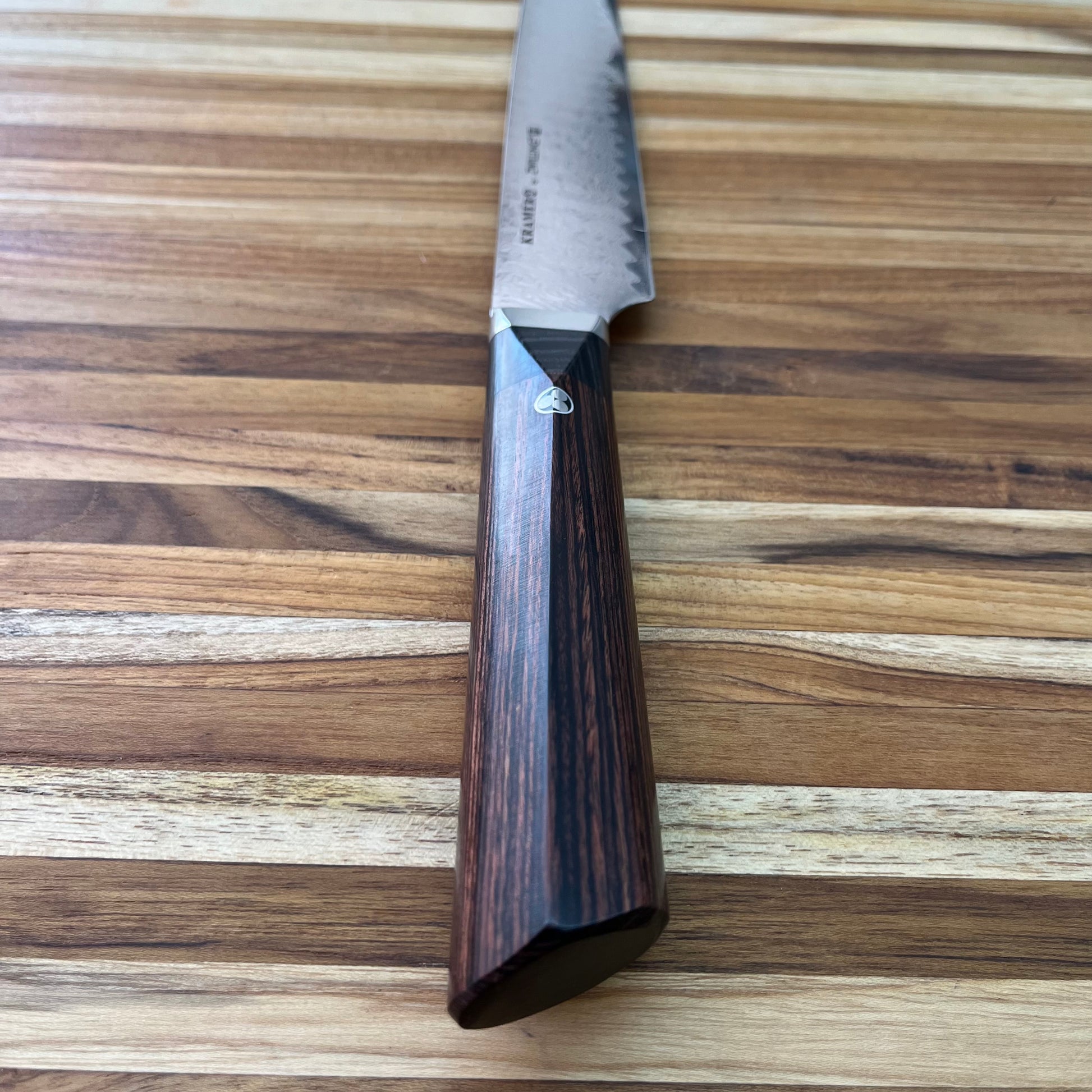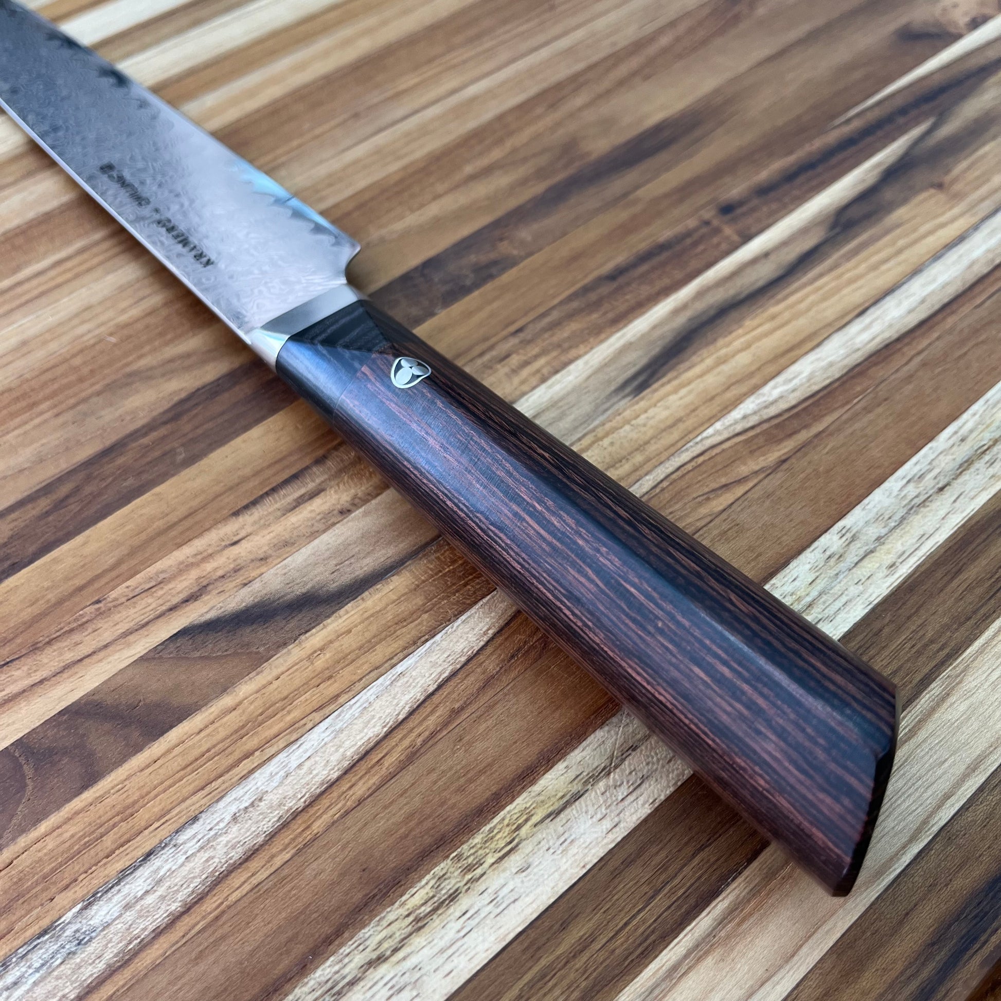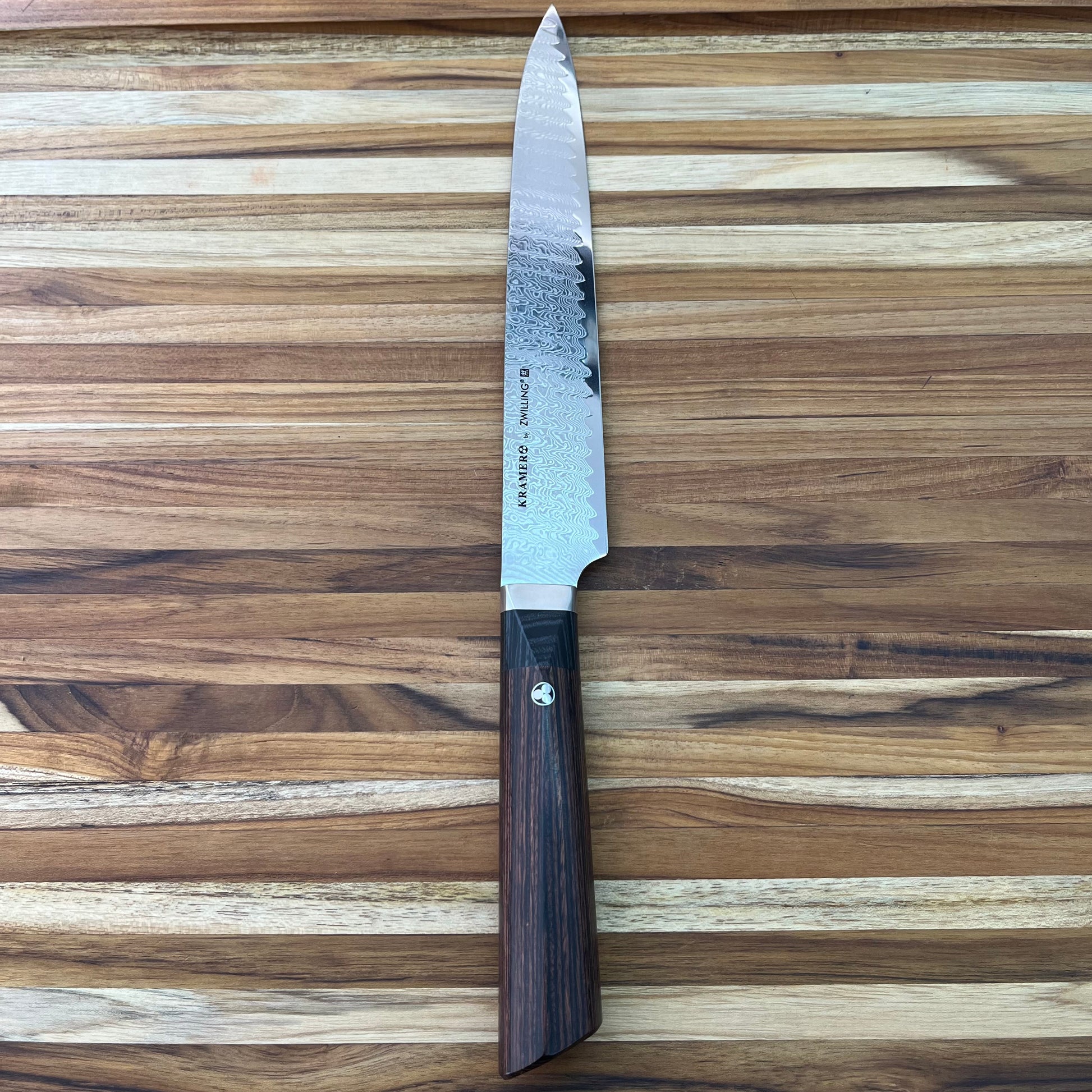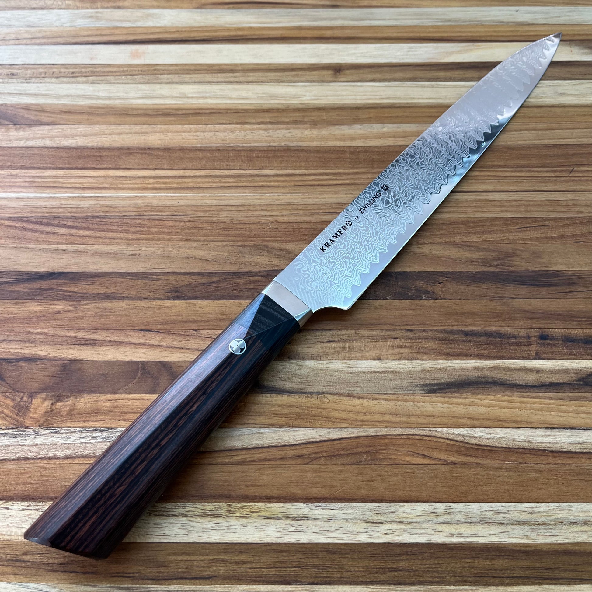 Utilizing unparalleled expertise, the combination of ZWILLING J.A. Henckels and Bob Kramer has resulted in the exceptional Kramer by ZWILLING Meiji knife series. This collaboration includes Kramer's distinctive etched ladder Damascus pattern, providing a durable exterior. Featuring a potent core of FC61 fine carbide stainless steel safeguarded by 100 layers of nickel and stainless steel, these knives are both durable and sharp. The charcoal Pakkawood handles boast a complex curvature designed to mirror the palm, ensuring a secure and comfortable grip. Adorned with a decorative center pin crafted by hand in Kramer's Washington workshop, these knives are not only exquisite to look at, but also built to last a lifetime. With 287 years of ZWILLING engineering prowess, 19 years of forging experience from Kramer, and 7 centuries of traditional Japanese craftsmanship, the Kramer by ZWILLING Meiji knives are truly unmatched in quality and longevity.